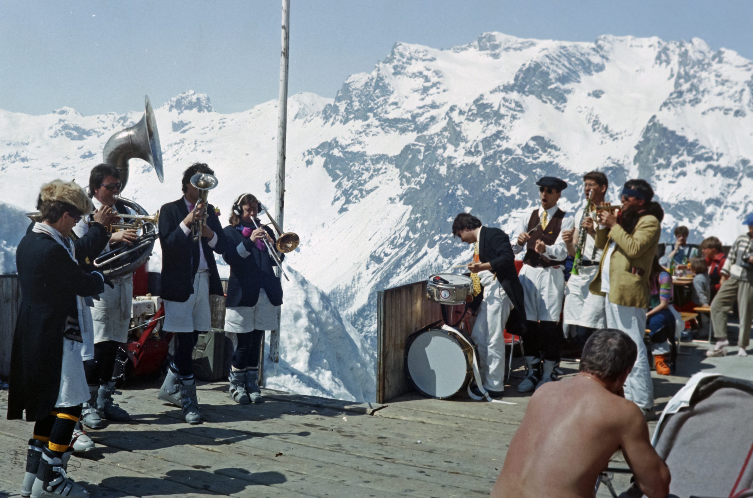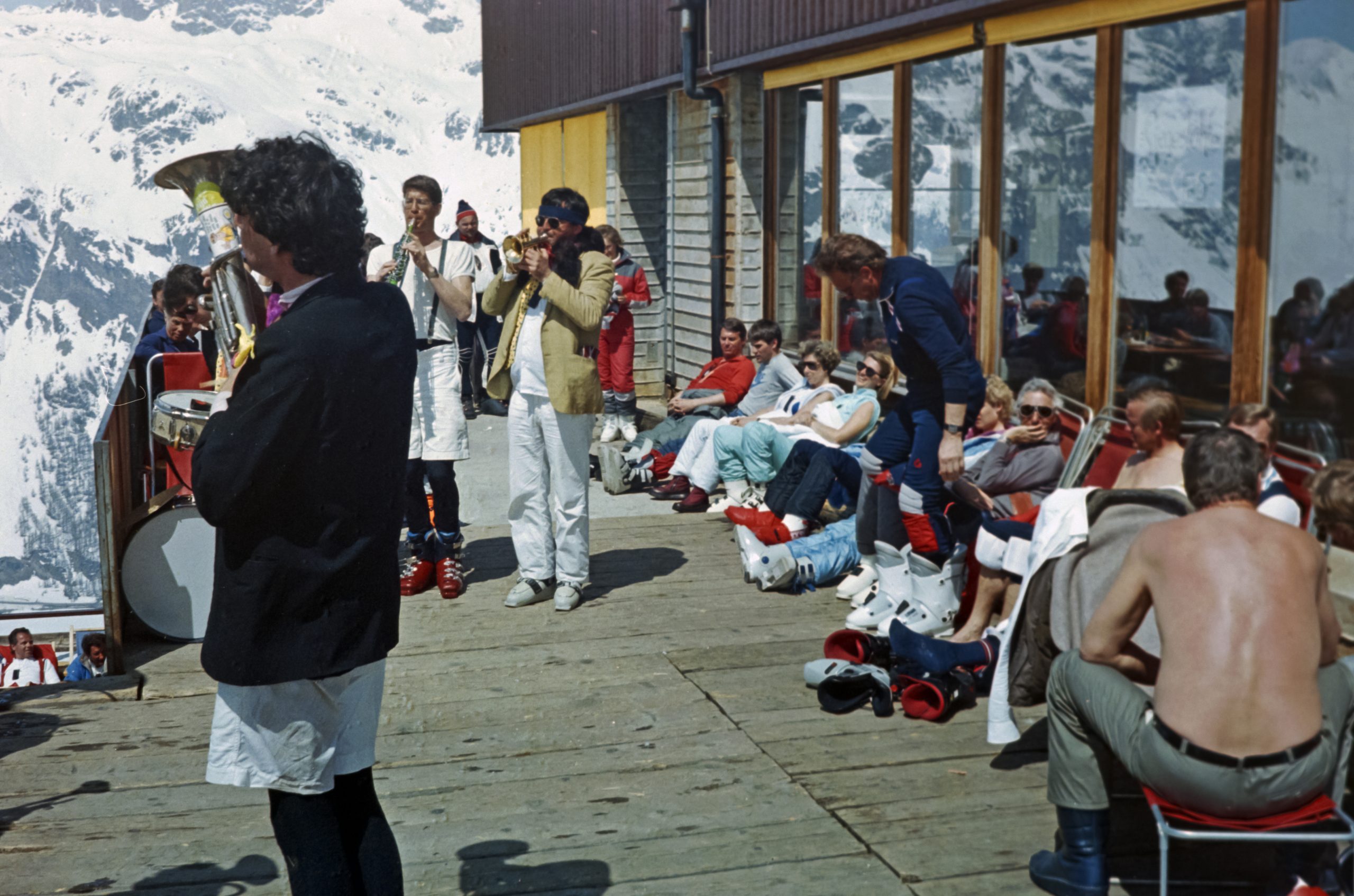 in Skistiefeln mit fetzigem Sound die Sonnenterrasse beglückt.