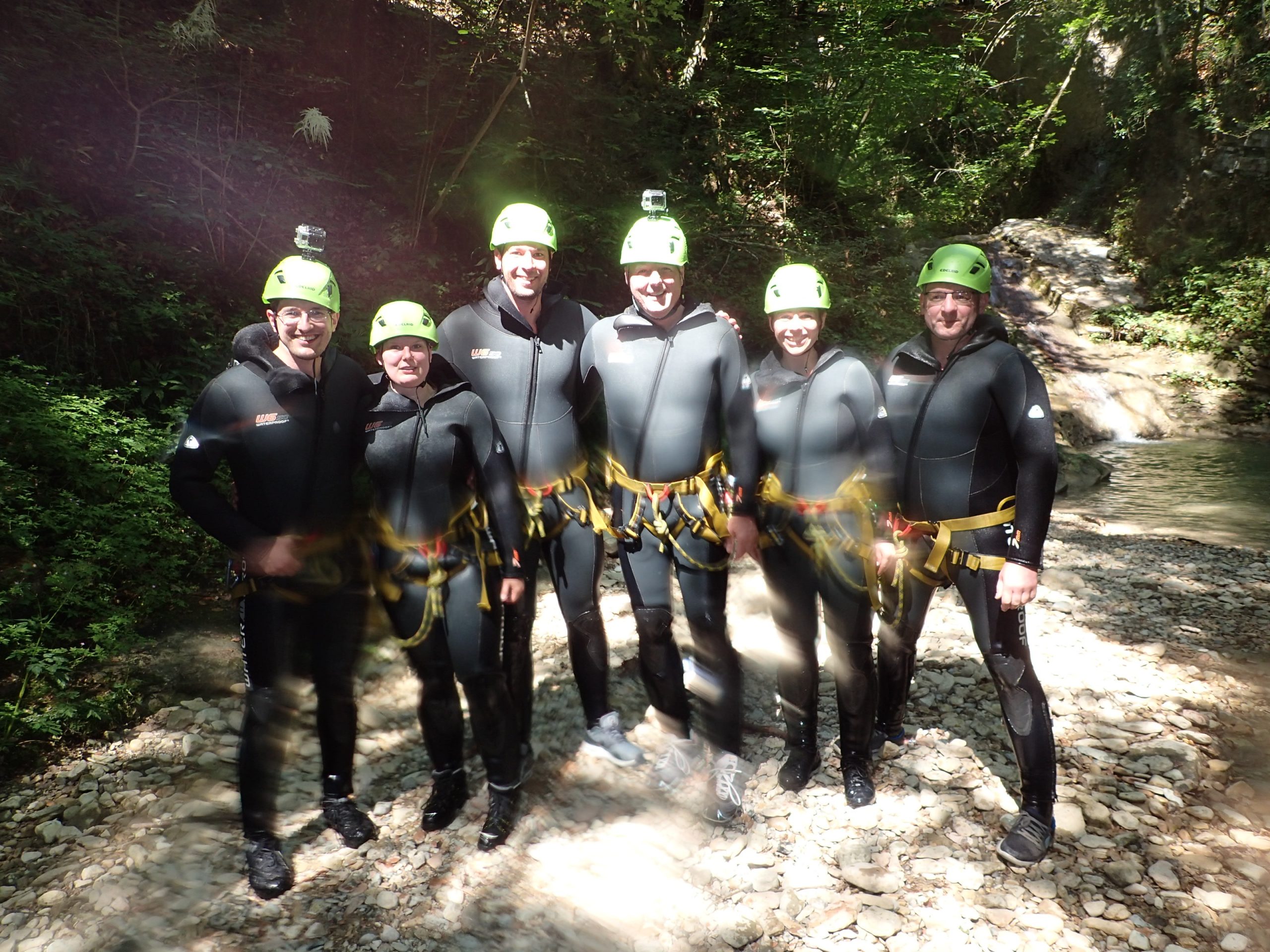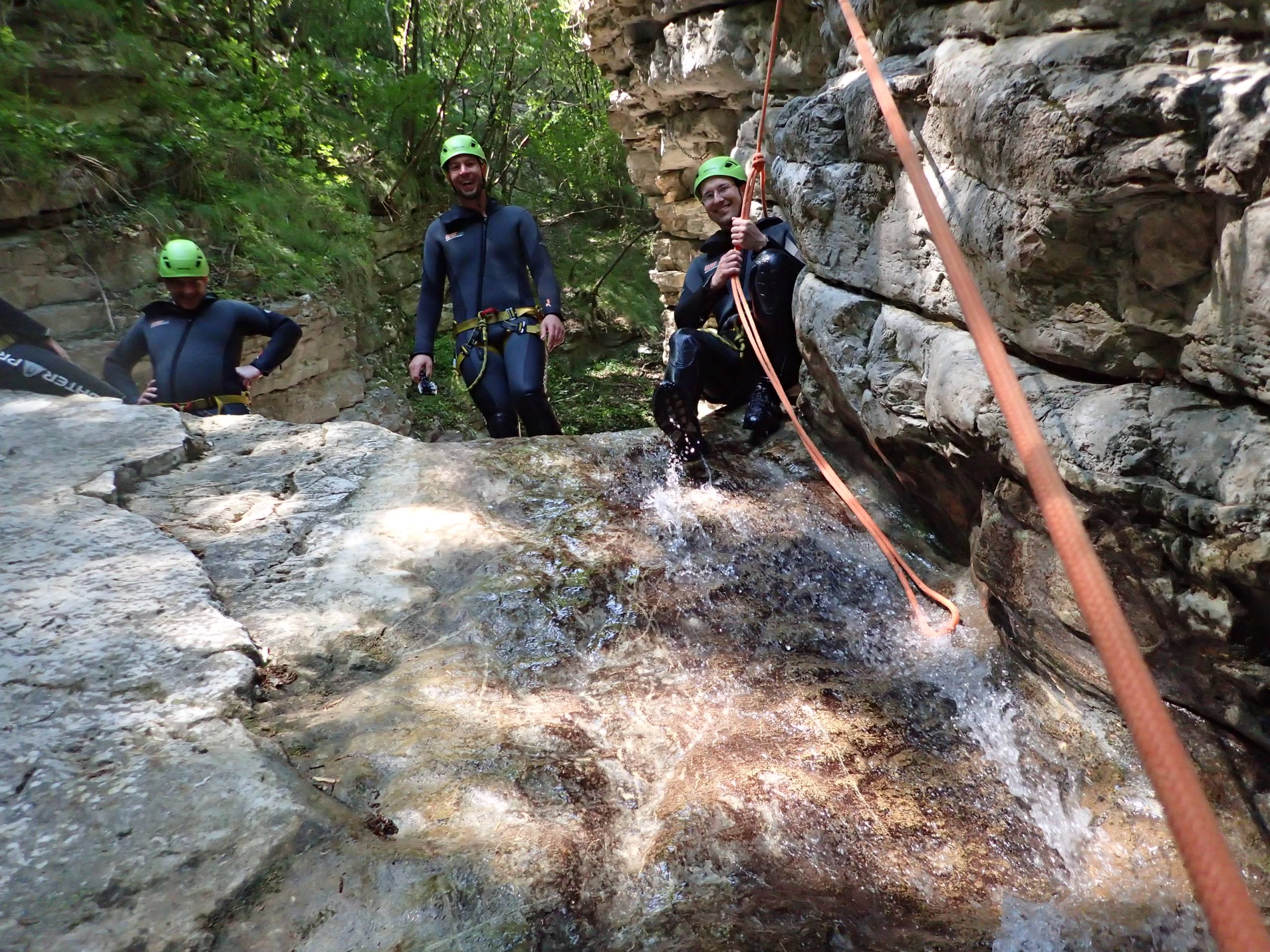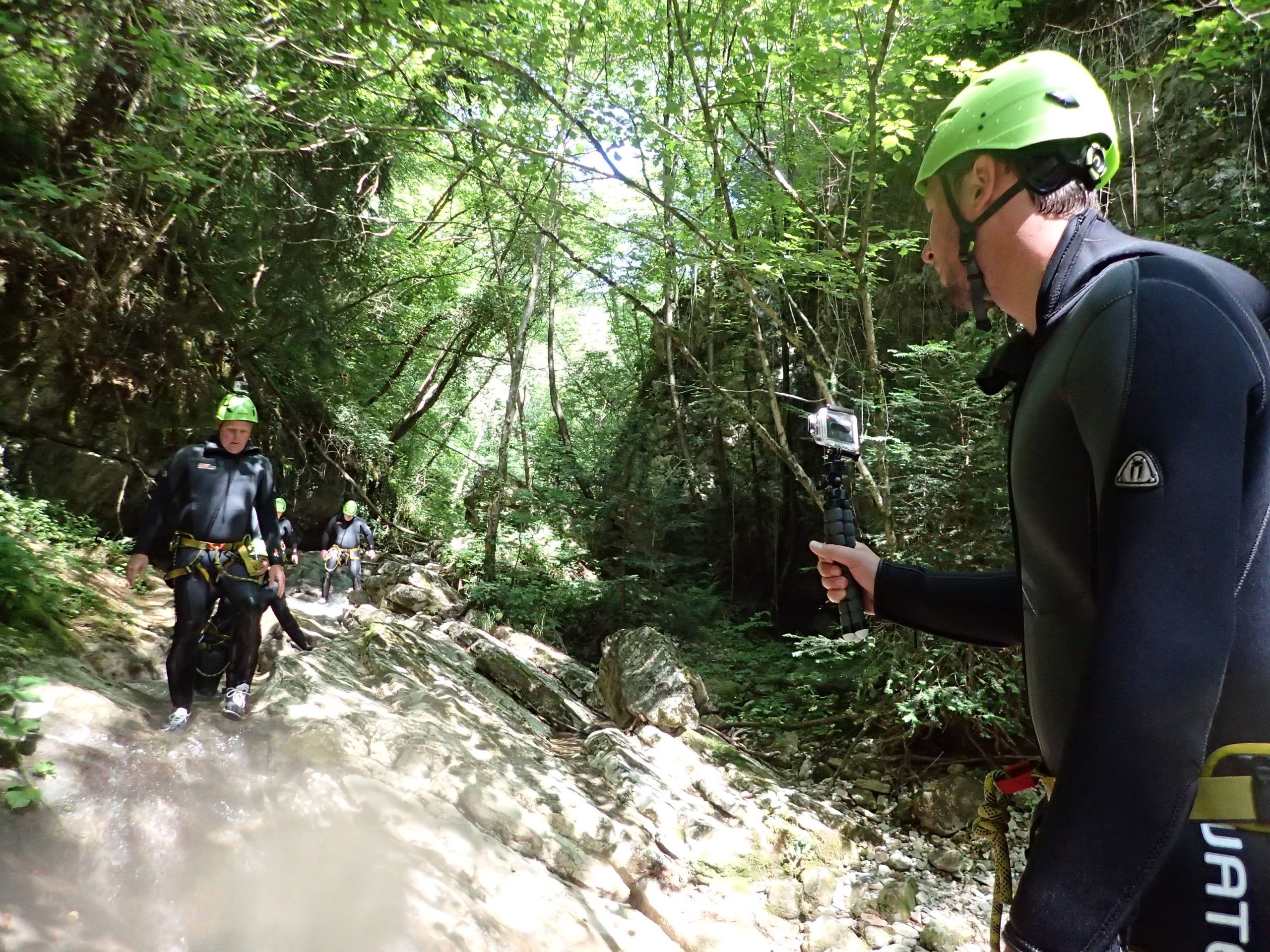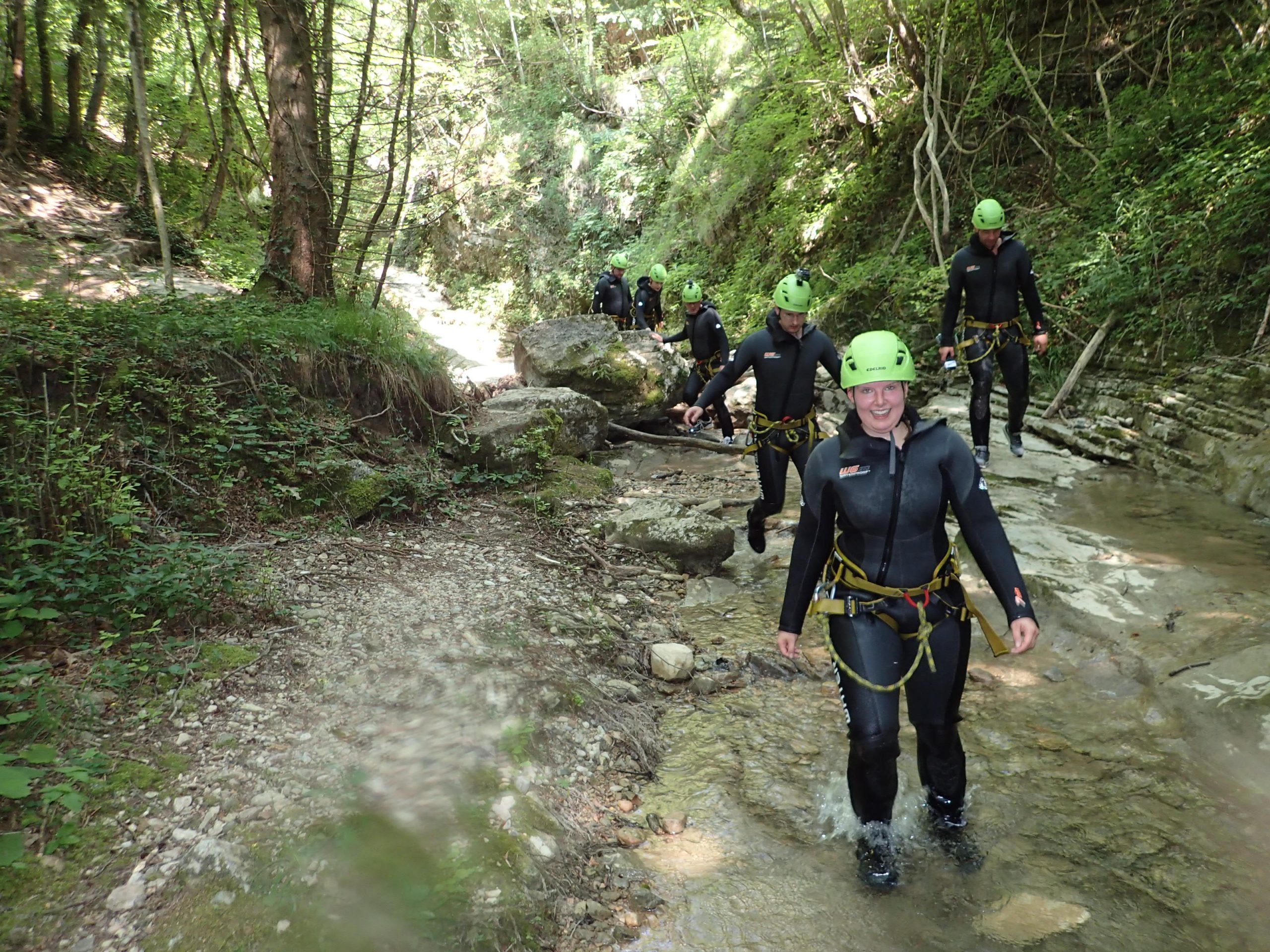 In der zweiten Juli Hälfte sind Katharina Schunda und Max Görgmeier zu Besuch am Gardasee und Max feiert am 18. Juni seinen Geburtstag vor Ort. Als Geschenk für ihn habe ich mir eine gemeinsame Canyoning Tour in der Vione Schlucht bei Piovere ausgedacht. Für unseren sportlichen Max genau das Richtige ... und für mich ein Konditionstraining mit der klaren Aufforderung an meienm Gewicht zu arbeiten. Unter Canyoning versteht man das Begehen einer Schlucht von oben nach in den unterschiedlichsten Varianten. Durch Abseilen, Abklettern, Springen, Rutschen, Schwimmen und manchmal sogar Tauchen gelangt man in geeigneter Ausrüstung durch die Schluchten. Als Erlebnissportart etablierte sich Canyoning Ende der 1990er Jahre in Spanien und Südfrankreich. Um die Jahrtausendwende folgte der Durchbruch auch in den Nordalpen. In den USA ist Canyoning eher als Canyoneering bekannt. Es bekam dort durch europäischen Einfluss einen enormen Entwicklungsschub. Neben dem sportlichen Reiz des Abenteuers steht vor allem das Naturerlebnis im Vordergrund. Bei dieser Sportart spielen die Beherrschung der speziellen Seiltechniken und das fundierte Wissen über regionale Wetter- und Wassergegebenheiten eine wichtige Rolle. Einige Naturschützer kritisieren Canyoning, weil Teile der Natur begangen werden, die sonst vom Menschen unberührt blieben. Besonders die kommerzielle Vermarktung für den Tourismus führt zu Problemen. Anhänger des Canyoning erwidern, dass Canyons teilweise mehrmals im Jahr von Hochwässern mehr verändert werden als durch den Einfluss der Menschen, die durch diese Schluchten laufen. Hierbei wird allerdings die vermehrte Nutzung von Anfahrtswegen, Zustiegspfaden und Parkmöglichkeiten außer Acht gelassen. Bei vielen Touren steht das gemeinsame Naturerlebnis im Vordergrund. Canyoning erfordert ein hohes Maß an alpin- und wassertechnischer Qualifikation. Ist man erst einmal in eine Tour eingestiegen, ist ein Rückzug vor Ende der Tour oft nicht mehr möglich. Diese Sportart sollte von Anfängern nur unter kundiger Anleitung durchgeführt werden. Die verwendeten Techniken weichen z. T. deutlich von denen im hochalpinen Bereich oder beim Klettern ab. Eine Übertragung dieser Techniken auf das Canyoning kann erhebliche Gefahren beinhalten. Bei schwierigen Canyoningtouren sollte man einen ortskundigen sowie zertifizierten Canyonführer zu Rate ziehen. Es gibt für diesen Outdoorbereich mittlerweile einige Organisationen, die professionelle Canyoningführer ausbilden. Bergführer qualifizieren sich über eine Zusatzausbildung zum Canyoningführer. Vorherige Information über die Wetterlage ist unabdingbar, da bei einem großen Wassereinzugsgebiet der Wasserspiegel in einer engen Schlucht bei starkem Regen in Minutenschnelle lebensgefährlich ansteigen kann. Aber nicht nur die Gefahr durch eine Springflut ist gegeben, sondern auch durch Steinschlag, deswegen sollte ein Helm getragen werden. Auch über spezielle Risiken, wie z. B. den möglichen Wasserablauf eines Stausees oder Schneeschmelzen, welche in manchen Gebieten bis in den späten Frühling die Gefahr erhöhen, sollten vorher Erkundungen eingezogen werden. Die Beobachtung des Wetters muss bereits Tage vor einer Tour beginnen und sich über die gesamte Tourenlänge erstrecken. Ende Juli 1999 kamen 20 Urlauber bei einer Canyoning Tour am Saxetbach bei Interlaken zu Tode, obgleich örtliche Bergführer vor dem ursächlichen Gewittersturm gewarnt hatten. Einige weitere Canyoningunfälle zeigen, dass für diese Sportart größtmögliche Sicherheit gefordert ist. Es gilt die Regel, nicht alleine zu gehen. Drei bis vier Personen gelten als die optimale Gruppengröße. Wer diesen Sport selbständig ausüben möchte, sollte über Trittsicherheit verfügen und keine Höhenangst haben. Dazu kommt eine gute Kondition und schwimmen zu können. Ebenso sollte man über ausreichendes theoretisches und praktisches Wissen in den Themengebieten wie Seil- und Wildwassertechnik sowie Orientierung und Erste Hilfe verfügen.