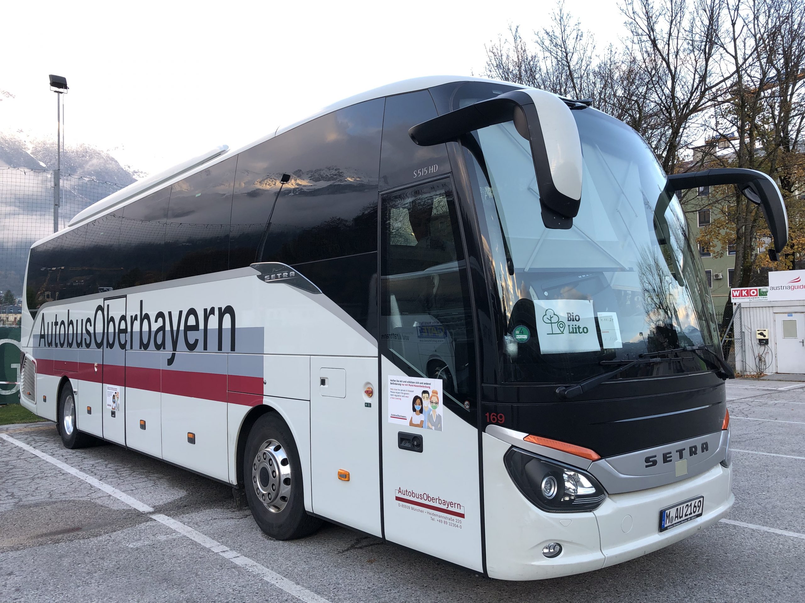 Mit diesem ausreichend großen Fahrzeug des Unternehmens Autobus Oberbayern sind wir klimaneutraler und zudem relaxter unterwegs als mit unseren eigenen Fahrzeugen