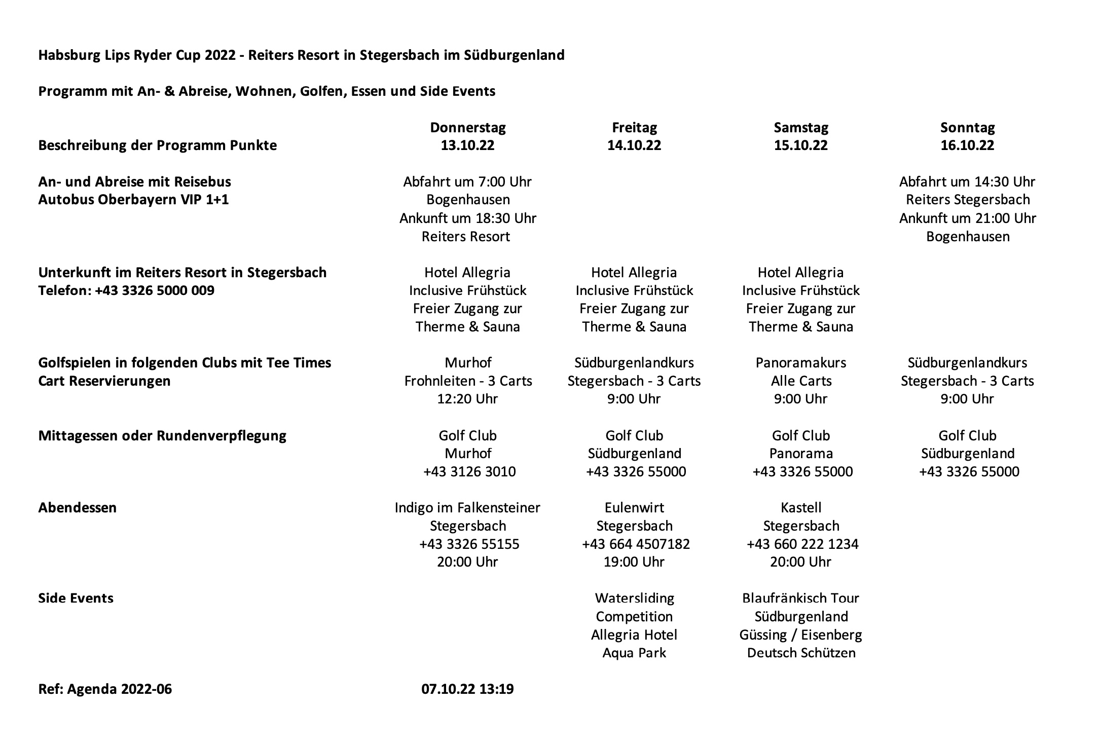 Nach sechs abwechslungsreichen Trips an Golf-Ziele in Portugal, Irland, Spanien, Schottland und zuletzt zwei Mal in Italien werden wir im Oktober nach Österreich aufbrechen. Nomen ist Omen, denn nachdem wir unsere bisherigen Ryder Cup Wettbewerbe als Bacalaos, Lobster Larrys, Dali Toreros, Scotch Highlanders, Verdura Mafiosis und Gardone Luganas ausgetragen haben sind wir diesmal als Habsburg Lips unterwegs. Wir starten in unsere nächste Competition mit einem kumuliert ausgeglichenen Spielstand von 3:3 und weisen in den beiden Teams ein annähernd ausgeglichenes Durchschnitts Handicap für alle Spieler auf. Mehrheitlich haben sich die Team Mitglieder von Links und Rechts der Isar für eine Veranstaltung im Herbst und noch dazu einer Anreise auf der Straße ausgesprochen. Obwohl - wie im Vorjahr - der Gardasee in der Abstimmung wieder weit vorne war, ist diesmal unser Nachbarland Österreich Favorit geworden. So ist es diesmal ein Golf Match im südlichen Burgenland, welches mit hervorragendem Wetter durch viele Sonnentage auch noch im Oktober bestens fürs Golfen geeignet ist. Zudem warten im Gebiet südwestlich des Neusiedler Sees Burgen, Schlösser und eindrucksvolle Naturlandschaften mit grandiosen Weinen darauf entdeckt zu werden. Es sind vor allem die 300 Sonnentage im Jahr, die es möglich machen, dass hier von Anfang März bis Dezember gespielt werden kann. Reiters Golfschaukel im Südburgenland umfasst verschiedene Golfplätze in Bad Tatzmannsdorf und Stegersbach. Die Anlagen sind hervorragend ausgestattet, neben Championship-Plätzen erwarten Golfer auch die größte Driving Range Österreichs. In Stegersbach befinden sich zwei Plätze - einer direkt an unserem Hotel und ein zweiter, der mit dem Golfcart erreichbar ist. Wir spielen jeweils Freitag, Samstag und Sonntag ab 9:00 Uhr auf diesen Plätzen im professionellen Ryder Cup Modus im Fourball, Foursome und Einzelmodus. Wir treten unsere Reise gemeinsam ab München mit einem komfortablen Reisebus an und starten um 7:00 Uhr in Bogenhausen.