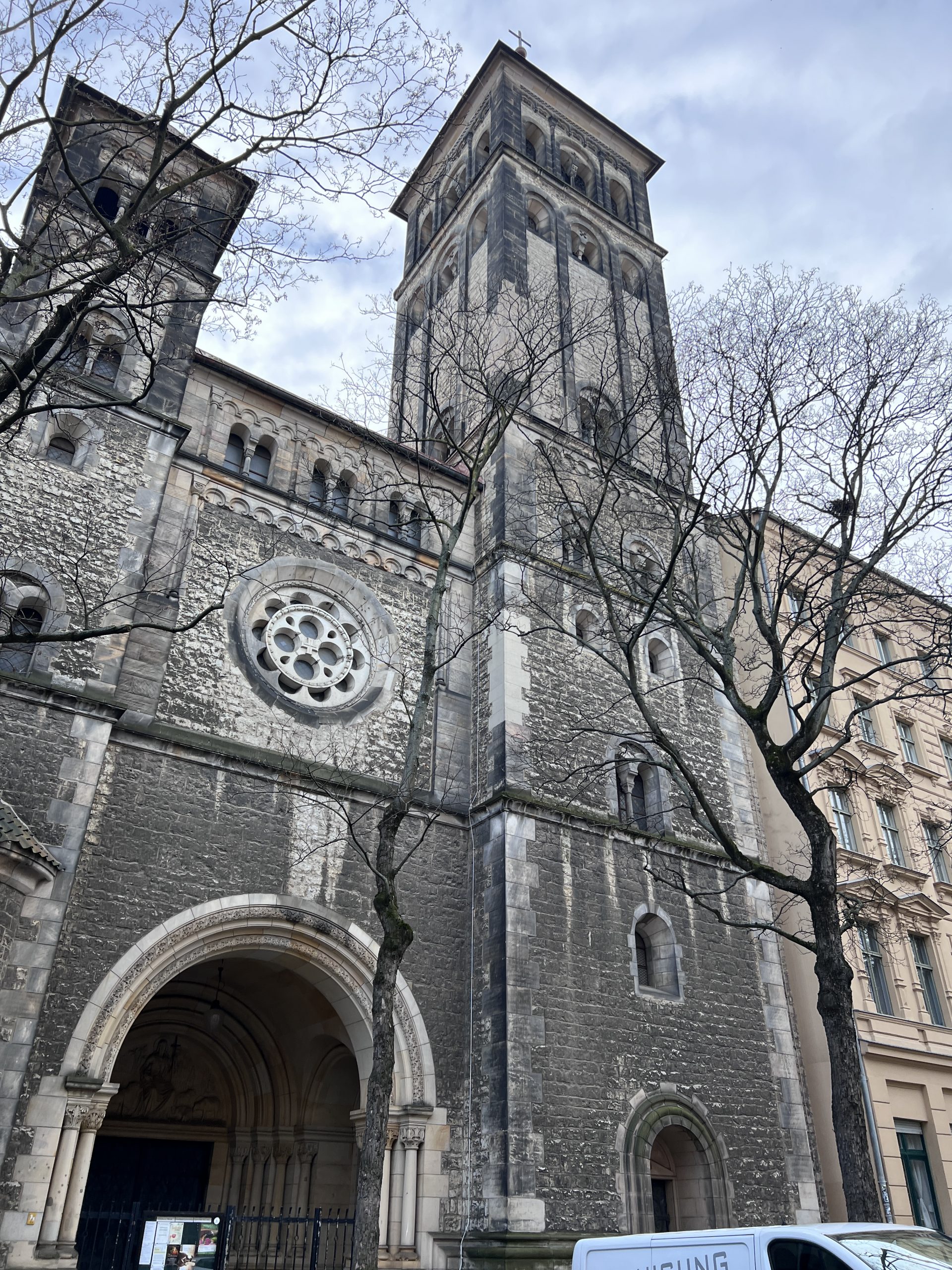 Nahe zum Prenzlauer Berg finde ich die katholische Herz-Jesu-Kirche und radele auf dem Weg dahin durch bereits belebte sonnige Parks