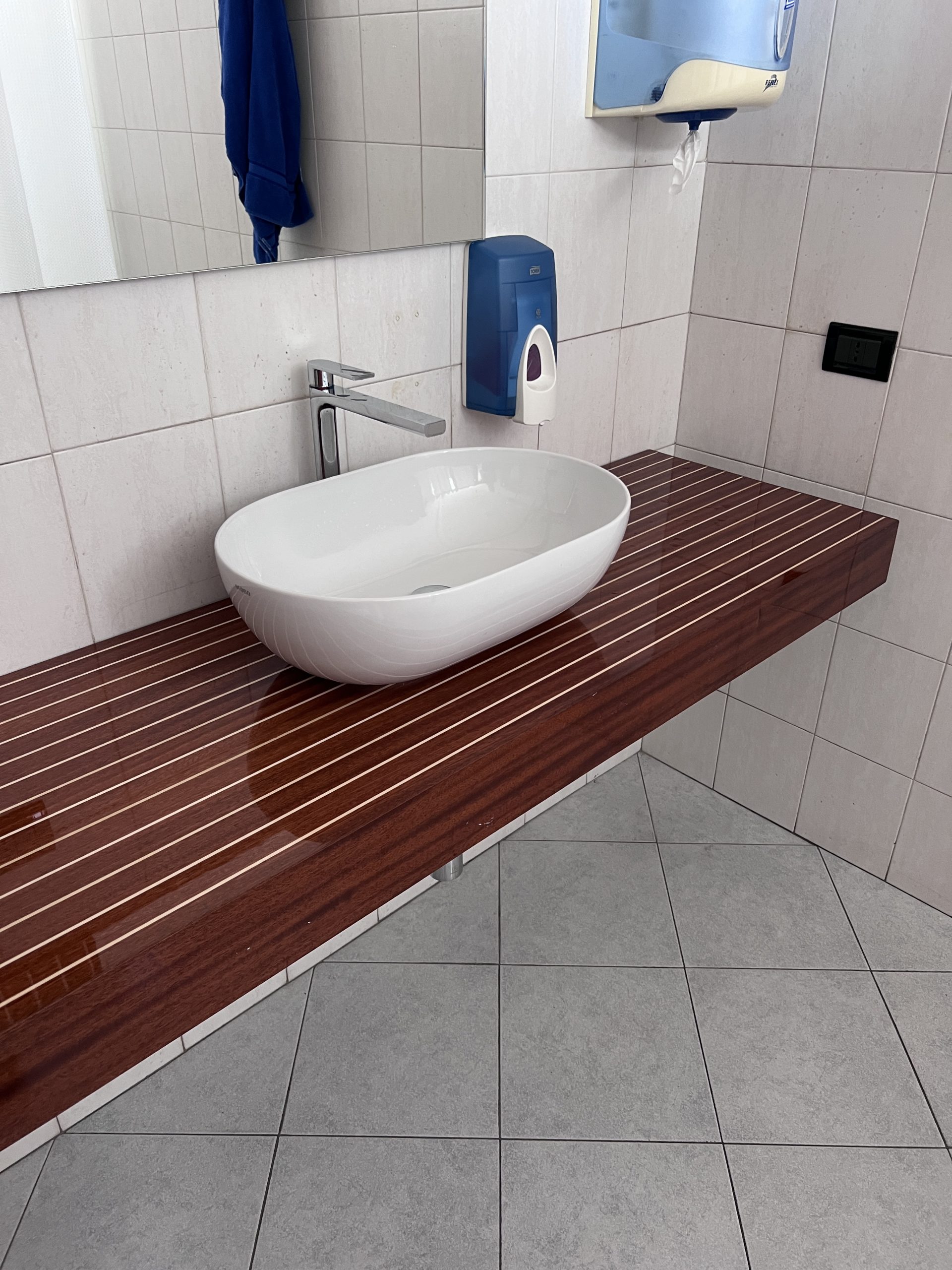 Scheinbar baut sich Alberto Arcangeli anschließend in den Waschräumen die Sanitär Möbel aus den übrig bleibenden Holzbeständen selber zusammen