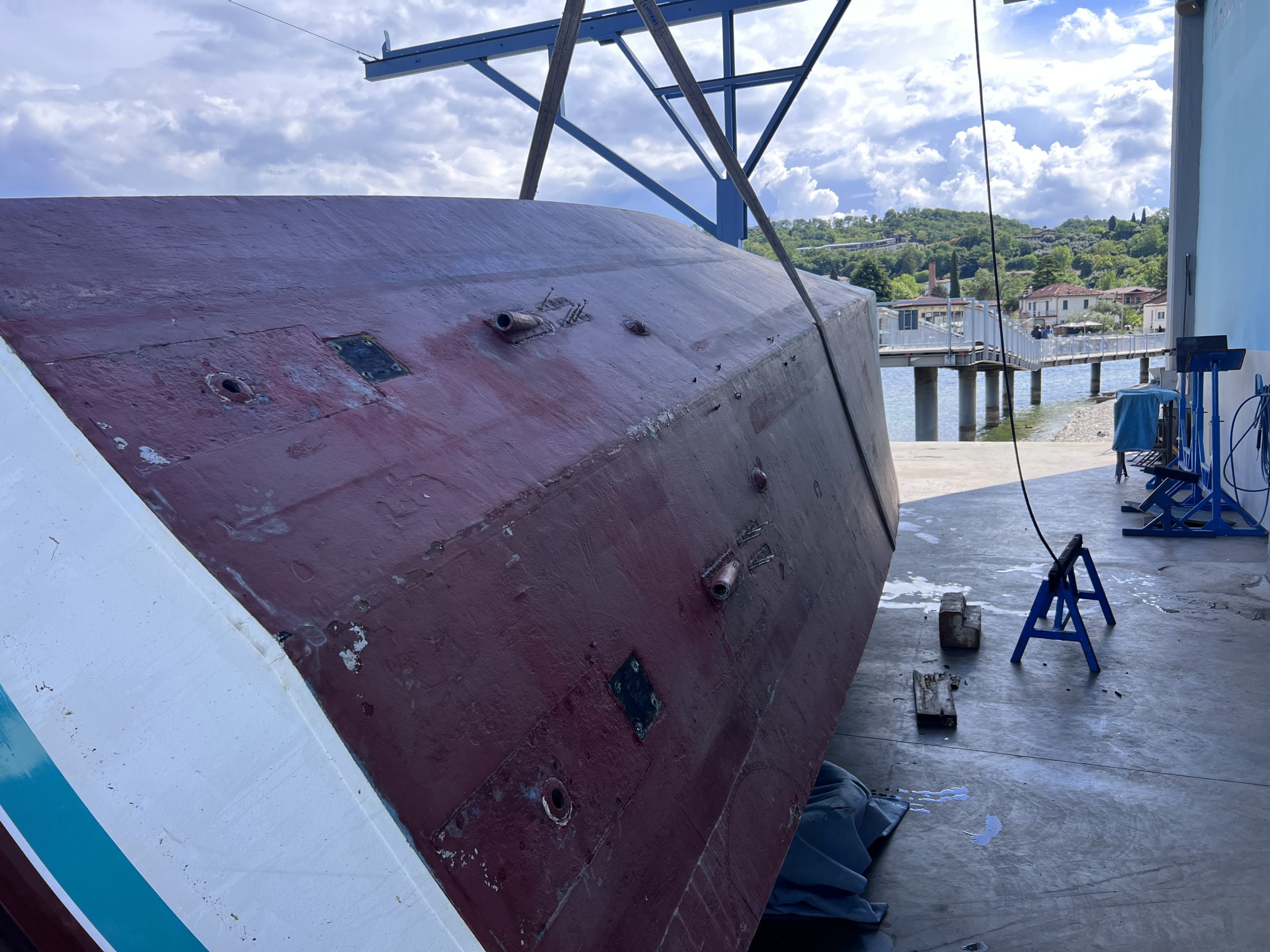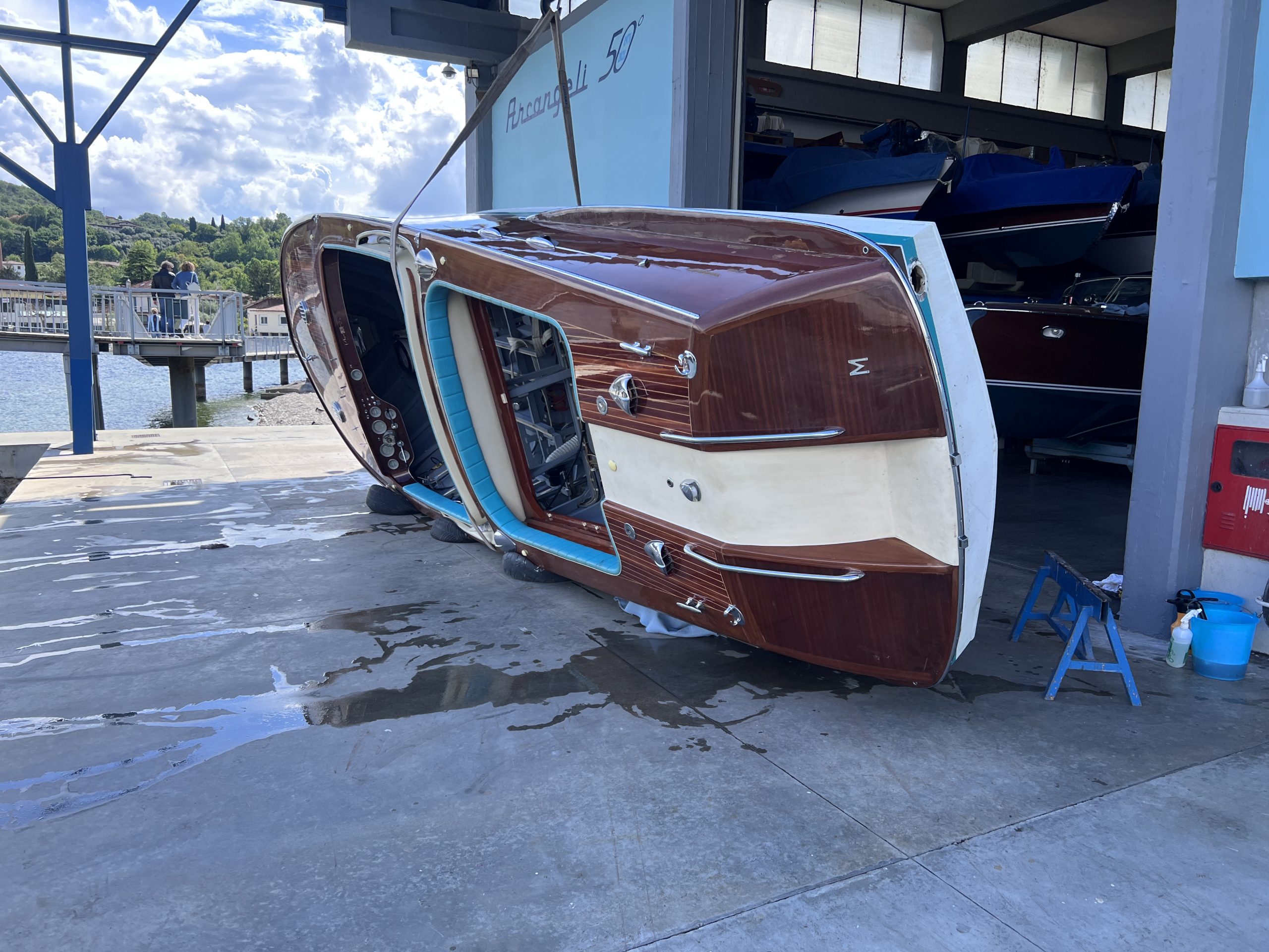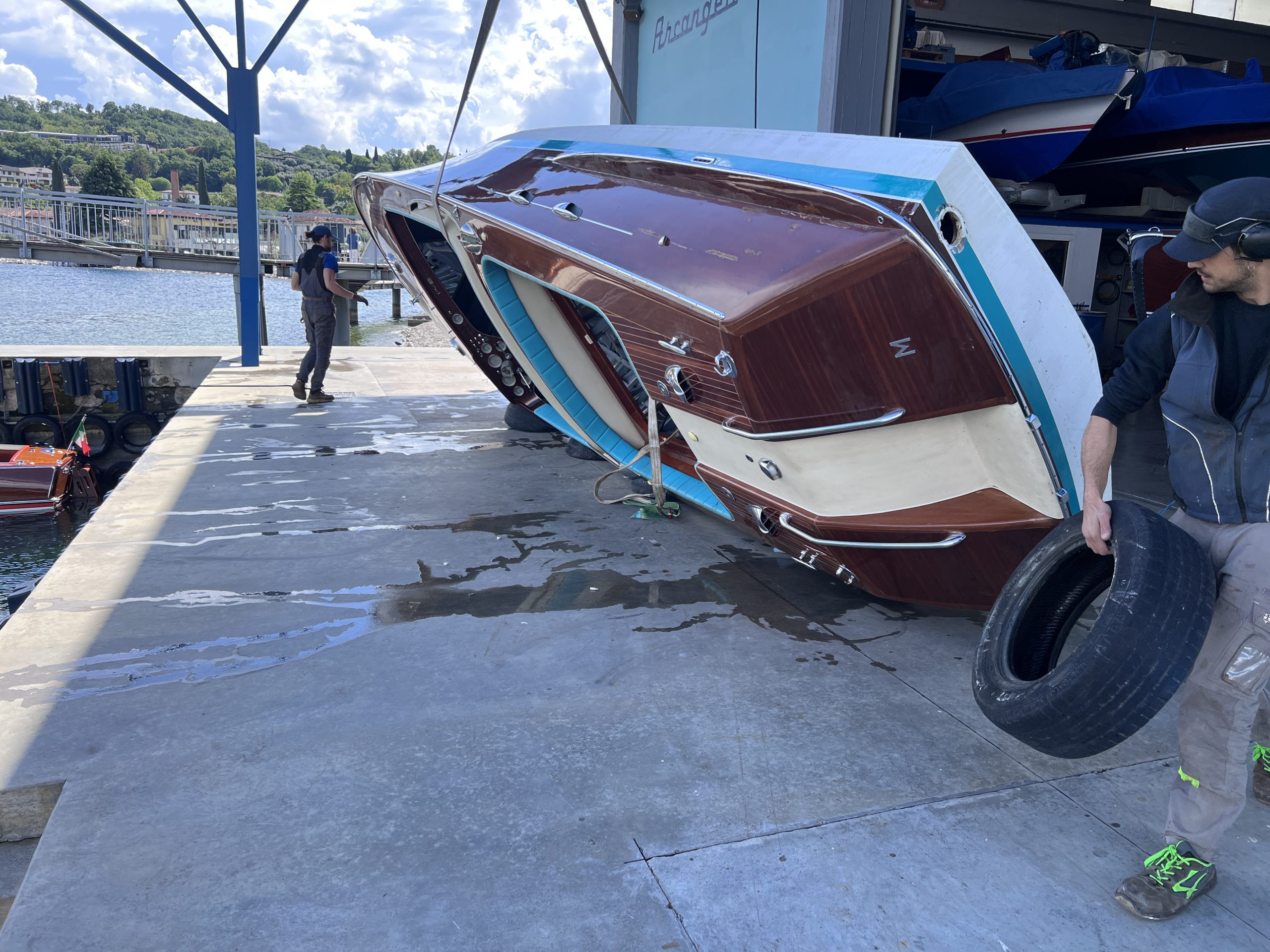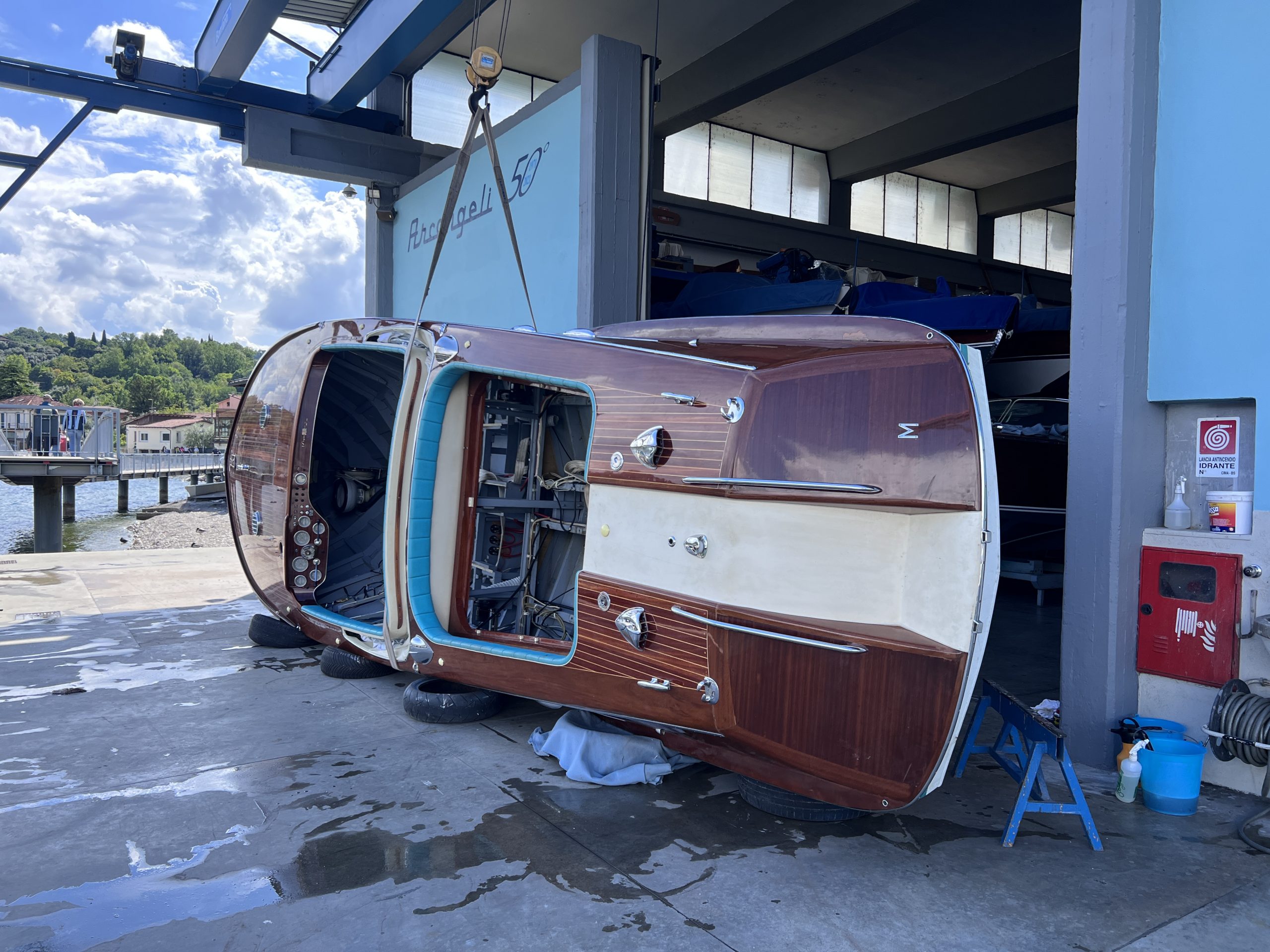 In unserer Werft in Salò beobachte ich, wie die Matrosen des Centro Nautico eine aus St. Tropez angelieferte Aquarama Speziale zur Restaurierung vorbereiten