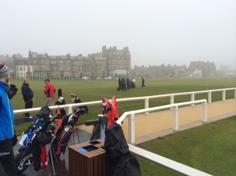 Abschlag zum ersten Loch des St. Andrew Old Course - vernebelt - auf dem wir eine durch die St. Andrews Lotterie zugeteilte Runde gespielt haben