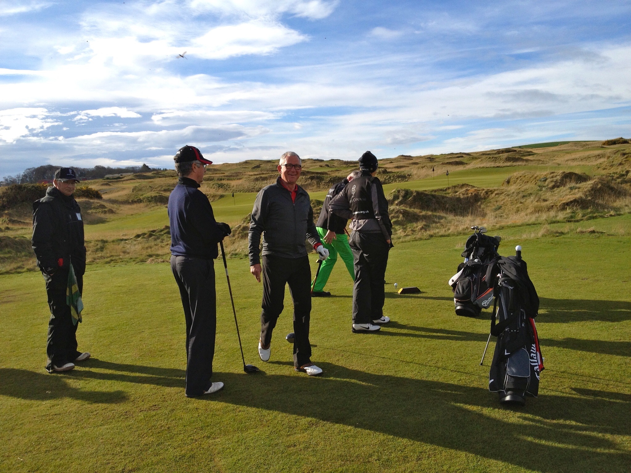 Im April 2014 war wieder St. Andrews in Schottland Ziel unserer Golf Reisegruppe in einer zwei Flight Zusammensetzung . Bei zum Teil leider ziemlich nebulösen Verhältnissen - das galt für das Wetter und die vielen unscharfen Photos gleichermaßen - spielten wir unser Turnier auf den nachfolgenden St. Andrews Links Plätzen: Old Course, Eden Course, Jubilee Course und Castle Course. Unser Wettspiel Format war damals noch keine Ryder Cup Competition, sondern jeweils Einzel- und Zimmerwertungen im Match-Play Modus. Somit konnten sich einzelne Spieler auch zum Gräber Umgang auf dem örtlichen Friedhof abseilen, ohne einen Kollateral Schaden anzurichten