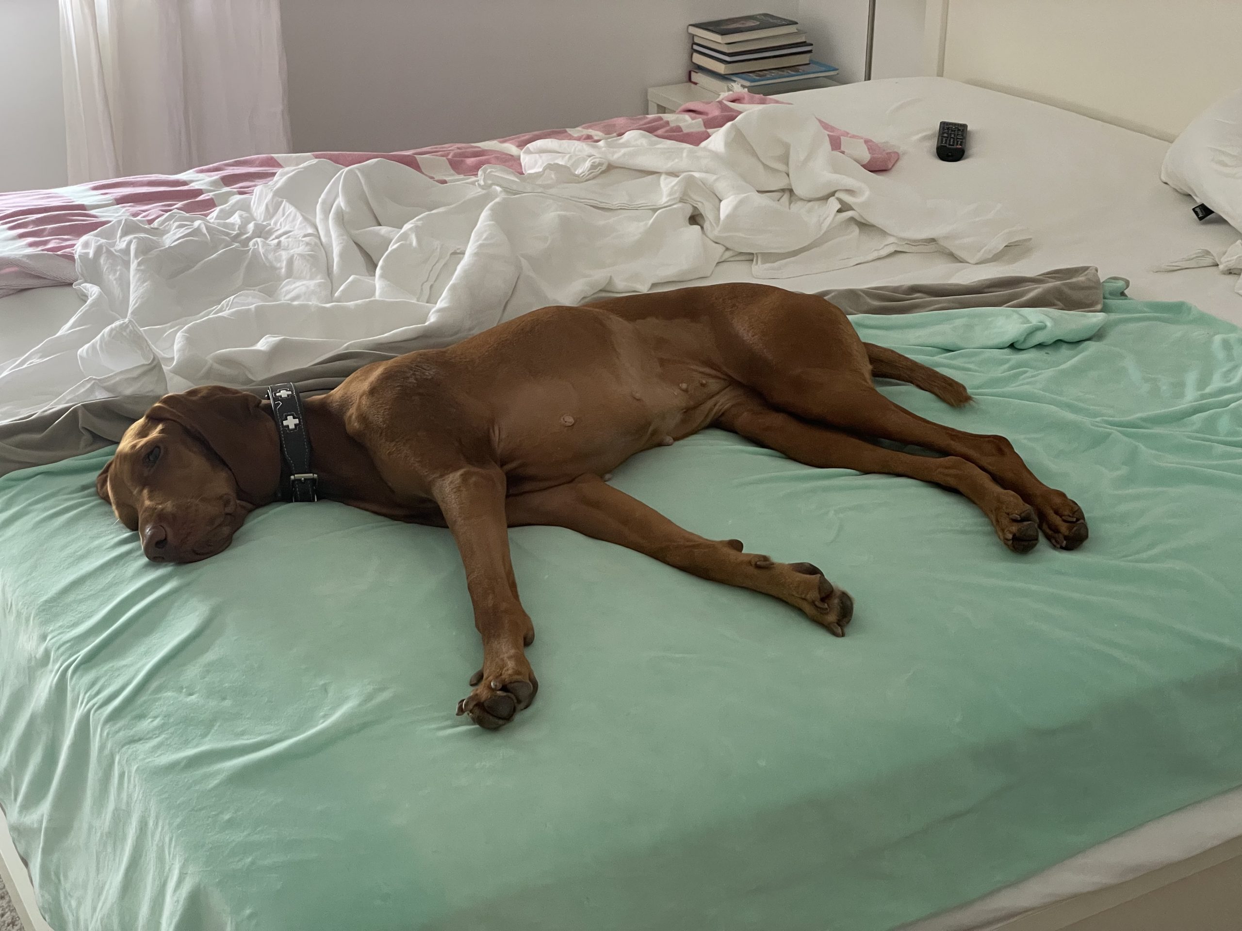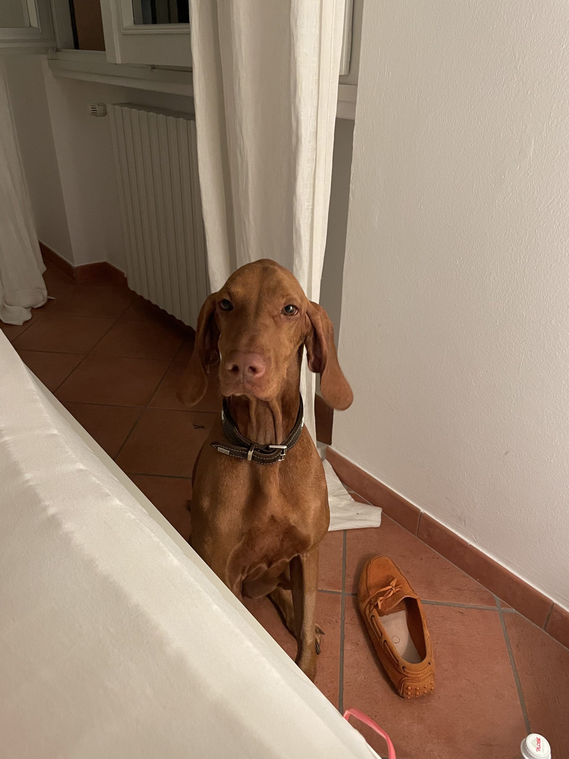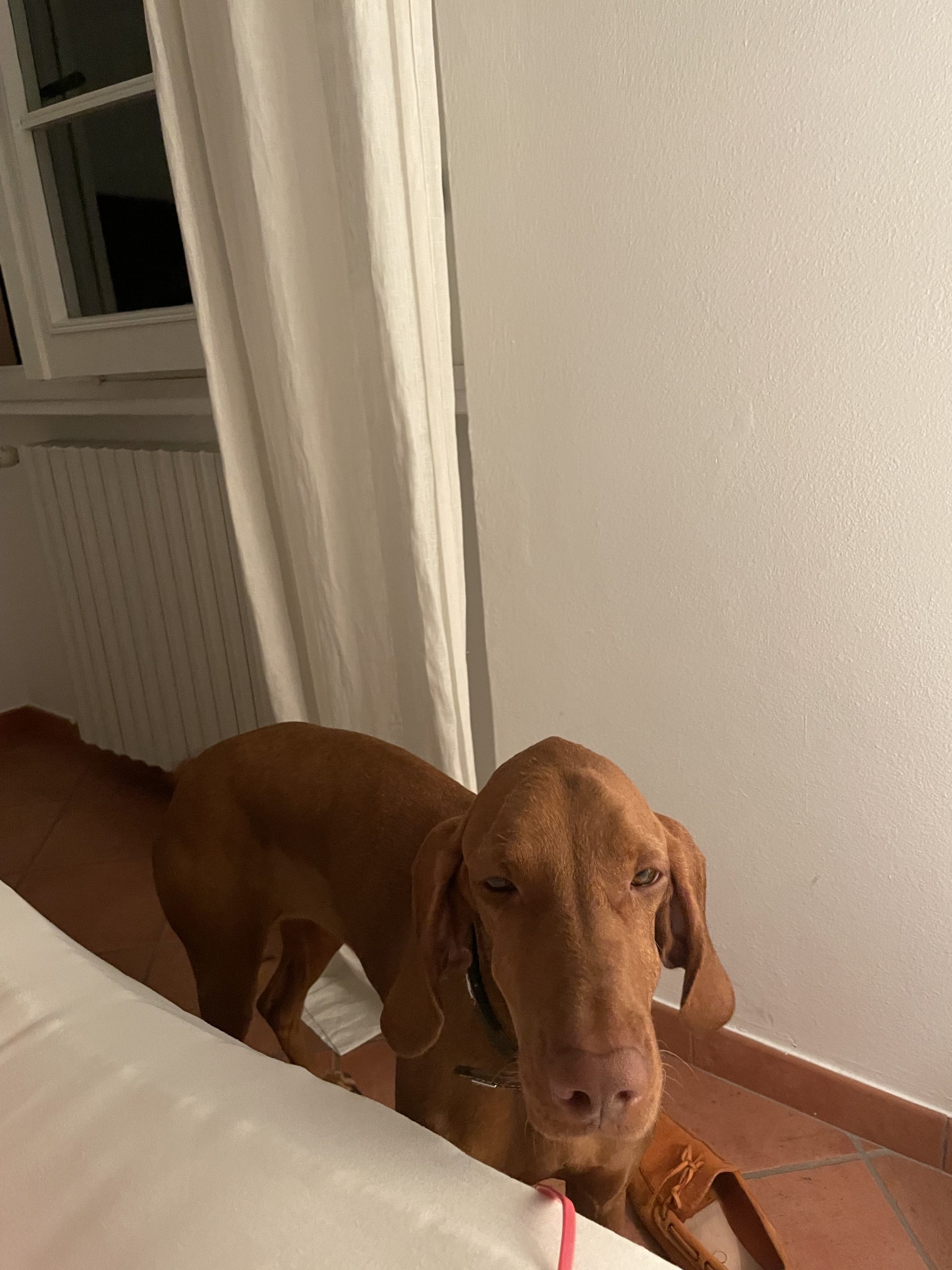 Ginger - wie meistens - auf dem Bett und die brave Tati auf dem Steinboden