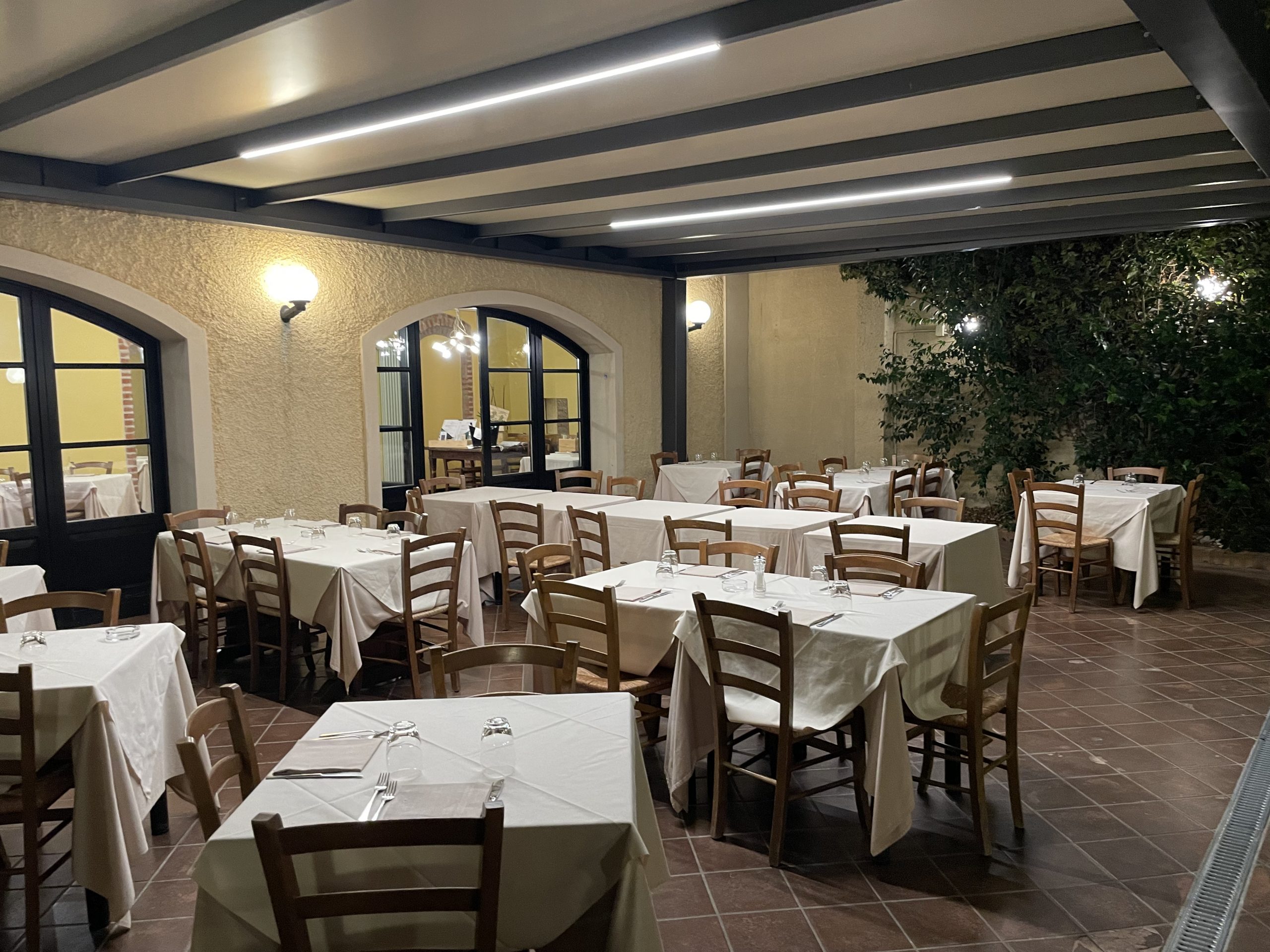 Bei hohen Temperaturen bedarf es schattiger Plätze in Gartenrestaurants ... wie hier mit Gehrckens und Schundas in der Osteria Al Gallo in Campoverde