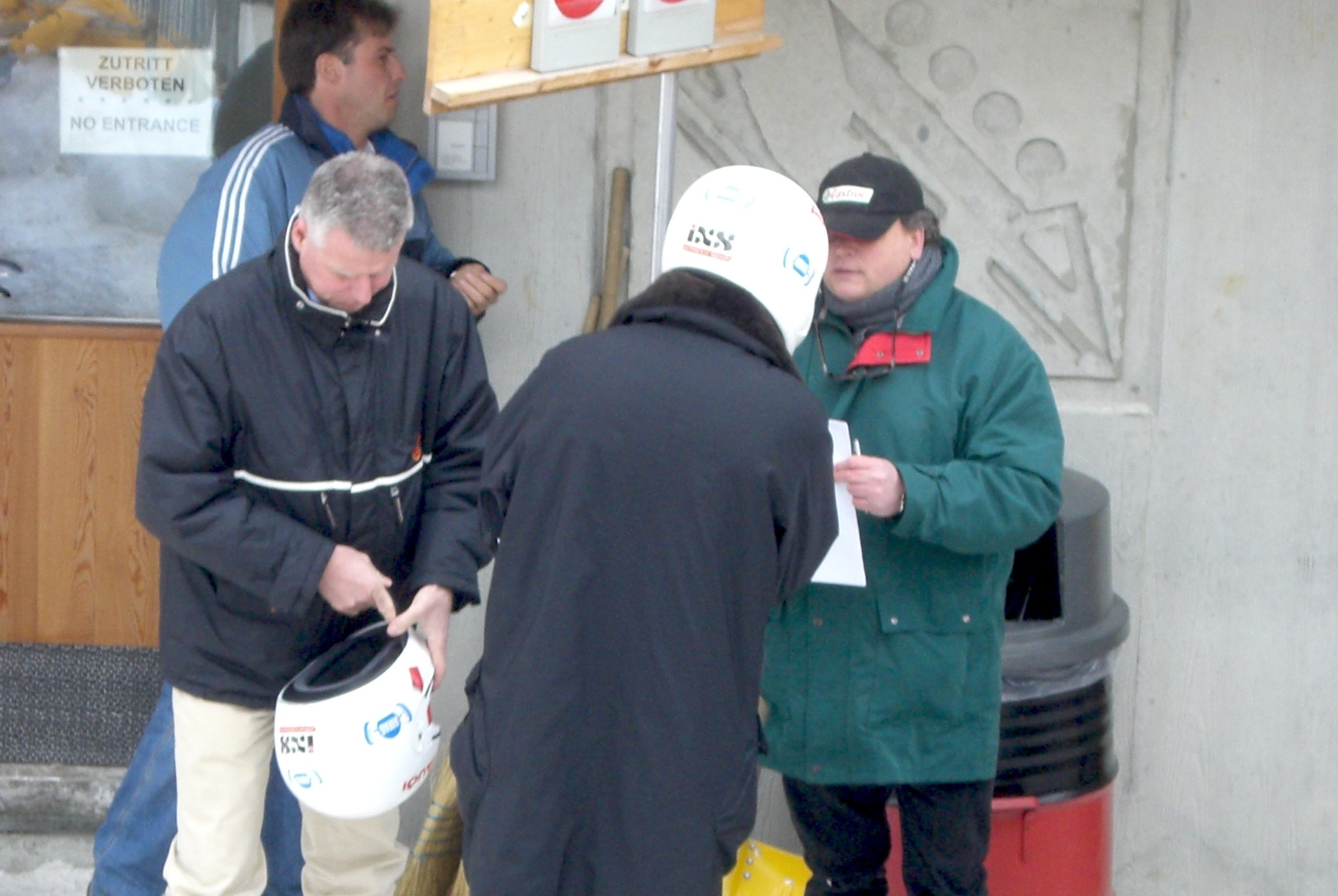Vor dem Start tauschen wir uns auch als "Passagiere" noch mal aus und nehmen Tipps und Tricks mit auf unseren Weg nach unten. Wir sitzen dabei zu zweit als Ballast im Sandwich zwischen Steuermann vorne und Bremser hinten .... macht irre Spass, wenn man sich an das Hin- und Her-Schleudern in den schnellen Kurven gewöhnt