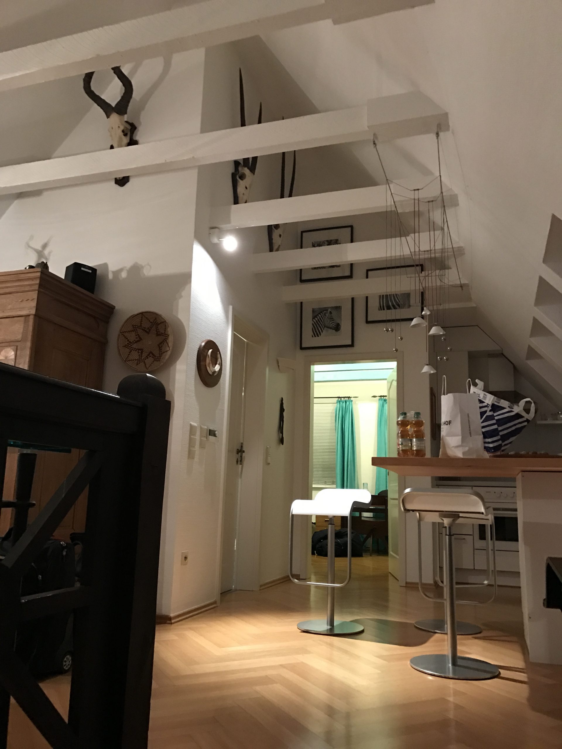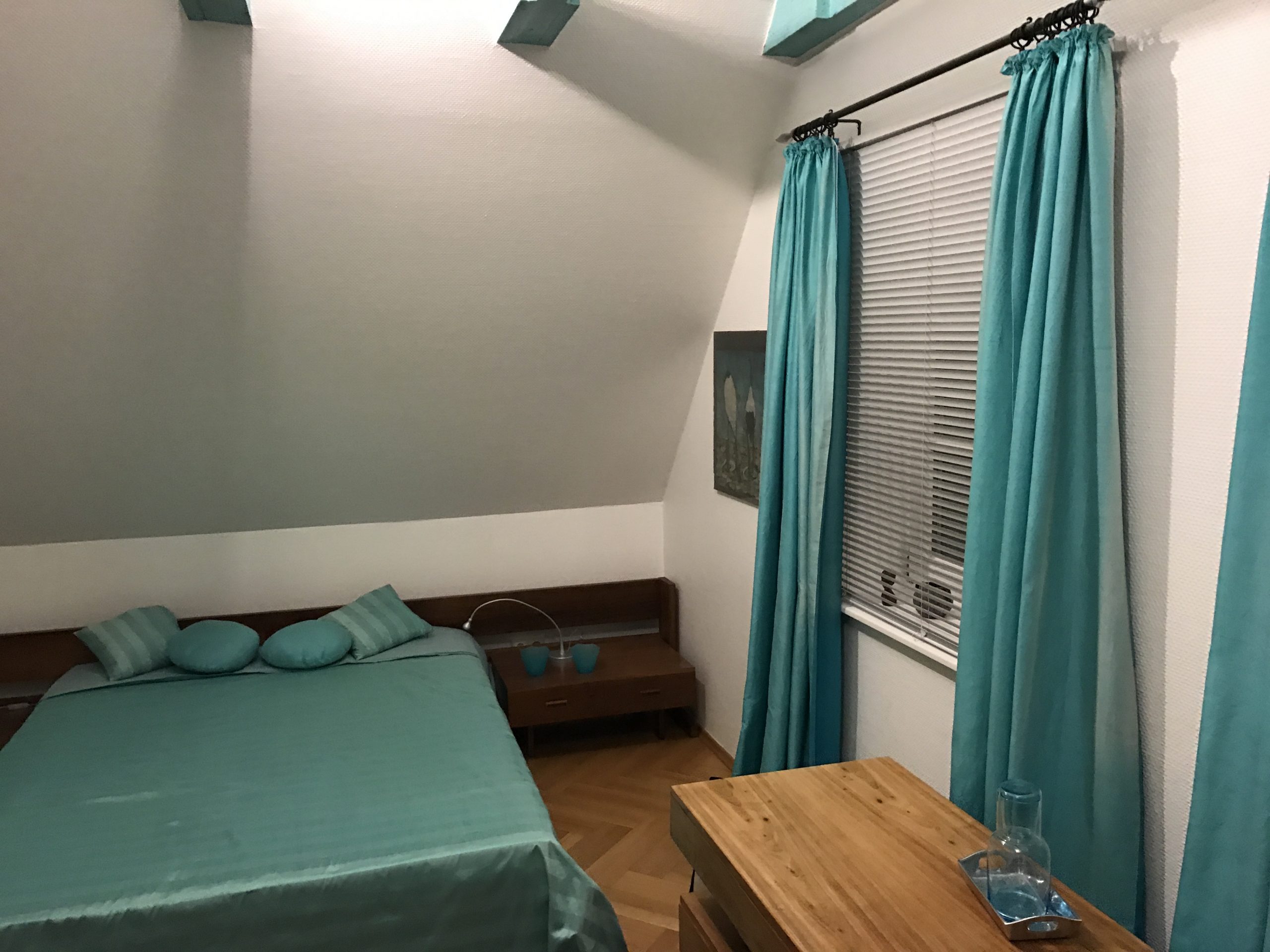 Ein türkises - Frau Hoppenstedt liebte Farben - Nachtlager mit Blick ins Gebälk.