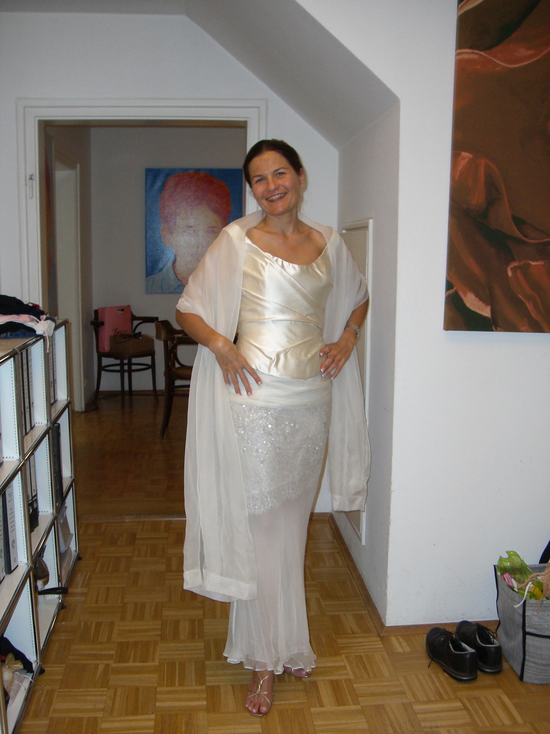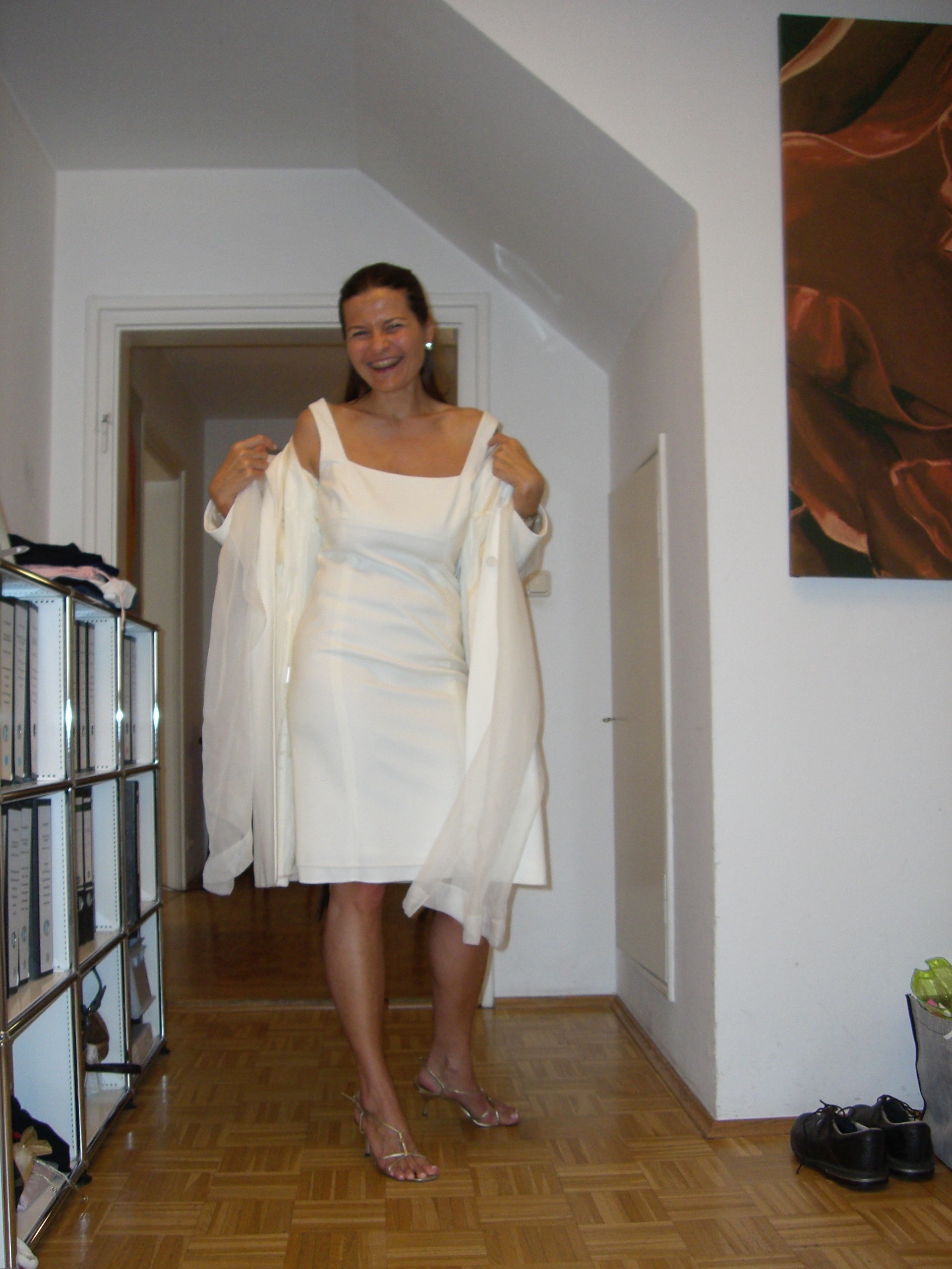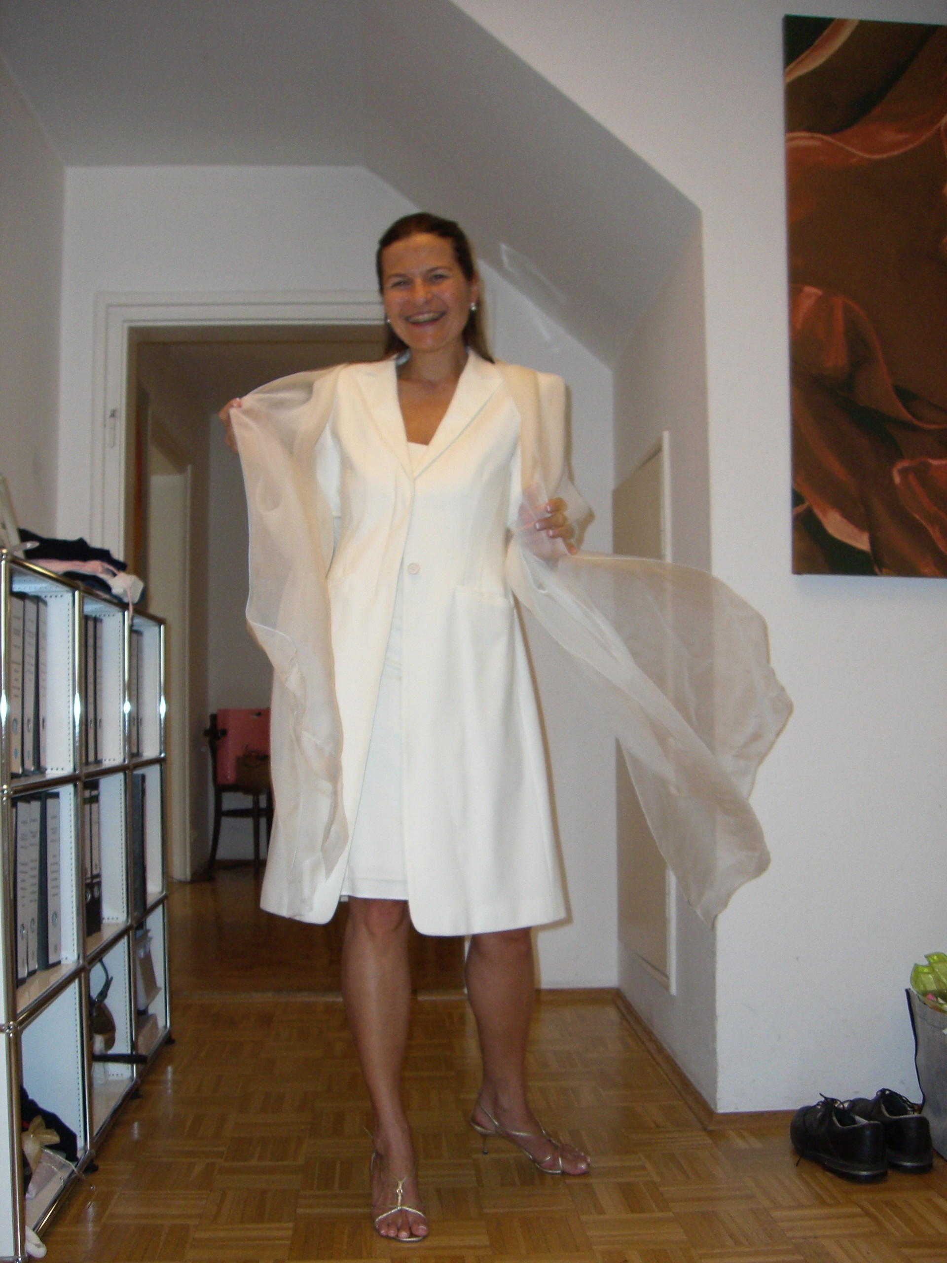 Andrea Haushofer - seit gemeinsamen Escada Zeiten mit Annette befreundete Ex-Kollegin - und Albert Haushofer, Sohn eines in München seit Generationen ansässigen DOB Markenunternehmens trauen sich und heiraten im Dezember im Standesamt in der Münchner Mandlstrasse. In solchen Fällen darf natürlich besonders Outfit technisch nichts dem Zufall überlassen werden, weshalb Andrea zum Probe Show Laufen in unsere Wohnung in der Möhlstrasse kommt. Nach X-facher Überprüfung der möglichen Varianten fällt die finale Entscheidung doch noch, was bei Ettes immer harten Entscheidungen nicht einfach ist. Der Trauungsprozess konnte dann sauber abgearbeitet werden. Später gingen die beiden durch diverse Höhen und Tiefen, und Annette und ich haben völlig den Kontakt verloren. Zwischenzeitlich mussten wir leider auch hören, daß Albert und Andrea mittlerweile wieder geschiedene Leute sind.