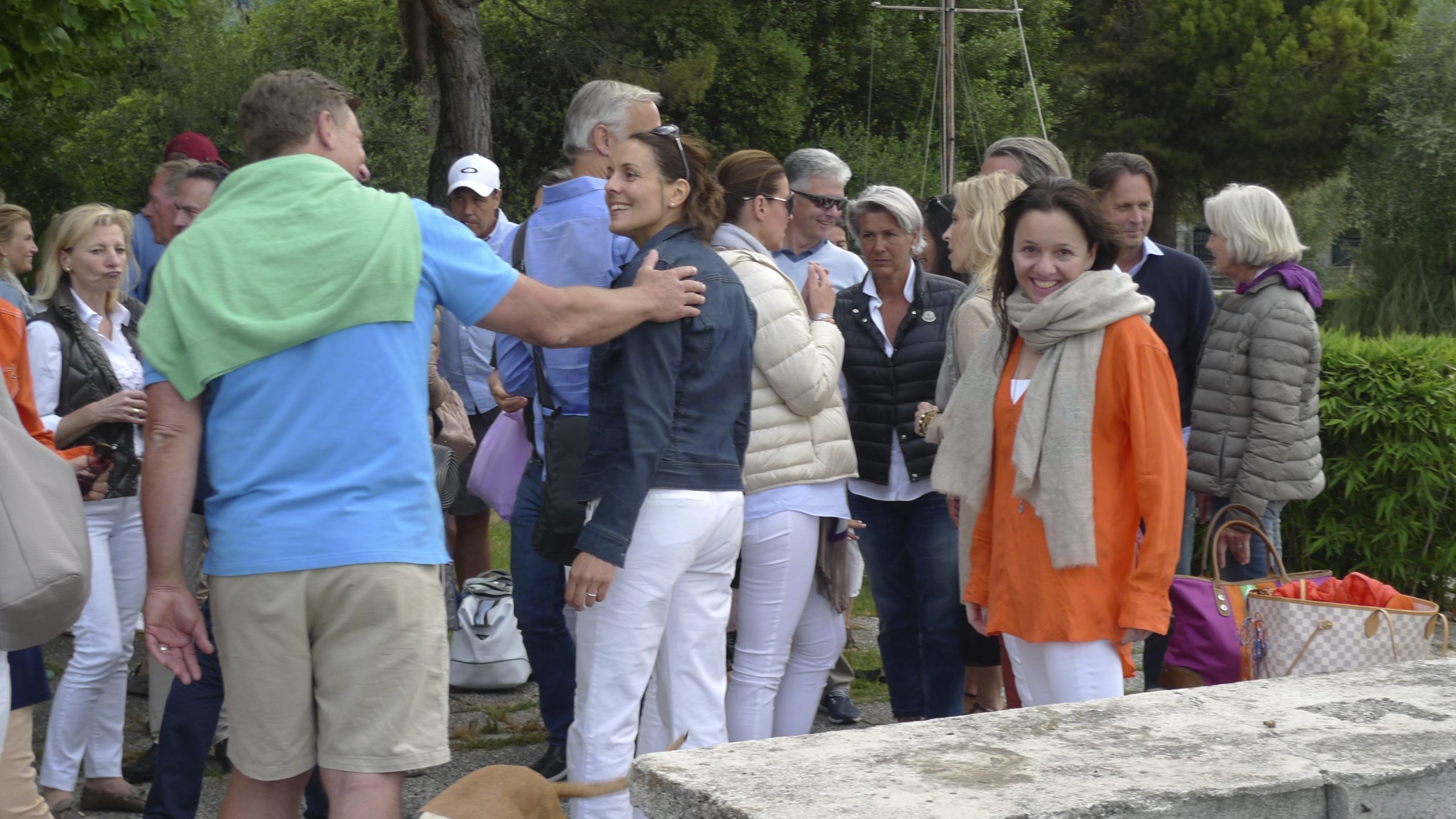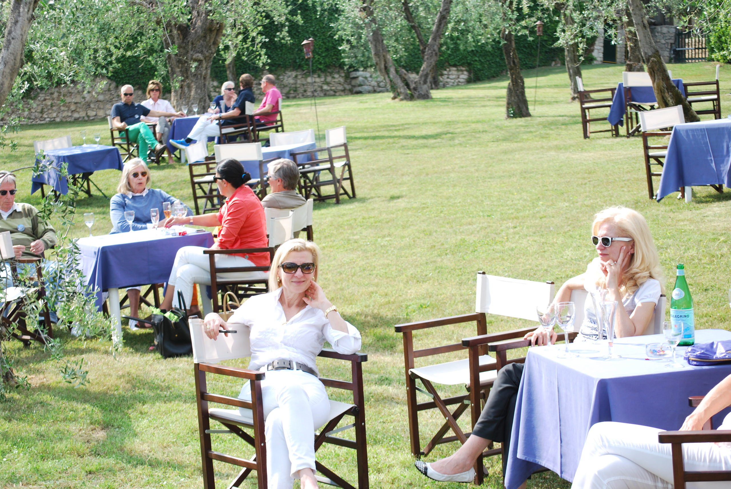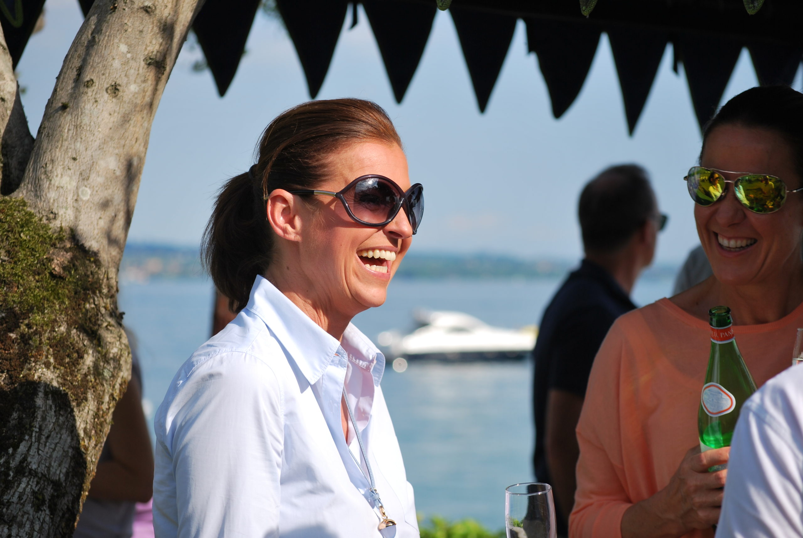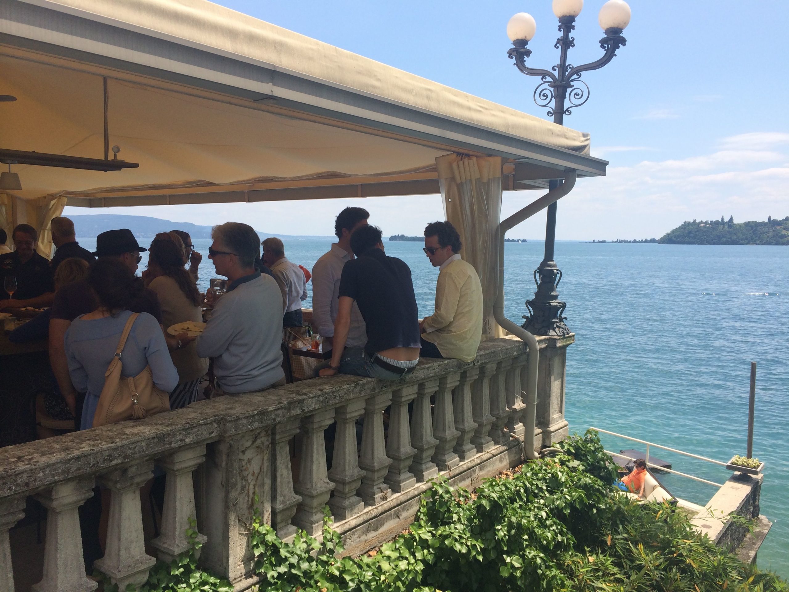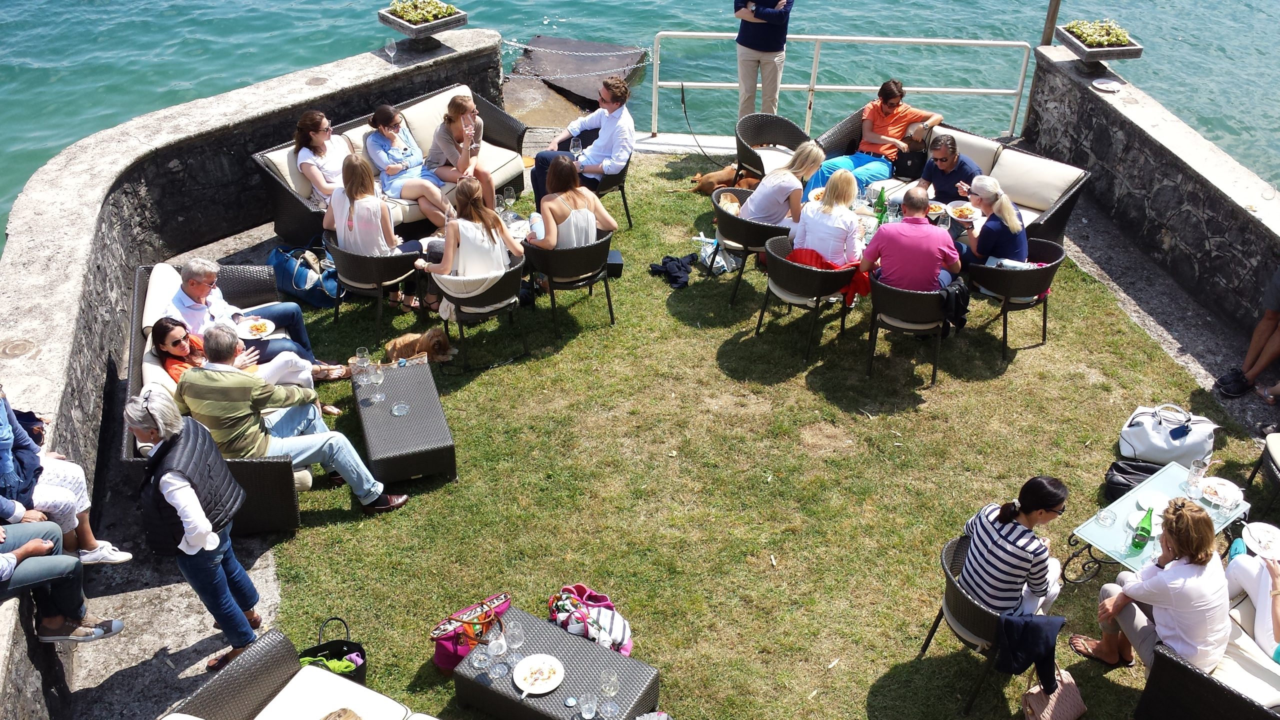 Ein kleiner Teil unserer Gäste beim Relaxen im Beach Club Darsena, von wo aus wir nach einem kleinen Mittagessen mit Booten zu einem Ausflug nach San Vigilio aufbrachen
