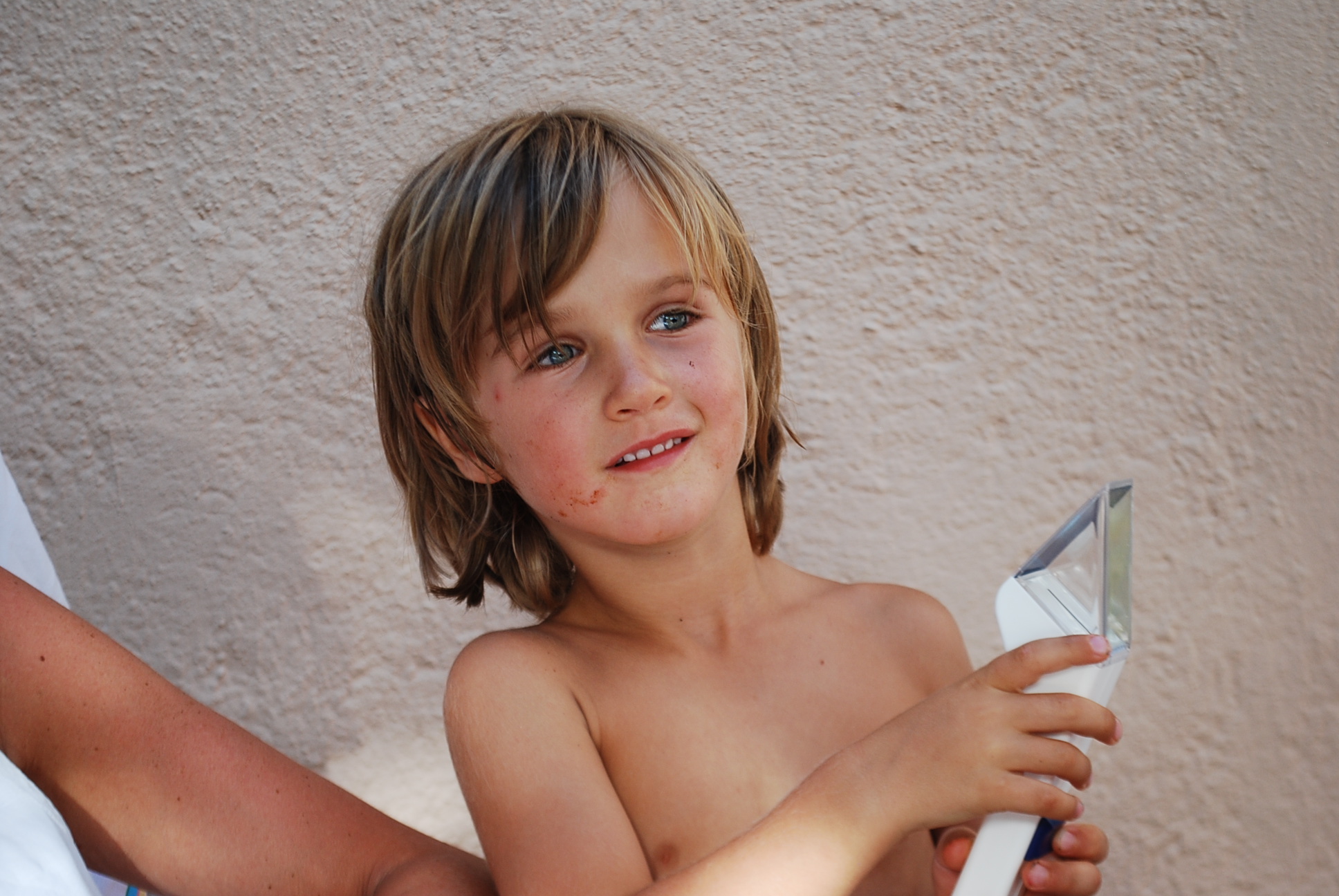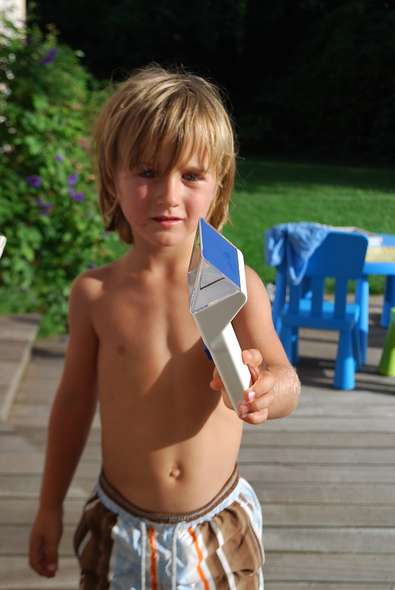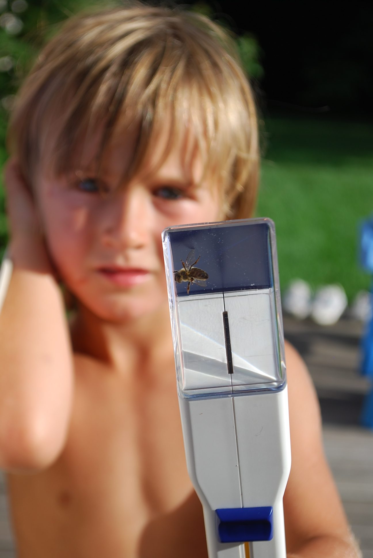 Leo lässt sich sehr schnell begeistern und es dauert nicht lange, bevor die erste - etwas müde und damit lahme - Biene mit Snapy gefangen ist