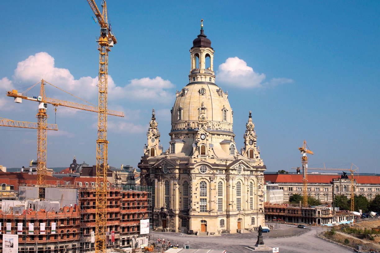Fast 48 Jahre lang mahnte die Ruine der Frauenkirche am Dresdner Neumarkt an die Schrecken des Zweiten Weltkriegs. Im Mai 1994 begann der spektakuläre Wiederaufbau. Die reinen Baukosten liegen bei 131 Millionen Euro.