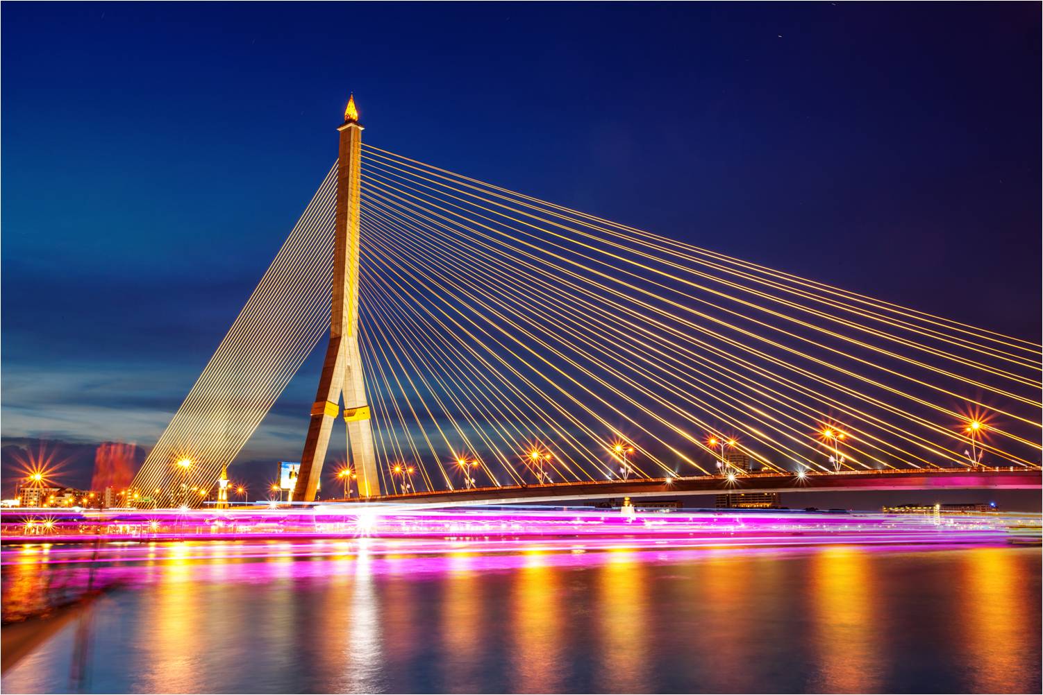 Eine faszinierende Schrägseilbrücke namens „Rama-VIII-Brücke“ wurde in der thailändischen Hauptstadt Bangkok offiziell eröffnet, die mit etwas mehr als zwei Kilometern den Fluss Chao Phraya überspannt.