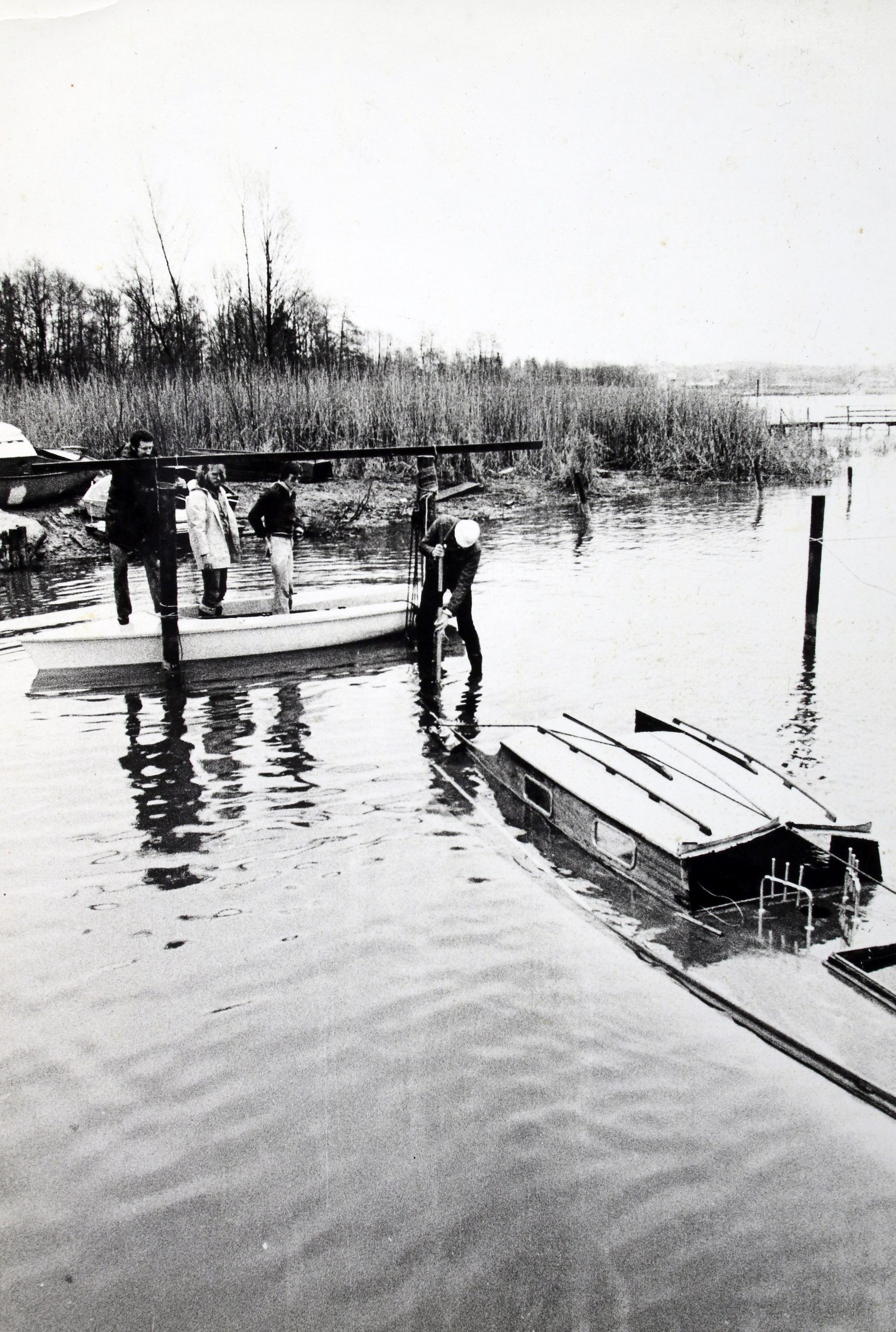 Treffer ... versenkt ... hier haben wir unser Segel-Schulboot - den ehemals 45er Nationalen Kreuzer unseres Vaters - im Chiemsee beim Kranen geflutet