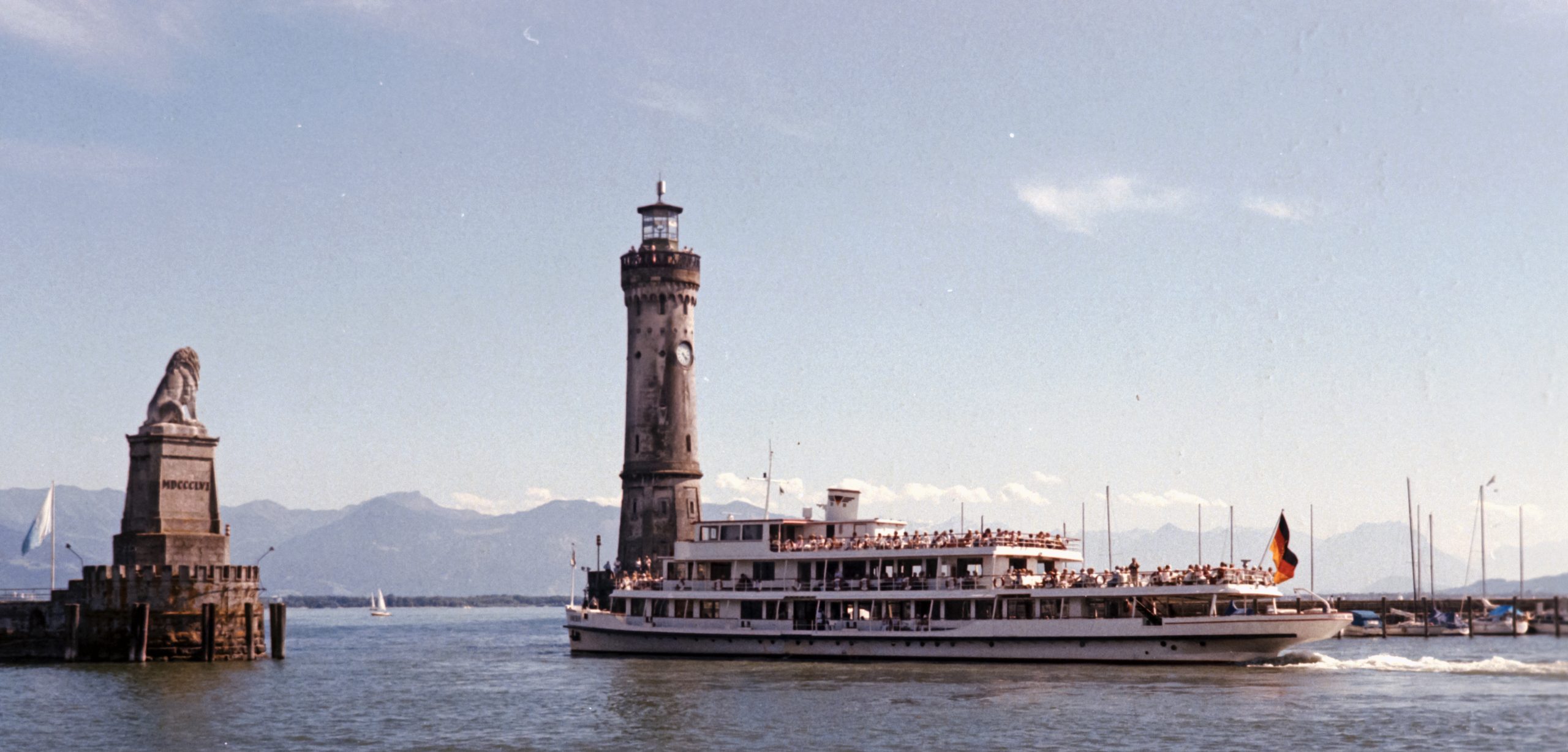 Unser Schiff verlässt die Lindauer Hafeneinfahrt zwischen bayerischem Löwen und Leuchtturm.
