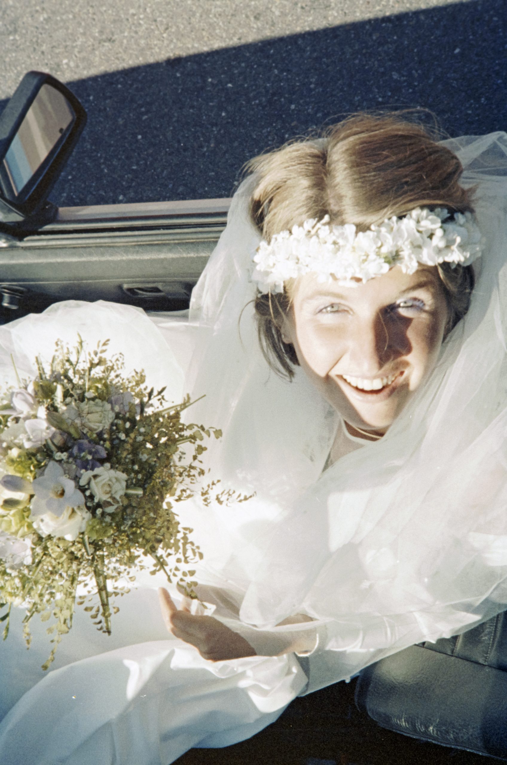 Die frischgebackene Braut mit Blumenschmuck ... bereits im Auto auf dem "Entführungstrip" ...