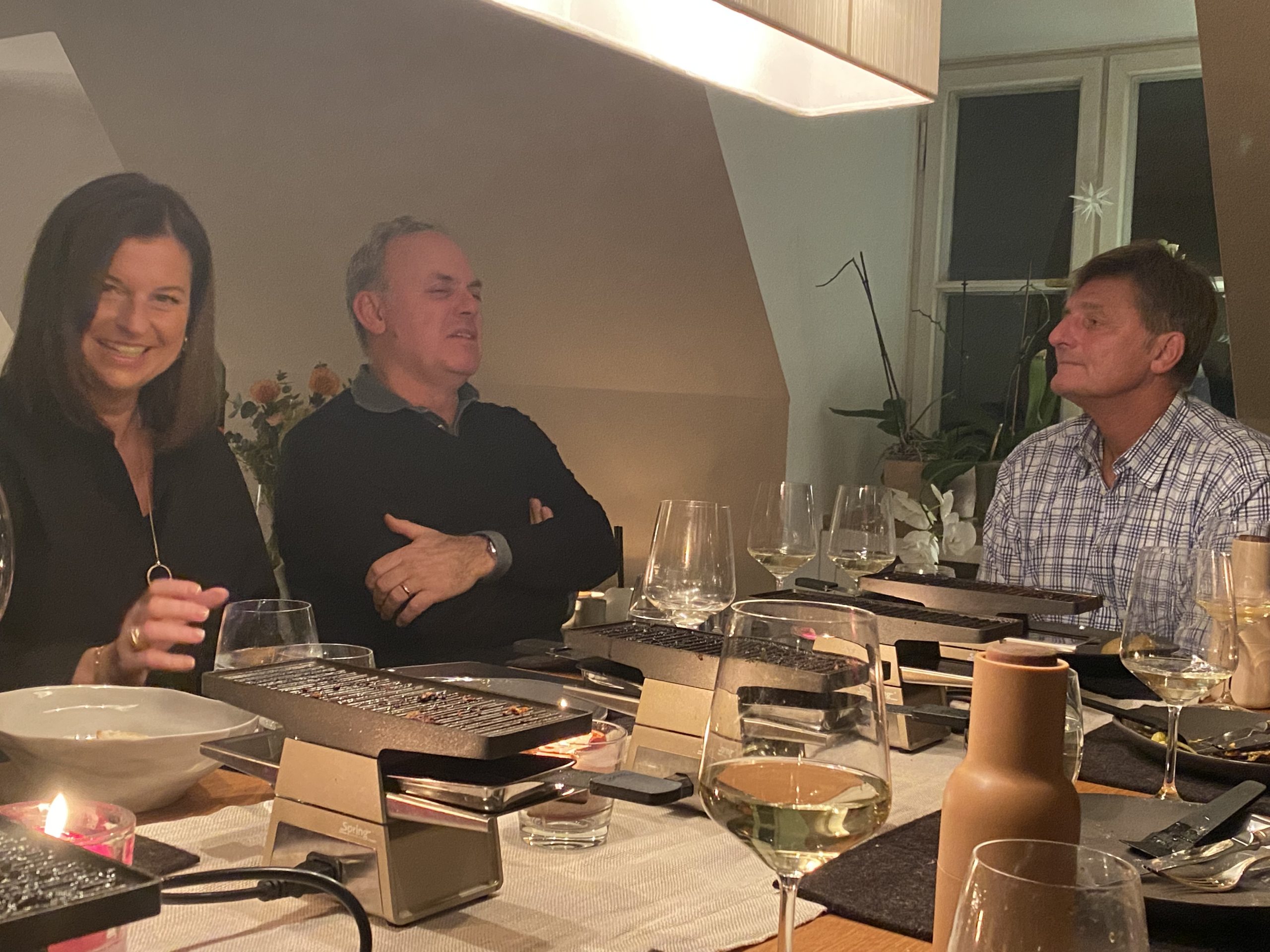 ... und auf der anderen Seite des Tisches geniessen Jürgen, Markus und Nani die möglichen Varianten bei der optimalen Zusammenstellung des Grill- und Schmelzgutes