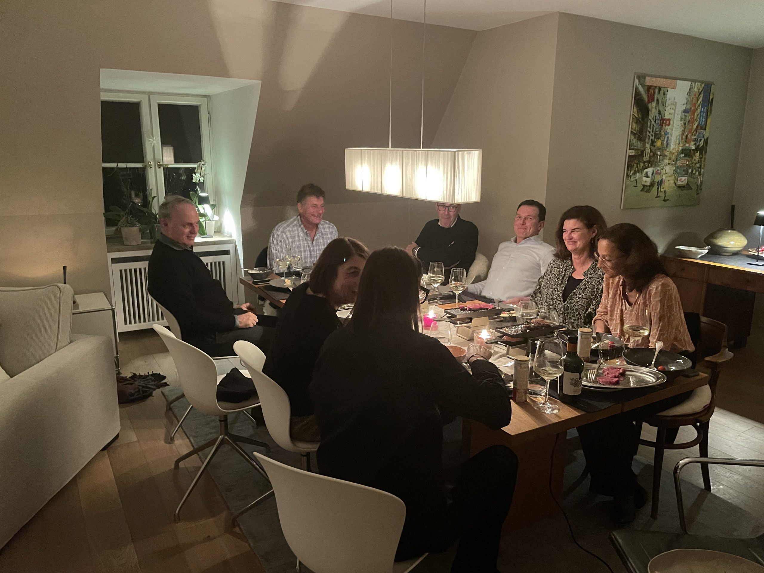 Zu ihrem 55. Geburtstag lädt Annette am 3. Dezember einige unserer engeren Freunde sowie ihre beiden Schwestern zu einem gemütlichen Raclette Essen in die Möhlstrasse ein. Mit insgesamt 10 Personen verbringen wir einen lustigen gemeinsamen Abend bei köstlichem Essen und entsprechend alkoholischer Begleitung. Beim Raclette finde ich immer angenehm, daß man durch die eigene Versorgung bzw. die persönliche Verantwortung für den selbst auf den kleinen Grills zu organisierenden Essens-Nachschub immer wieder Pausen hat. Dadurch hat man dann aber auch ständig Zeit zum Reden, da nicht alle gleichzeitig essen. Die Zungen waren dank dem Verzehr von zehn Flaschen Weißwein bzw. Champagner zudem recht gelöst. Trotzdem fuhren alle Gäste selber mit ihren Autos heim. Wir sollten zukünftig - wie bei einem Essen bei Nina und Herbert am Wochenende zuvor - eine ständige private Alkoholkontrolle einführen, bei der die Fahrer jeweils wissen, wo sie mit ihrem Blutalkoholwerten gerade jeweils stehen. Raclette ist übrigens sowohl der Name eines beliebten Kuhmilchkäses als auch der Name der bekannten warmen Gerichts, das wie das Käsefondue durch langsames Schmelzen von Käse entsteht. Der Name «Raclette» stammt vom französischen Walliserdialektwort (racler, das schaben heisst, da die an der Feuerglut gegrillte und geräucherte obere Schicht des halben Käselaibs mit einem Messer auf einen Teller oder ein Stück Brot abgeschabt wurde. Mit ihm wurde ab 1874 im Schweizer Kanton Wallis offiziell der entsprechende Käse benannt. Im Jahr 1909 wurde Raclette als nationales Walliser Gericht einer grösseren Öffentlichkeit bekannt. Die Bezeichnung «Raclette» für sich ist nicht geschützt, deshalb wird er heute über die Walliser Kantonsgrenzen hinaus auch in Teilen der übrigen Schweiz, Frankreichs, Österreichs, Deutschlands, Finnlands und der Vereinigten Staaten hergestellt. Von den über 14 000 Tonnen Raclette, die heutzutage in der Schweiz pro Jahr hergestellt werden, kommen rund 2000 Tonnen aus dem Kanton Wallis.