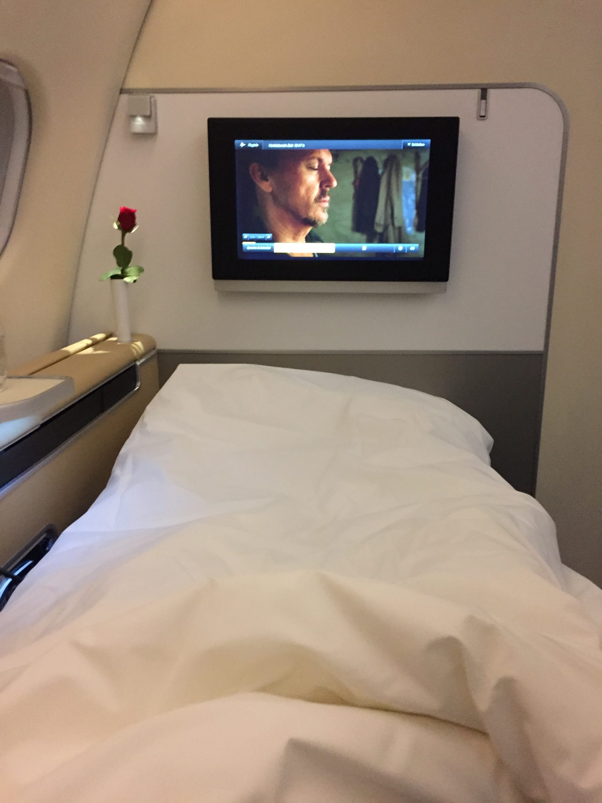 Das Bettchen ist gemacht ... der Film läuft und die Kabine wird sofort nach dem Start um Mitternacht abgedunkelt, wodurch man gut 8 bis 9 Stunden schlafen kann