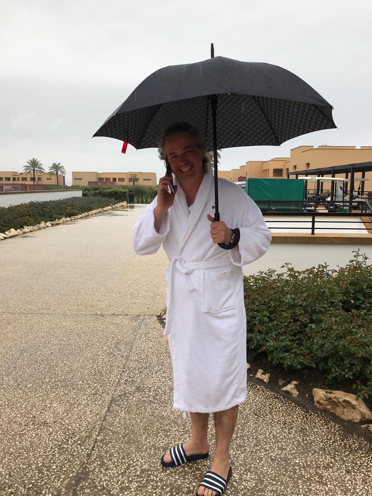 Wetterfrosch Jens checkt noch mal die internationale Regenschauer Vorhersage bevor er sich für das finale Outfit entscheidet