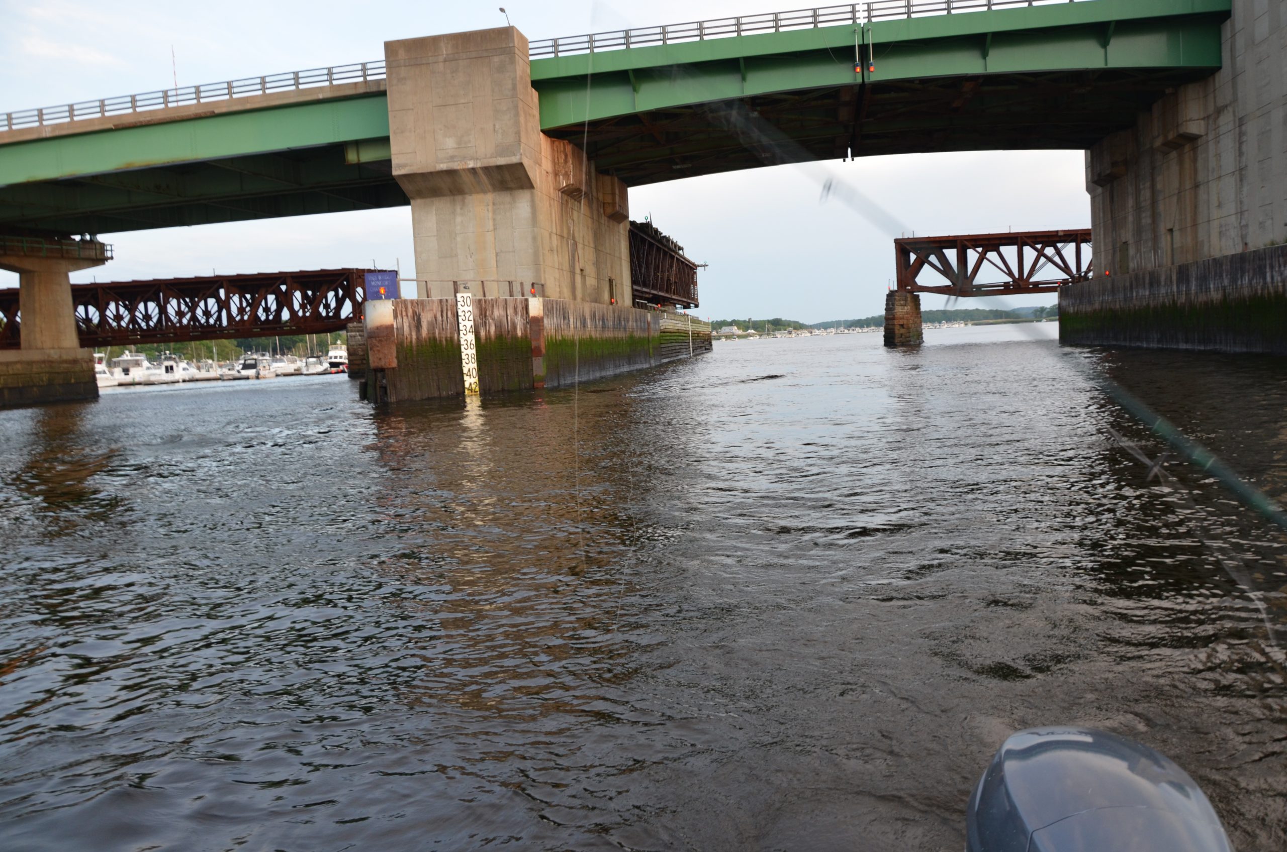 Auch unter der Brücke über den Fluss - die im übrigen die Staatsgrenze zwischen New Hampshire und Massachusetts bildet - stehen ziemlich große Barsche
