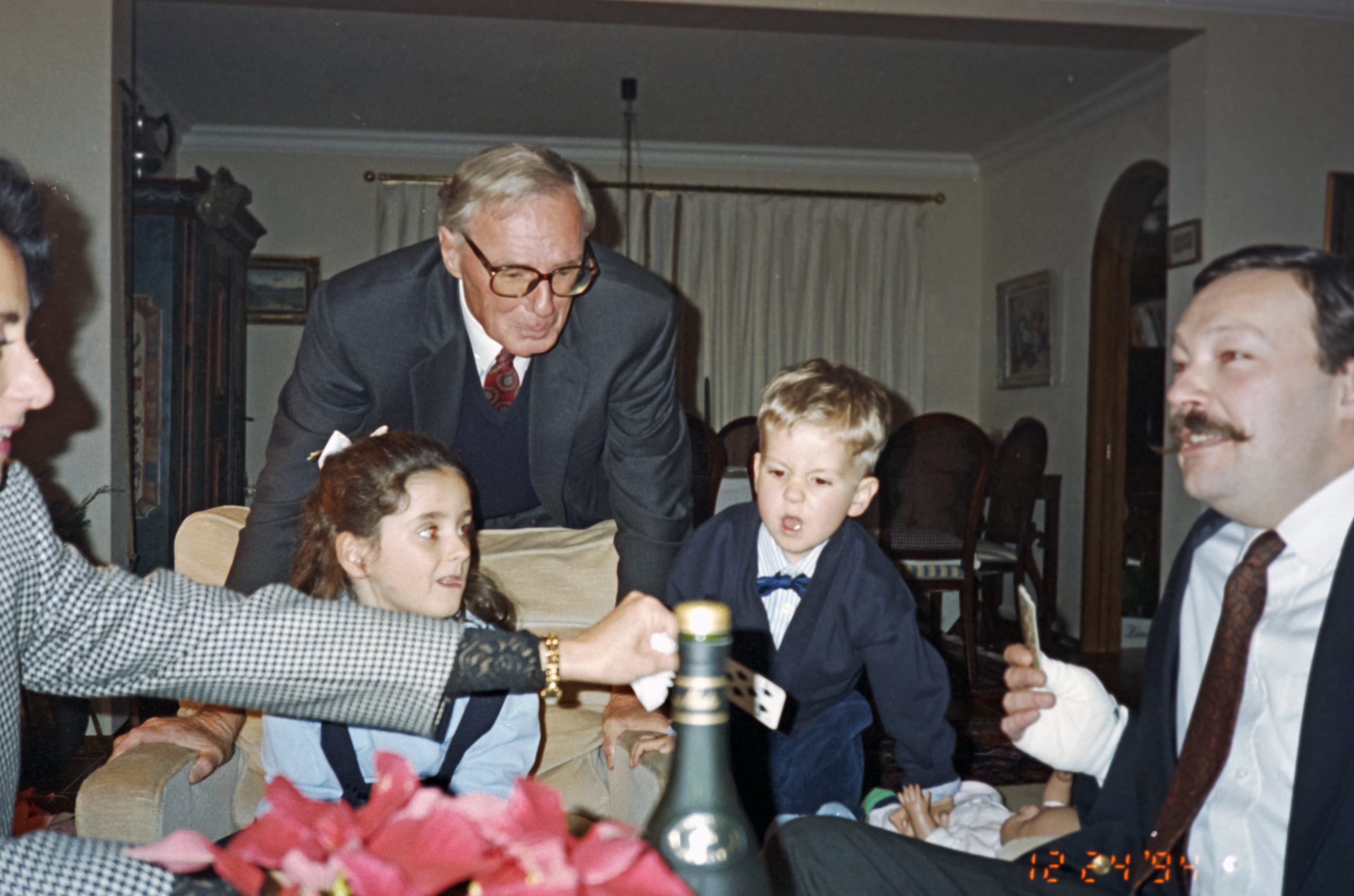 Den Heiligen Abend am 24. Dezember begehen wir in unseren Familien seit Jahrzehnten immer gleich. So treffen wir uns jeweils alle bei denjenigen, die das größte Haus haben – oder aber wie auch diesmal im Haus unserer Eltern - vor der Bescherung im Eßzimmer, um dort zum Einstieg in den Abend gemeinsam etwas Prickelndes zu trinken. Wenn es dunkel geworden ist geht es dann zur Bescherung an den beleuchteten Weihnachtsbaum ins Wohnzimmer. Für die in der Regel ja mitanwesenden Kids ist dies natürlich immer der mit Abstand aufregendste Teil des Abends, da es dann um Geschenke und erfüllte Wünsche geht. Bevor die verpackten Geschenke allerdings in einer kontrollierten Reihenfolge aufgemacht werden dürfen, steht wohlklingender gemeinsamer Gesang auf dem Plan. Mehr als drei Songs werden es in der Regel allerdings nicht, denn dazu fehlt es in unserer Familie einfach an Talent. Dennoch: „Stille Nacht ... Heilige Nacht sowie Oh Tannenbaum und vom Himmel hoch, da komm ich her“ haben wir aller ganz gut drauf und dann auch ein gutes Gefühl, wenn nach dem Gesang eine fast heilige Stimmung erreicht worden ist. Alle Eltern freuen sich im Anschluss über die strahlenden Gesichter glücklicher Kinder und danach auf ein schönes gemeinsames Abendessen, was von Oma Uta großartig gekocht und perfekt vorbereitet ist. Unsere Kids Paul, Larissa und Severin verwechseln zwar dann am 1. Weihnachtsfeiertag, als auch noch die Familie Köstler zu uns stößt mit Fasching und verkleiden sich aus der Requisite von Oma Uta ... dafür ist die Stimmung perfekt.