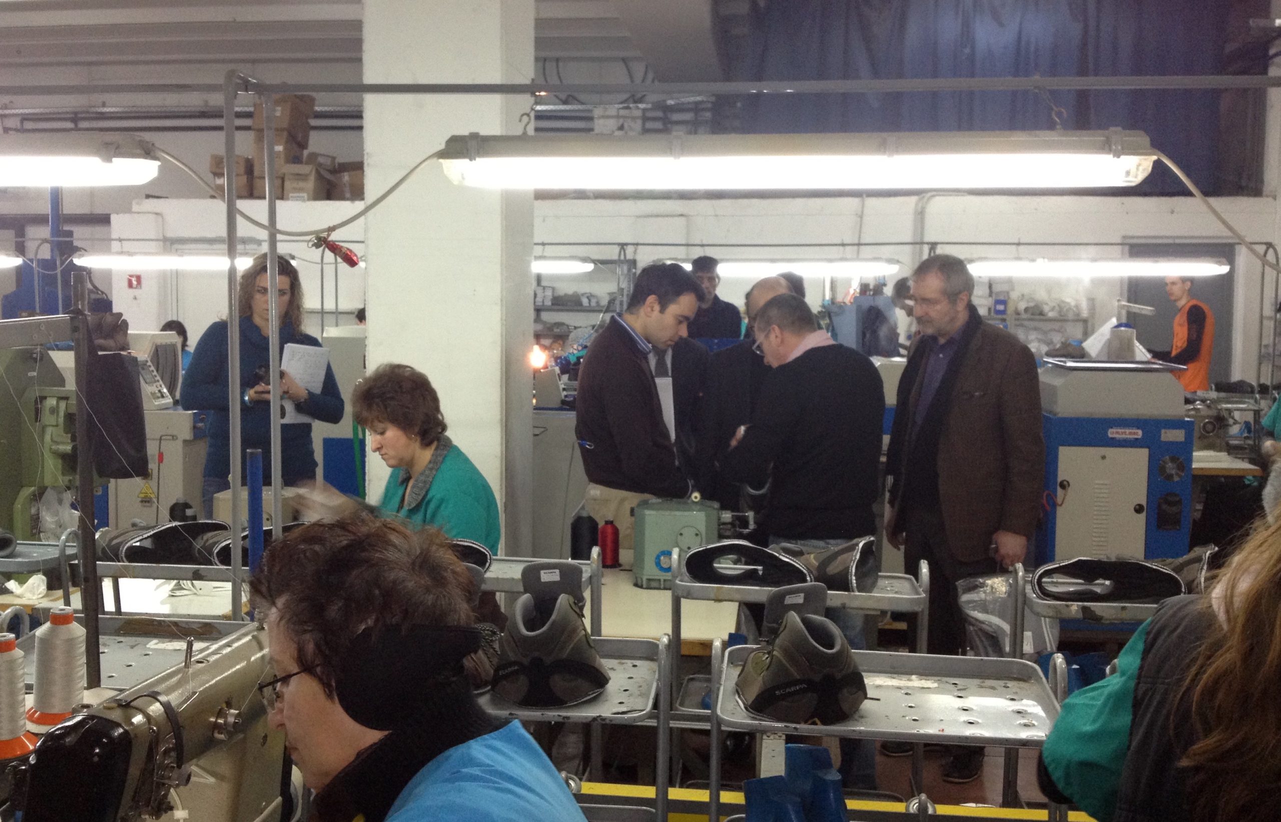 Die Schuhe werden in verschiedenen Arbeitsschritten von Hand gefertigt. Hier überzeugen sich die Einkäufer der französische Post von der Qualität der hier gefertigten Arbeitsschuhe.