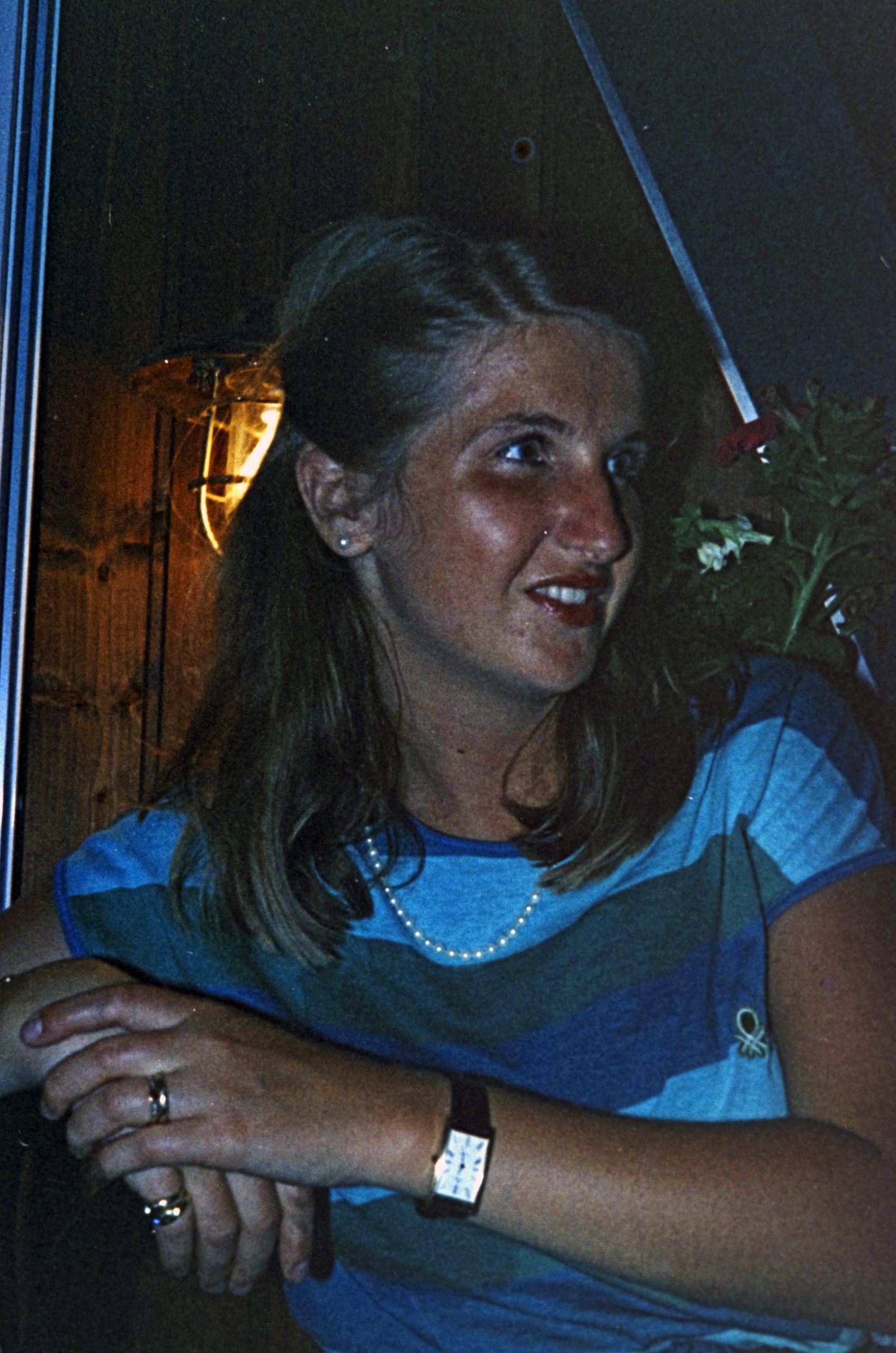 Nici, ganz Tochter aus gutem Hause, trägt mit Anmut Perlenkette, Cartieruhr und das damals schwer angesagte Benetton Shirt. Die goldenen Ringe mit den Cabochons nicht zu vergessen!