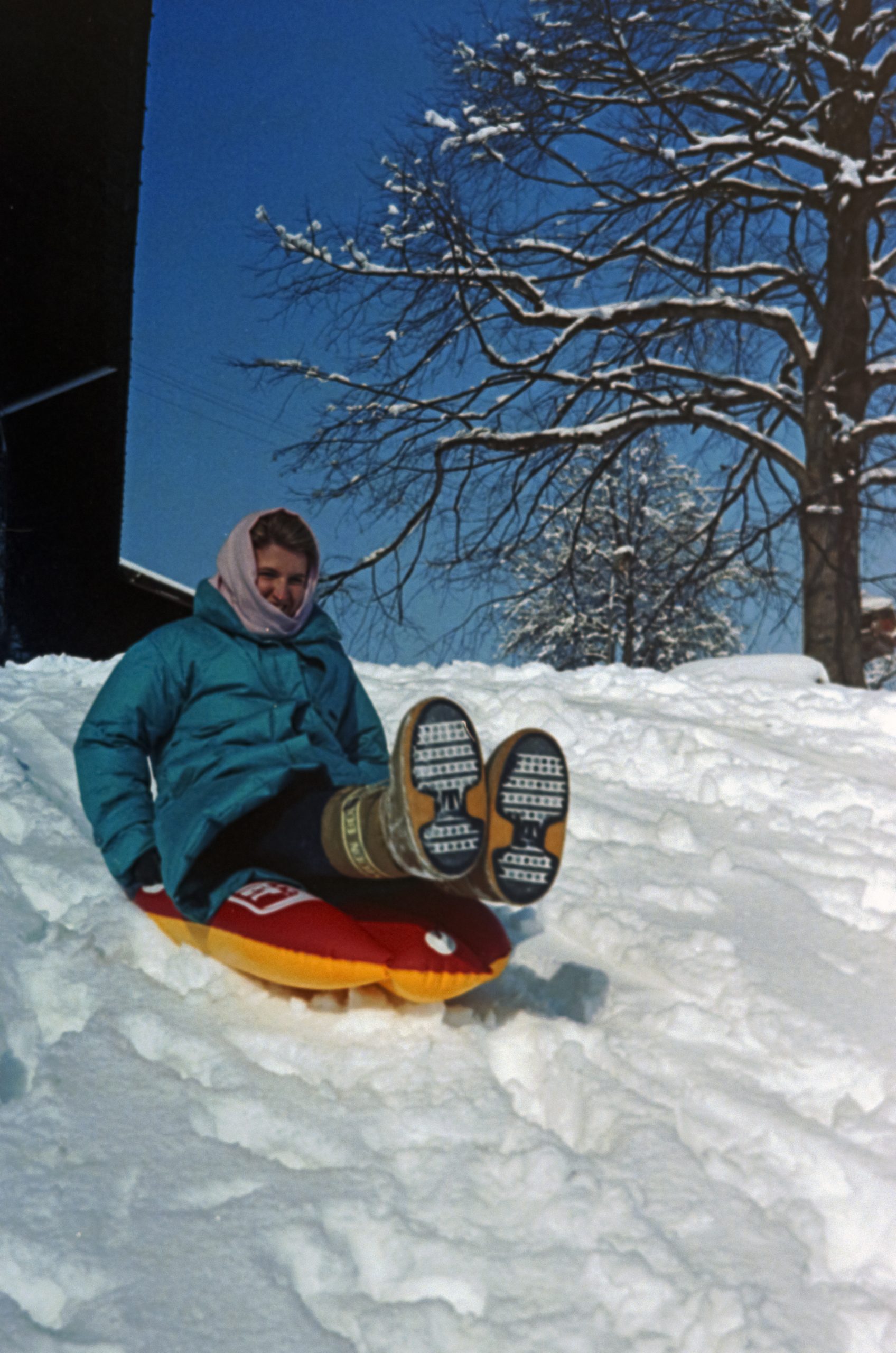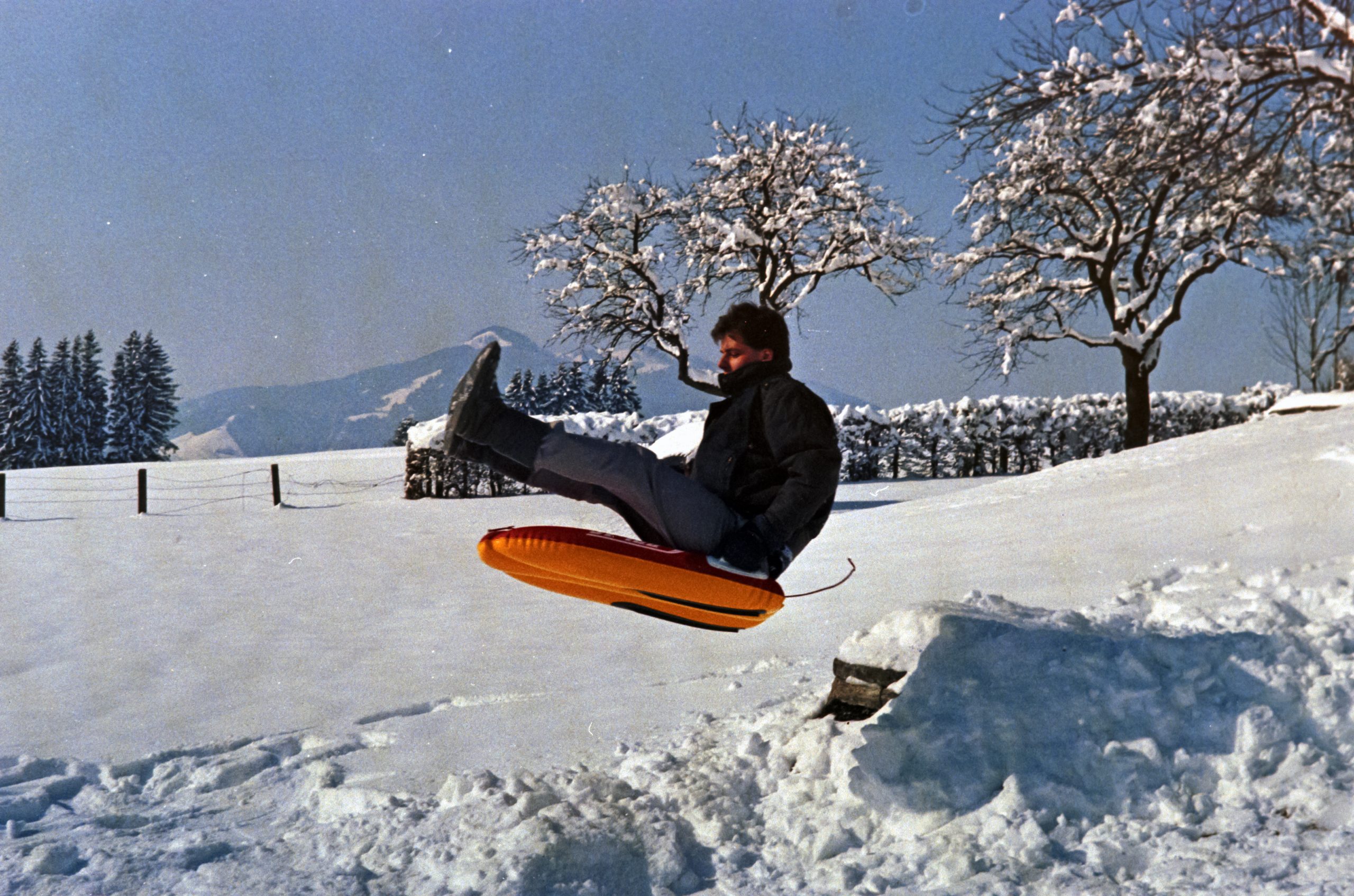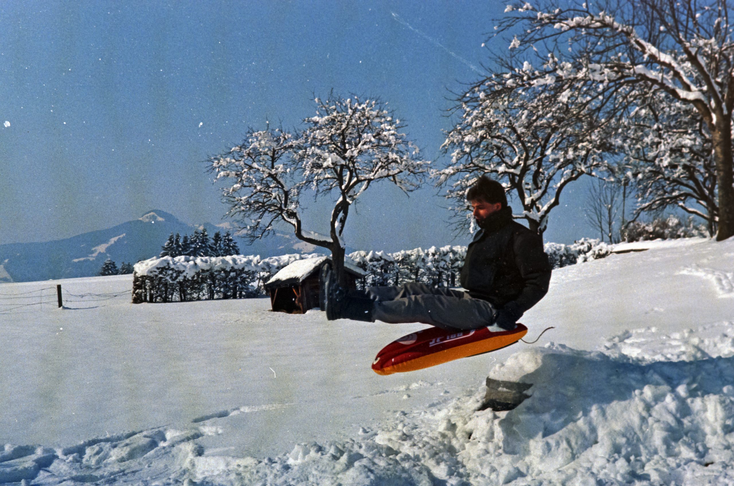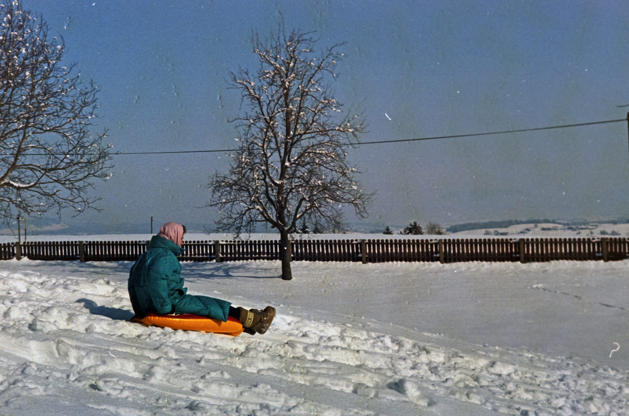 Der Hang vor dem Wohnzimmer ist zwar nicht besonders lang, aber zu etwas Spaß im Schnee immer geeignet