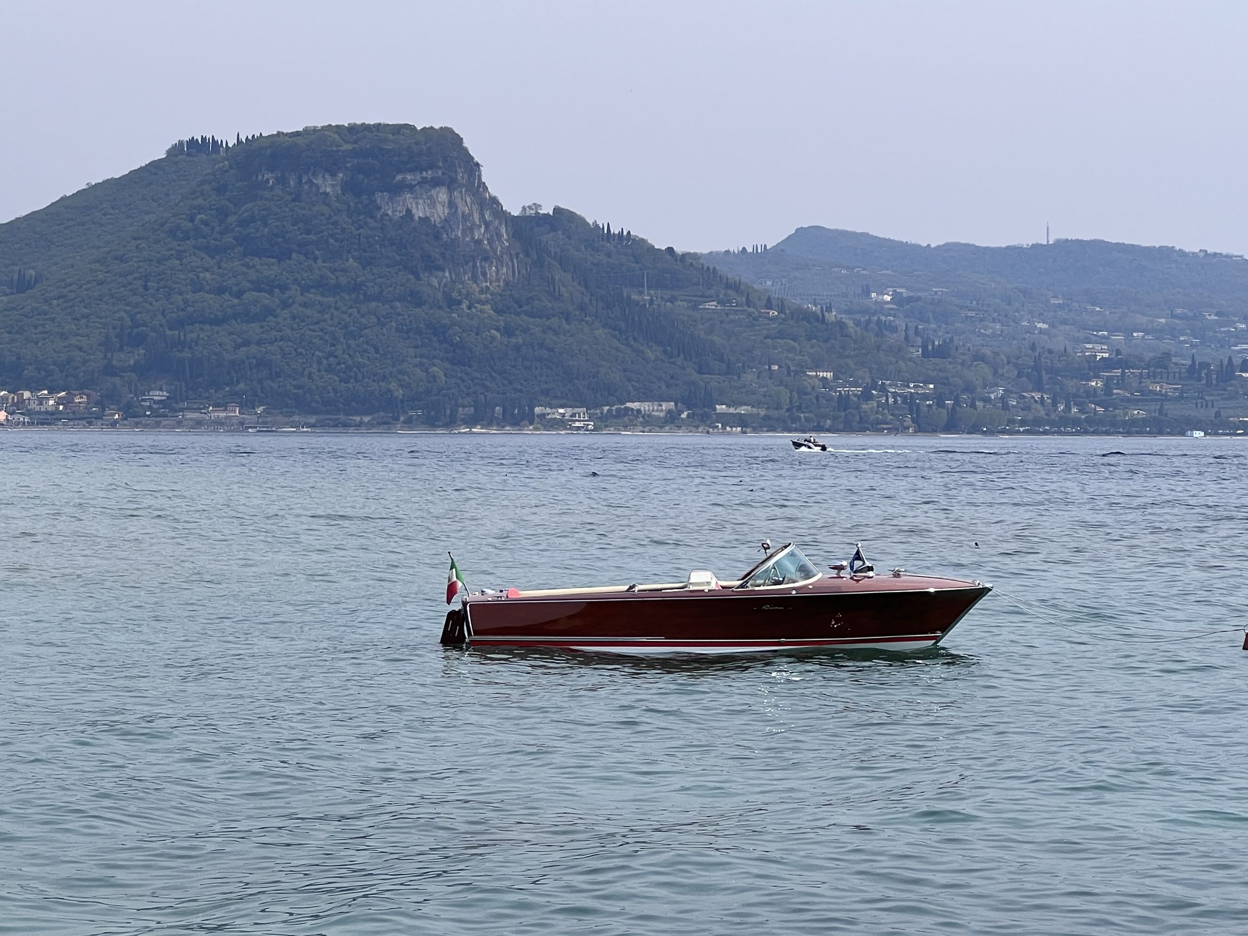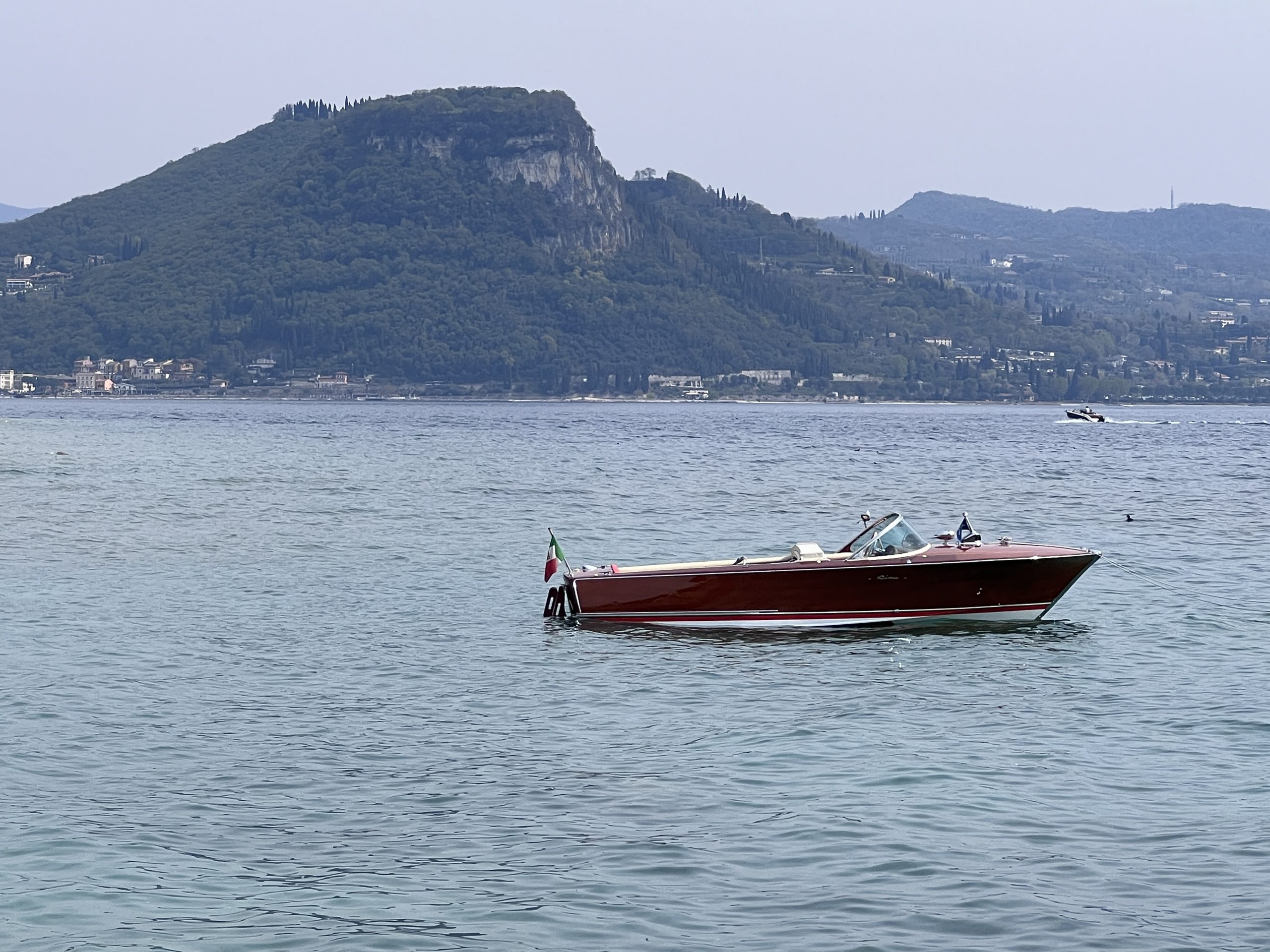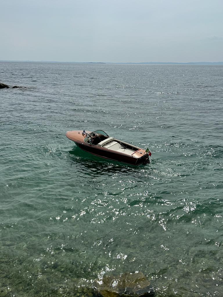 Am Dienstag nach dem Osterwochenende starte ich bei schönem Wetter und circa 20° Außen-Temperatur die diesjährige Gardasee Bootssaison und lasse die Riva Super Florida nach der im Winter durchgeführten Komplett Restaurierung erstmals wieder im Centro Nautico ins Wasser legen. Mit Mathias Gehrckens und Family habe ich mich zu einer Tour nach San Vigilio verabredet, wo wir auch Heike und Christian Neu mit ihren Kids treffen. Die Punta San Vigilio ist eine kleine Landzunge am Gardasee zwischen Garda und Torri del Benaco am Fuße des Monte Baldo und ragt nach der Halbinsel Sirmione am weitesten in den See hinaus. Die Punta, italienisch für Punkt bzw. Spitze, besteht heute aus der Villa Guarienti di Brenzone, der Locanda San Vigilio mit einer Kirche gleichen Namens und einem kleinen Hafen mit Hotel, Restaurant und Taverne auf einer Mole. Im Norden schließt sich die Baia delle Sirene an, die als Bucht der Sirenen als schönste Badebucht des ganzen Sees gilt. Mit seinen Tischen entlang dem kleinen Hafen ist die Taverne ein charmanter Ort, um sich bei einem Drink zu entspannen und den wunderbaren Seeblick zu genießen. Während des Tages erhält man Erfrischungen und kleine Snacks und abends, wenn der Sonnenuntergang den Himmel färbt und das Wasser in Regenbogenfarben strahlt, ist es richtig romantisch. Das schöne Restaurant befindet sich in einem eleganten Speisesaal mit Sitzgelegenheiten am Wasser und serviert traditionelle italienische Gerichte, die mit frischen Produkten der Saison zubereitet werden. Im Sommer kann man im Innenhof mit der Kirche San Vigilio aus dem 15. Jahrhundert ausgezeichnet essen. Die intime Umgebung bietet einen herrlichen Blick auf den See mit spektakulären Sonnenuntergängen, die man von jedem Tisch aus sieht. Nach unserem Trip ans Ostufer picke ich meinen Neffen Justus am Casino auf und drehe eine Runde nach Toscolano und Salò mit ihm. Anschließend geht es auf eine Runde Eis ins Cafe Vasalli