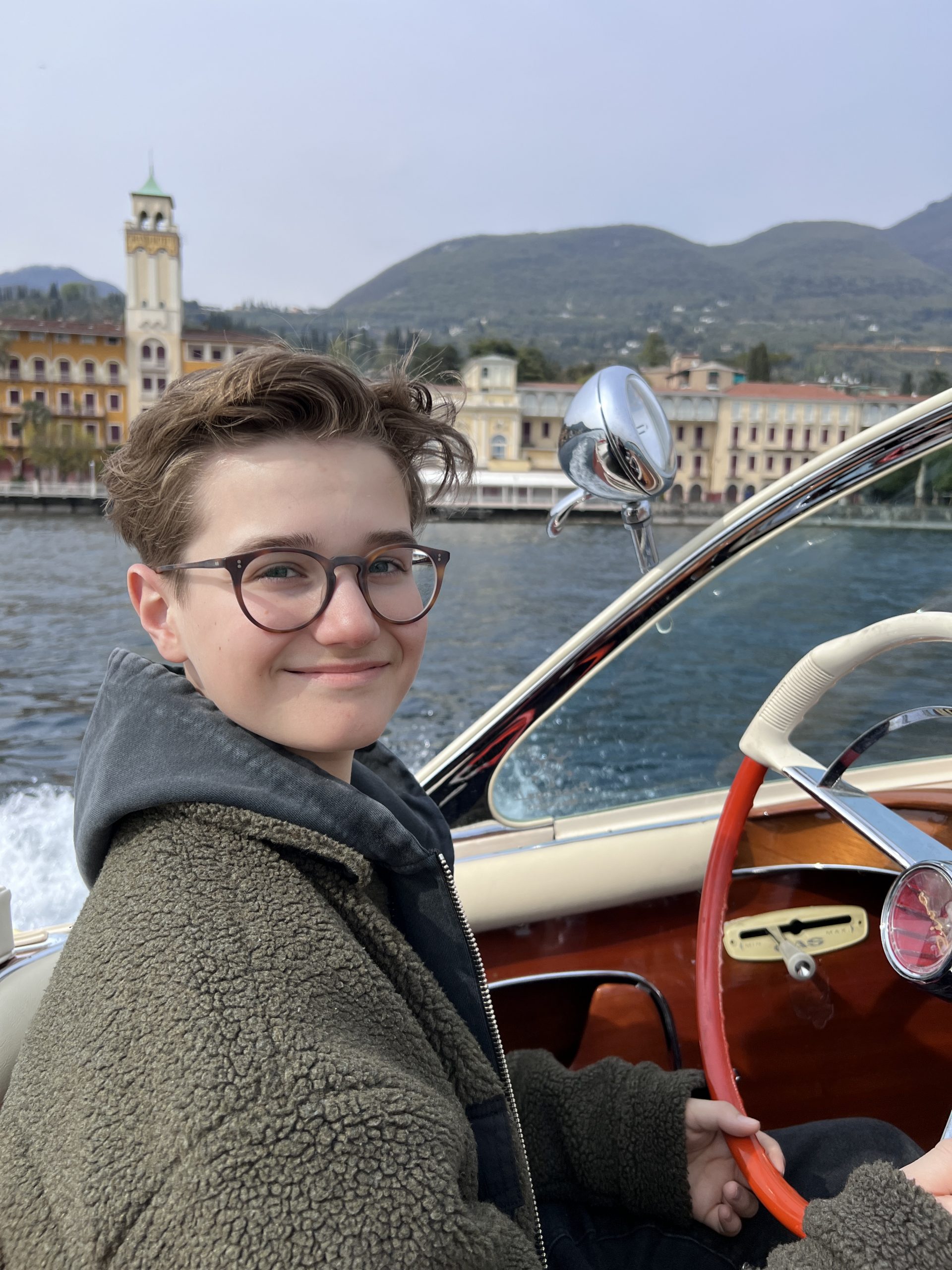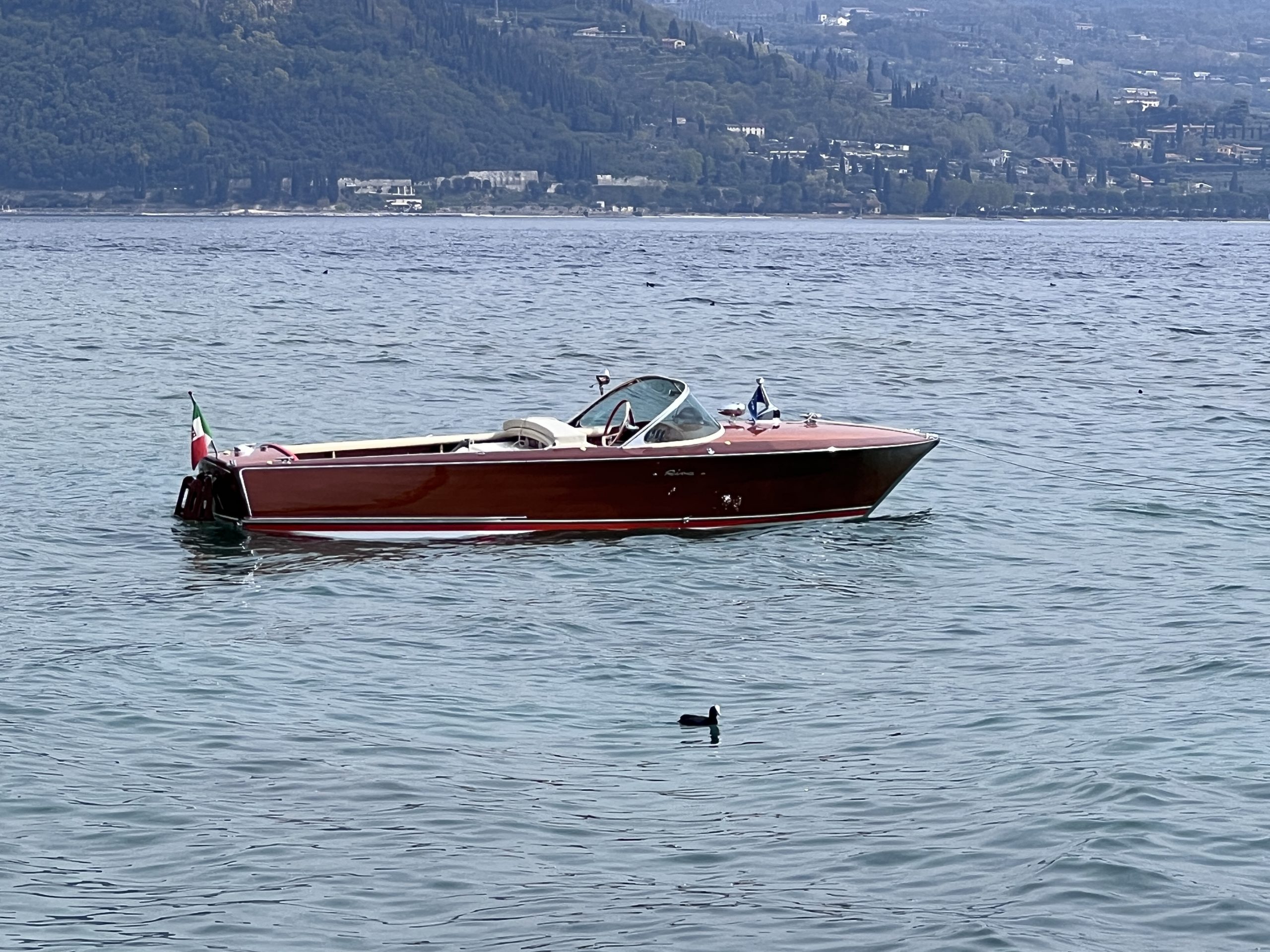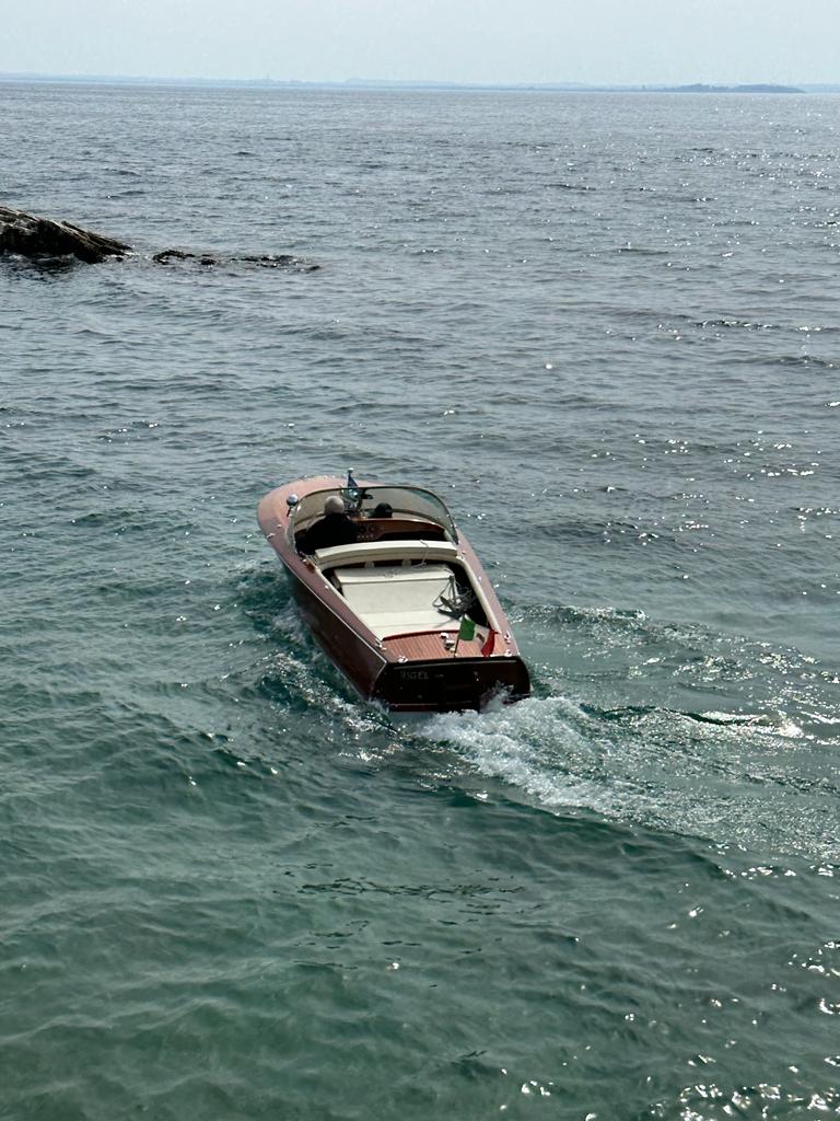 Am Dienstag nach dem Osterwochenende starte ich bei schönem Wetter und circa 20° Außen-Temperatur die diesjährige Gardasee Bootssaison und lasse die Riva Super Florida nach der im Winter durchgeführten Komplett Restaurierung erstmals wieder im Centro Nautico ins Wasser legen. Mit Mathias Gehrckens und Family habe ich mich zu einer Tour nach San Vigilio verabredet, wo wir auch Heike und Christian Neu mit ihren Kids treffen. Die Punta San Vigilio ist eine kleine Landzunge am Gardasee zwischen Garda und Torri del Benaco am Fuße des Monte Baldo und ragt nach der Halbinsel Sirmione am weitesten in den See hinaus. Die Punta, italienisch für Punkt bzw. Spitze, besteht heute aus der Villa Guarienti di Brenzone, der Locanda San Vigilio mit einer Kirche gleichen Namens und einem kleinen Hafen mit Hotel, Restaurant und Taverne auf einer Mole. Im Norden schließt sich die Baia delle Sirene an, die als Bucht der Sirenen als schönste Badebucht des ganzen Sees gilt. Mit seinen Tischen entlang dem kleinen Hafen ist die Taverne ein charmanter Ort, um sich bei einem Drink zu entspannen und den wunderbaren Seeblick zu genießen. Während des Tages erhält man Erfrischungen und kleine Snacks und abends, wenn der Sonnenuntergang den Himmel färbt und das Wasser in Regenbogenfarben strahlt, ist es richtig romantisch. Das schöne Restaurant befindet sich in einem eleganten Speisesaal mit Sitzgelegenheiten am Wasser und serviert traditionelle italienische Gerichte, die mit frischen Produkten der Saison zubereitet werden. Im Sommer kann man im Innenhof mit der Kirche San Vigilio aus dem 15. Jahrhundert ausgezeichnet essen. Die intime Umgebung bietet einen herrlichen Blick auf den See mit spektakulären Sonnenuntergängen, die man von jedem Tisch aus sieht. Nach unserem Trip ans Ostufer picke ich meinen Neffen Justus am Casino auf und drehe eine Runde nach Toscolano und Salò mit ihm. Anschließend geht es auf eine Runde Eis ins Cafe Vasalli