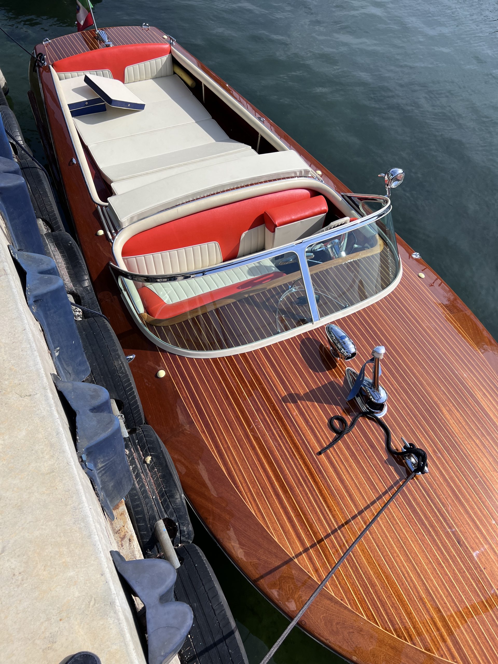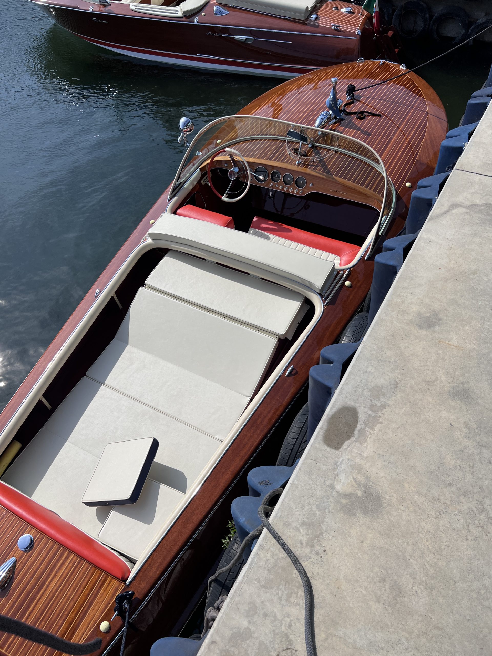 Die umfassend - Unterboden, Spiegel, Lack und Polsterung - frisch restaurierte Rigel im "Niedrig Wasser Hafenbecken" des Centro Nautico von Alberto Arcangeli in Salò