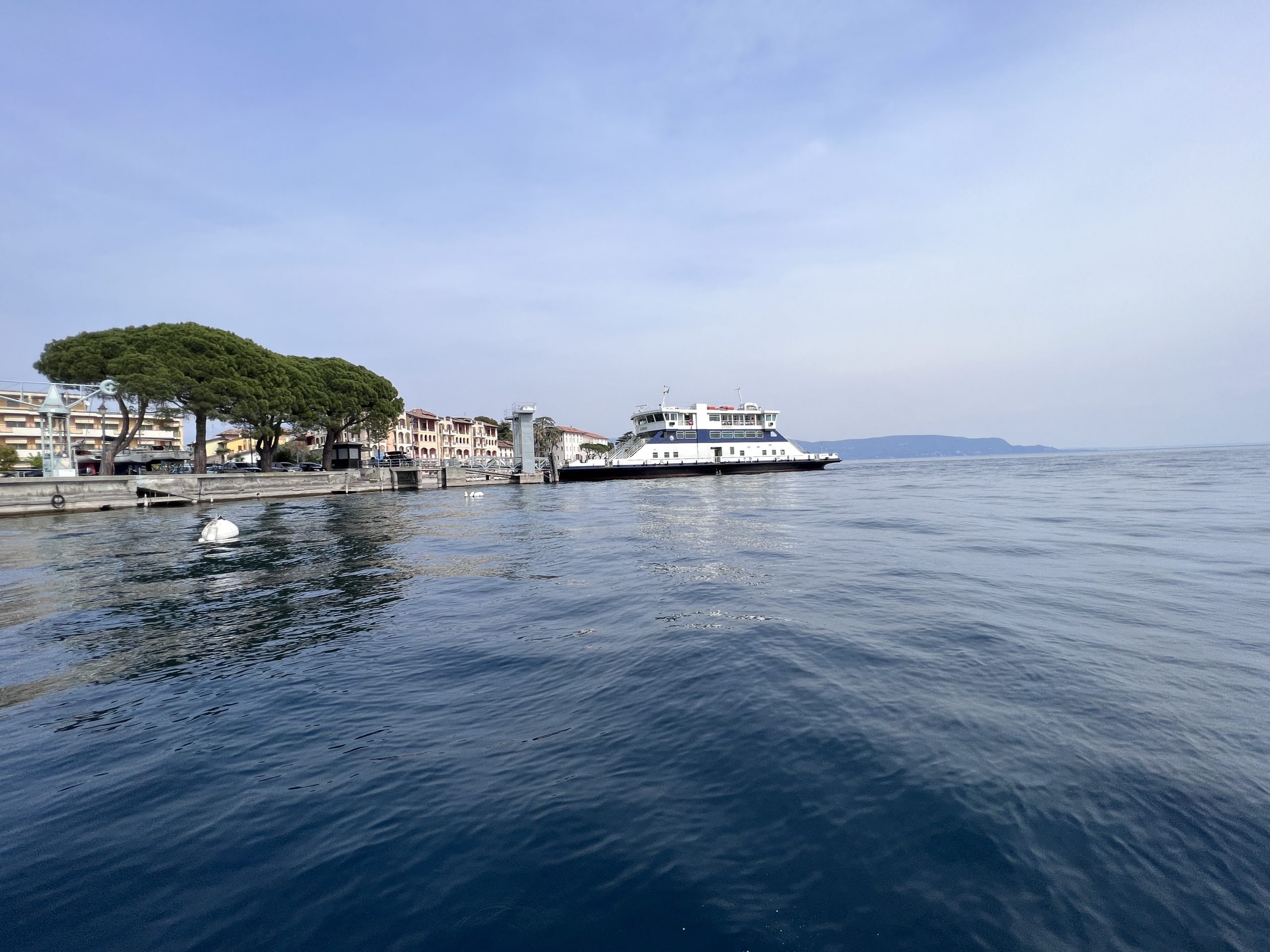 Die Gardasee Schiffahrt ist bereits wieder im Betrieb und diese Fähre spukt eine große Ladung Autos aus, die von Torri de Benaco gekommen sind