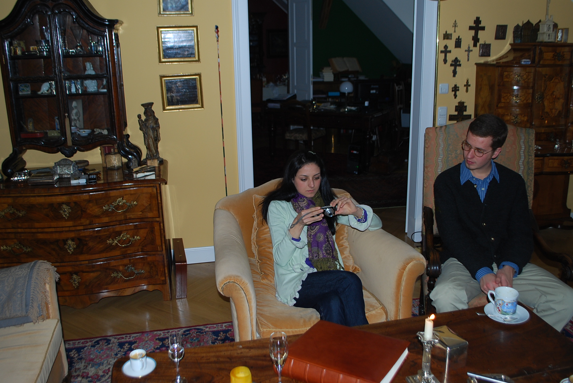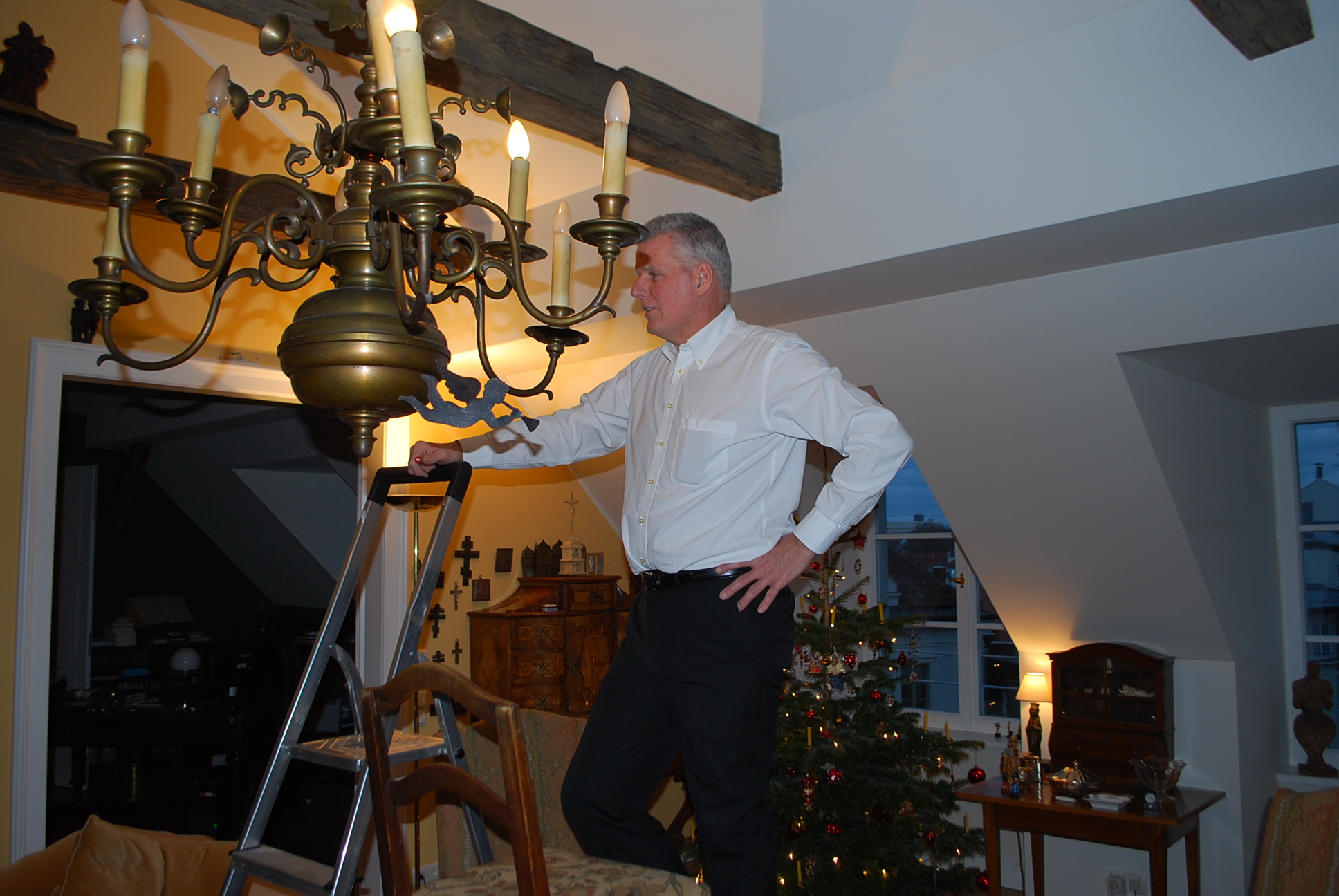 Das Weihnachtsfest und dabei besonders den Heiligen Abend am 24. Dezember begehen wir in unseren Familien seit Jahrzehnten eigentlich immer gleich. So treffen wir uns jeweils alle bei denjenigen, die den meisten Platz, bzw. das größte Haus haben – in der Regel waren das früher immer unsereEltern - vor der Bescherung im Eßzimmer, um dort zum Einstieg in den Abend gemeinsam etwas Prickelndes zu trinken. Wenn es dunkel geworden ist geht es dann zur Bescherung an den beleuchteten Weihnachtsbaum ins Wohnzimmer. Für die in der Regel ja mitanwesenden Kids ist dies natürlich immer der mit Abstand aufregendste Teil des Abends, da es dann um Geschenke und erfüllte Wünsche geht. Bevor die verpackten Geschenke allerdings in einer kontrollierten Reihenfolge aufgemacht werden dürfen, steht wohlklingender gemeinsamer Gesang auf dem Plan. Mehr als drei Songs werden es in der Regel allerdings nicht, denn dazu fehlt es in unserer Familie einfach an Talent. Dennoch: „Stille Nacht ... Heilige Nacht sowie Oh Tannenbaum und vom Himmel hoch, da komm ich her“ haben wir aller ganz gut drauf und dann auch ein gutes Gefühl, wenn nach dem Gesang eine fast heilige Stimmung erreicht worden ist. Die Eltern freuen sich im Anschluss über die strahlenden Gesichter glücklicher Kinder und danach auf ein schönes gemeinsames Abendessen ... in gefühlten 100% der Fälle ist es ein köstliches Fondue. Diesmal waren wir bei Uli & Adam in ihrer schönen großen Wohnung am Max-Weber-Platz 1 in Haidhausen. Larissa und Paul waren bei dem netten Fest am 1. Weihnachtsfeiertag auch mit dabei und Michael hängte - als talentierter Handwerker dafür bestens prädestiniert - einen großen alten Leuchter an der Decke des Wohnzimmers auf.