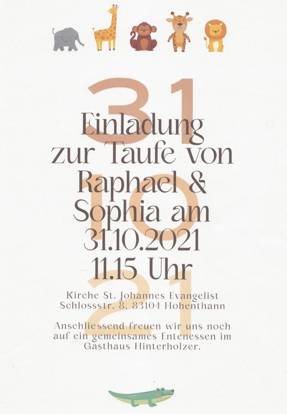 Am letzten goldenen Oktobertag sind Annette und ich zur Taufe von Raphael und Sophia Schunda in der Kirche St. Johannes Evangelist in Hohenthann eingeladen. Im Anschluß an die feierliche Taufe, die von Diakon Bernd Stephan durchgeführt wurde, geniessen wir ein gemeinsames Entenessen im Gasthaus Hinterholzer. Es war ein herrlicher Tag im katholischen Oberbayern und durch die familiäre Zusammensetzung der Festgemeinde wussten alle Teilnehmer was sie zu erwarten haben: Ordentlich getauft, gehört man bereits zur Gemeinschaft der Christen. Aber obwohl die Taufe alle Christen vereint und sie die wesentlichen Punkte ihres Glaubens teilen, gibt es eine Vielzahl von Kirchen und Gemeinschaften, die sich auch in manchen wichtigen Punkten ihres Glaubens und darin, wie sie diesen leben und feiern, unterscheiden. So haben auch der katholische Glaube und das Leben in der katholischen Kirche ihre ganz besondere Prägung. Jedoch gibt es auch immer wieder Menschen, die die Schätze des katholischen Glaubens und Lebens für sich entdecken, auch wenn Sie einer anderen Konfession angehören oder angehört haben, wie ich selber gut weiß. Die heutige Taufe des jüngsten Schunda Nachwuchs wurde durch den in Hohenthann gerade neu angekommenen Diakon Bernd Stephan sehr flott und direkt umgesetzt und war keine Sekunde langweilig. Und das nette Lied vom kleinen Senfkorn Hoffnung hat Nani ganz hervoragend gesungen und der Rest der anwesenden Gemeinde brav mitgebrummt ...