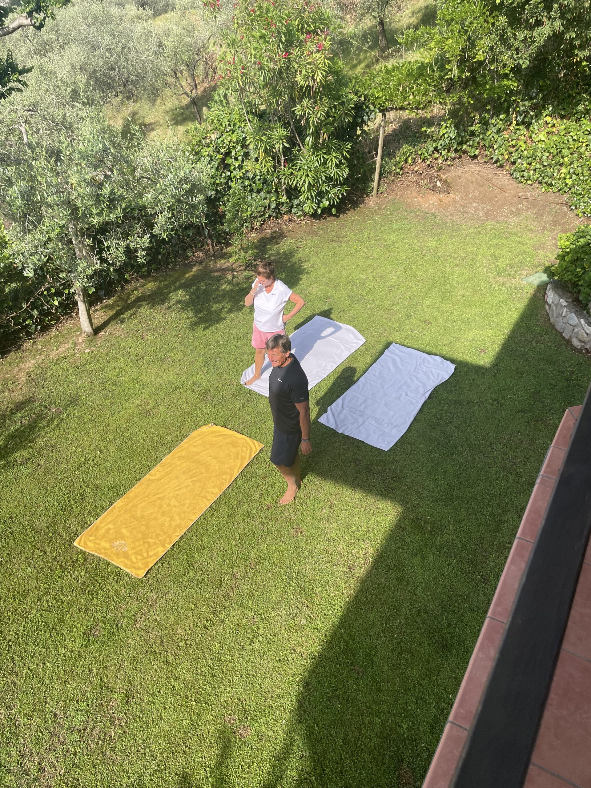 Als Chef unserer kleinen Yoga Gruppe mussten wir jeden Morgen die fünf Tibeter in den Garten stemmen