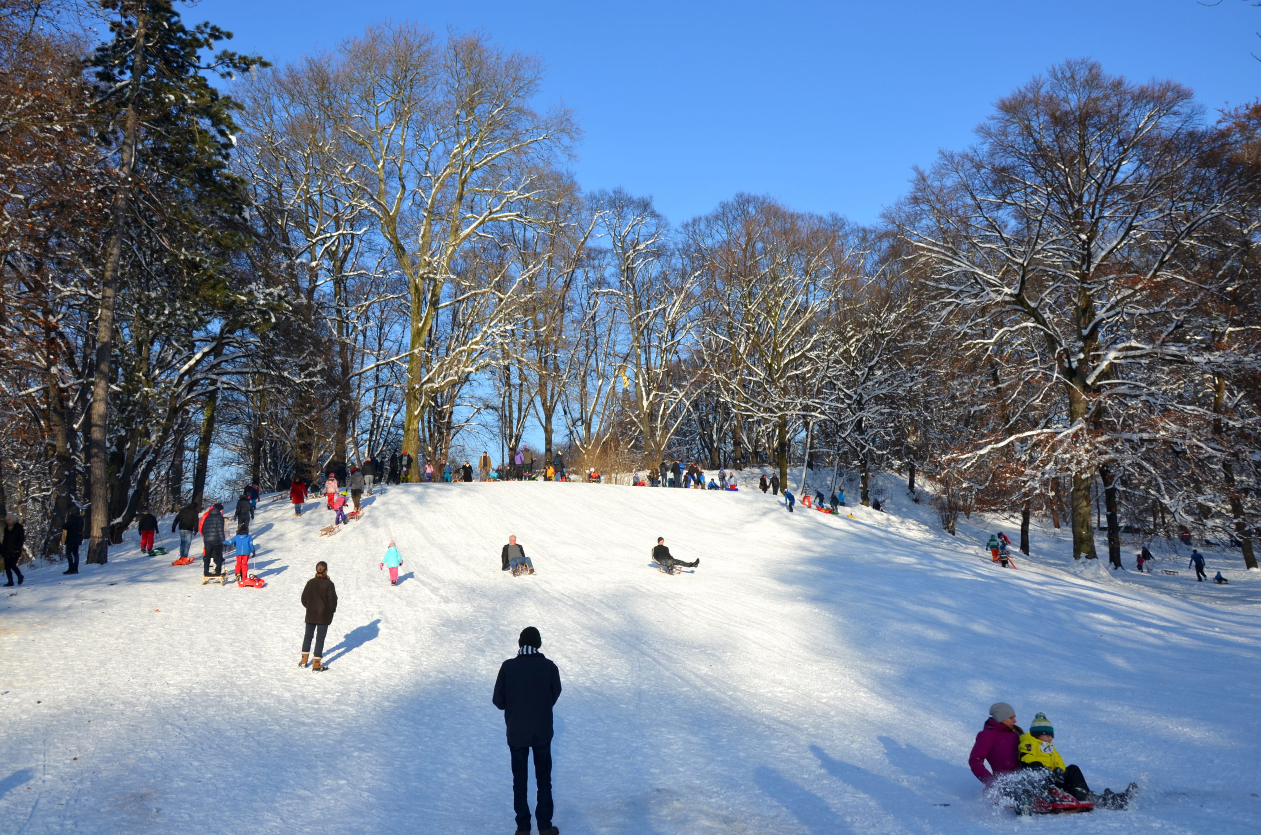 Eine Winterwunderwelt, wie auf einem Wintergemälde von Pieter Bruegel. In den Maximiliansanlagen finden sich schöne Hügel zum Schlittenfahren. Durch die Nähe zu den Stadtteilen Haidhausen, Bogenhausen und Lehel ist hier im Winter einiges los. Direkt beim Maximilianeum warten passende Abhänge für erfahrene und unerfahrene Schlittenfahrer.
