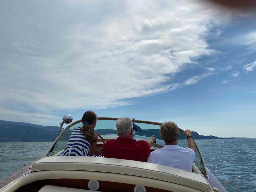 Es macht immer wieder Freude, mit Freunden gemütlich auf dem Gardasee zu cruisen und manchmal auch mehr als das. Es darf auch zuweilen etwas schneller sein. Besonders die Kinder unserer befreundeten Gäste haben daran ihre Freude, es kann oftmals gar nicht schnell genug gehen. Wenn die Gischt um den Bug spritzt, ist es erst richtig toll! Für uns ist auch ein sicherer Hafen, ein gutes Essen, ein leckeres Getränk, eine liebenswerte Gesellschaft und die unvergleichliche italienische Lebensart ein Gewinn und eine Bereicherung. Besonders freuen wie uns, wenn die Familie Lupfer an den See kommt ... im richtigen Leben Juweliere in Oberstdorf und Kempten. Als ausgewiesener Uhrenprofi ist Jürgen ein gern gesehener Kunde und längst guter Freund von uns geworden und mit seinen beiden Damen Caroline und Franca auch immer wieder gern in Gardone.