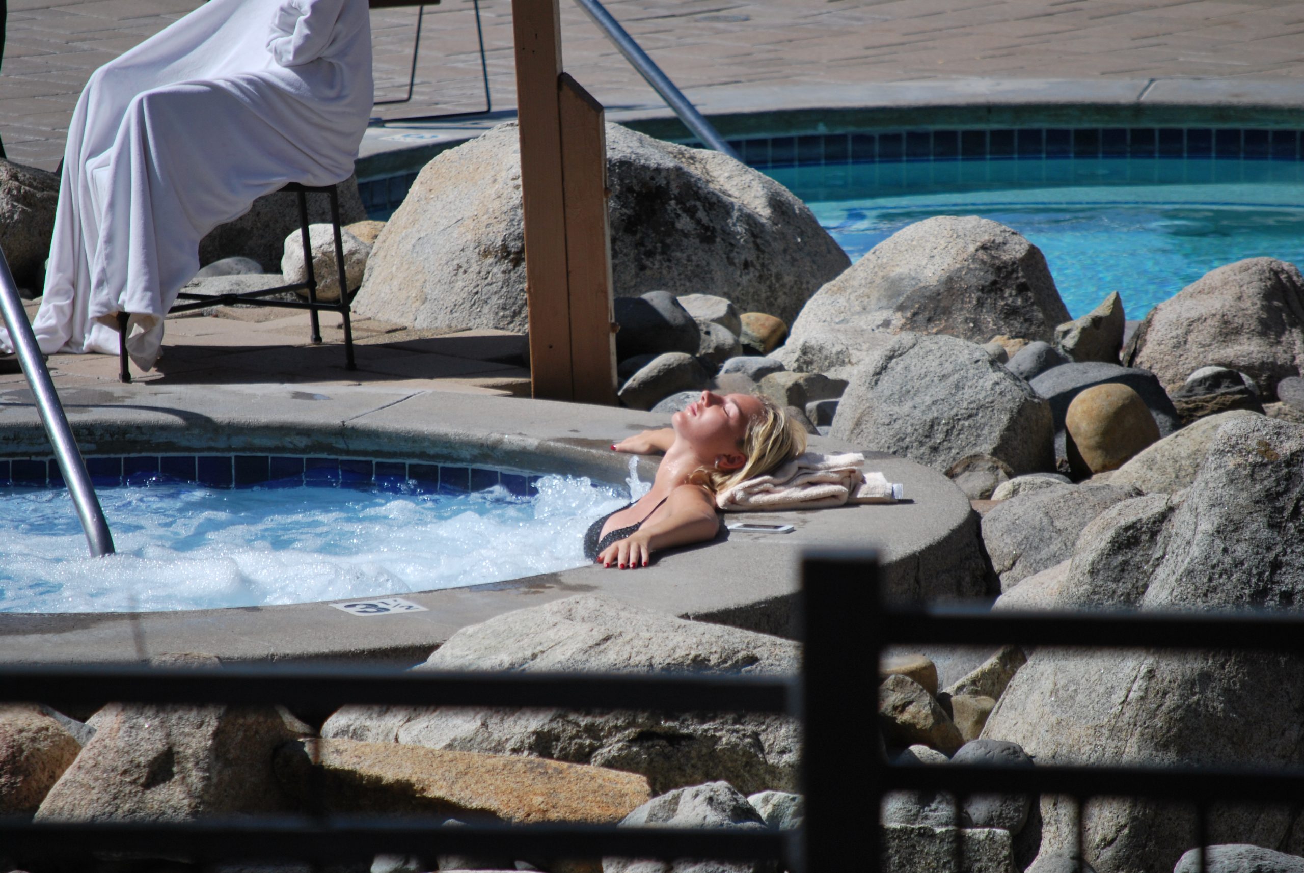 ... sowie bei der Beobachtung der Sonnen hungrigen blonden Dame im zweiten Jacuzzi