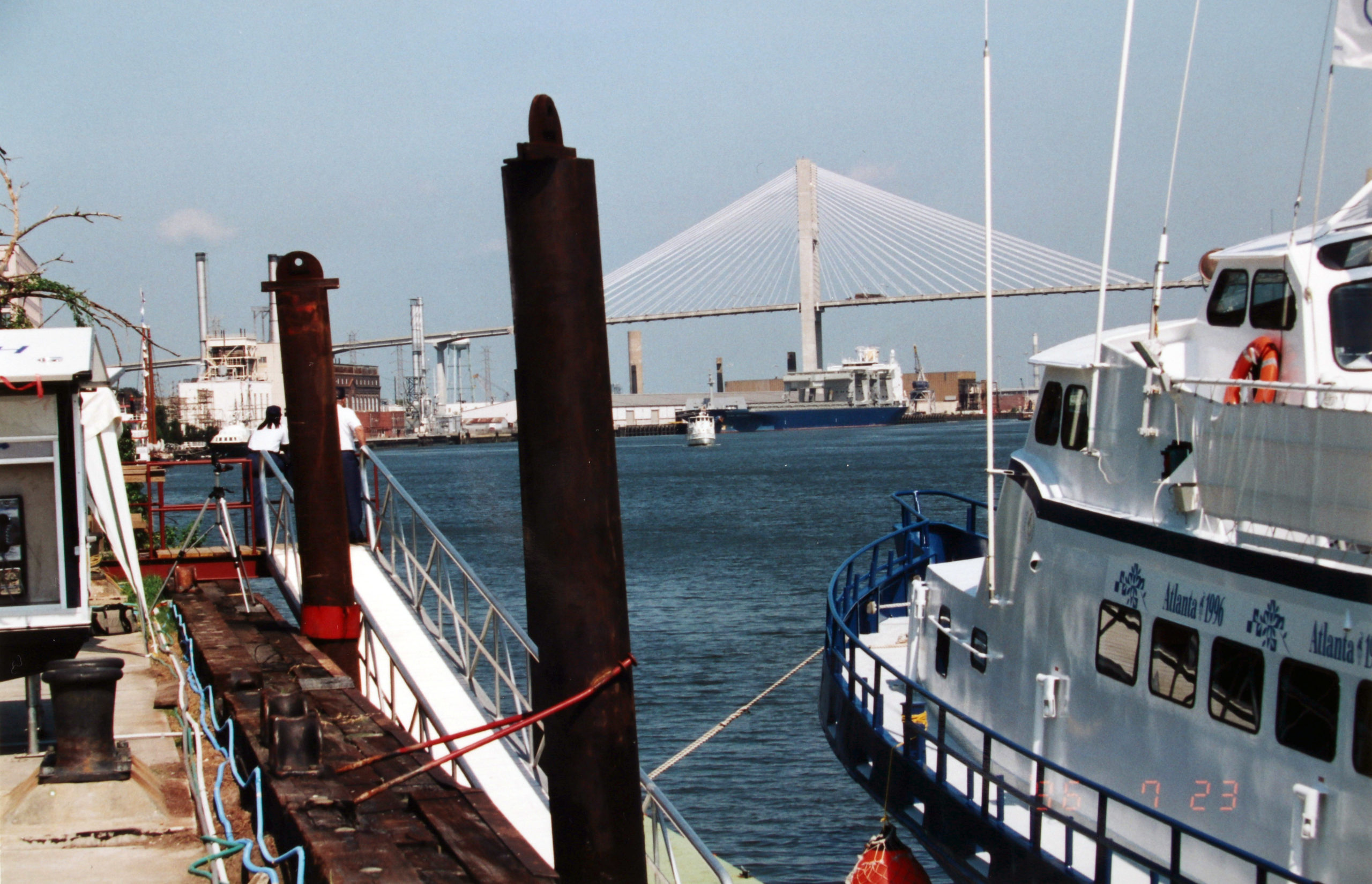 An den Kais der Hafenanlage in Savannah war Hochbetrieb und viele Mega Yachten aus der ganzen Welt im Rahmen der Olympischen Spiele zu Gast. Im Hintergrund ist die Talmadge Memorial Bridge zu sehen, eine beeindruckende Brücke, die den Savannah River zwischen der Innenstadt von Savannah, Georgia und Hutchinson Island überspannt.