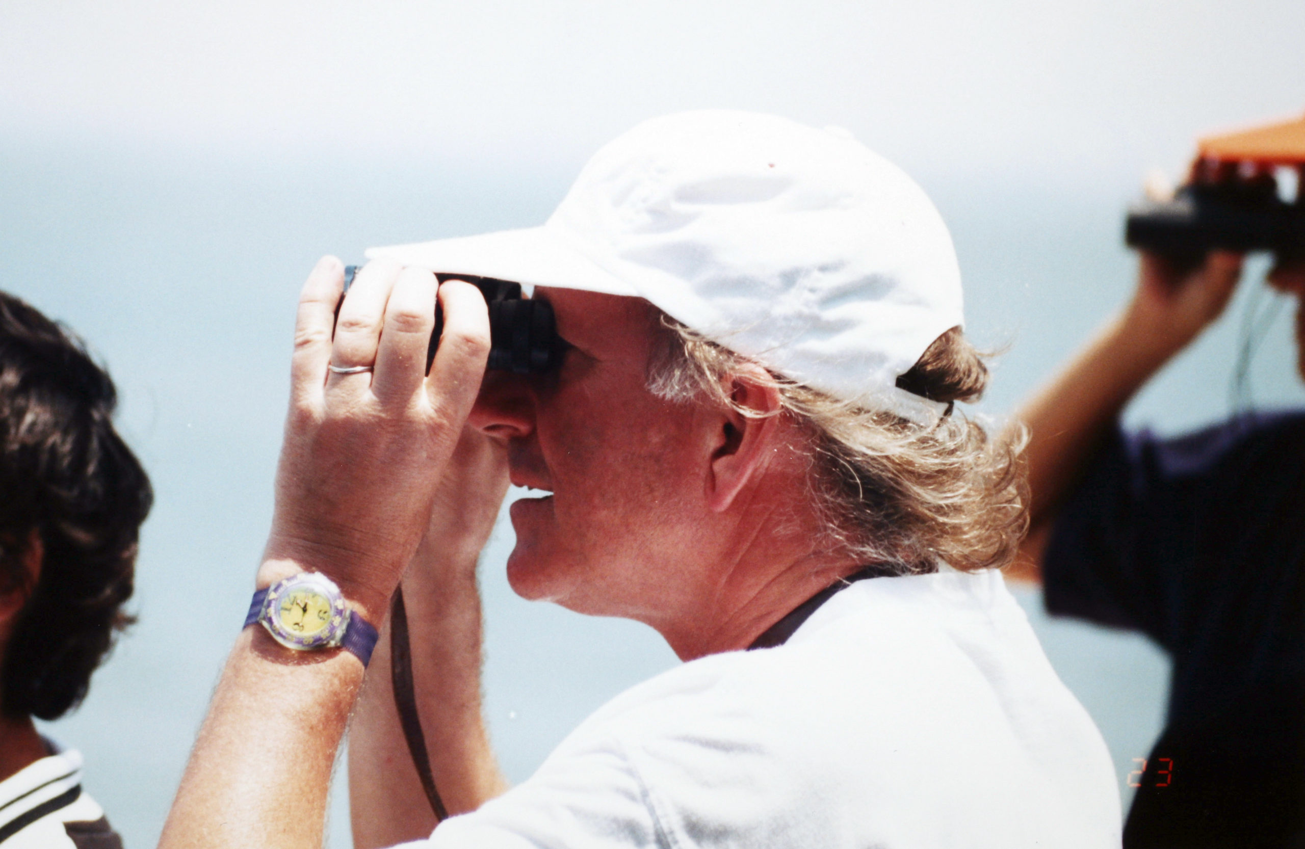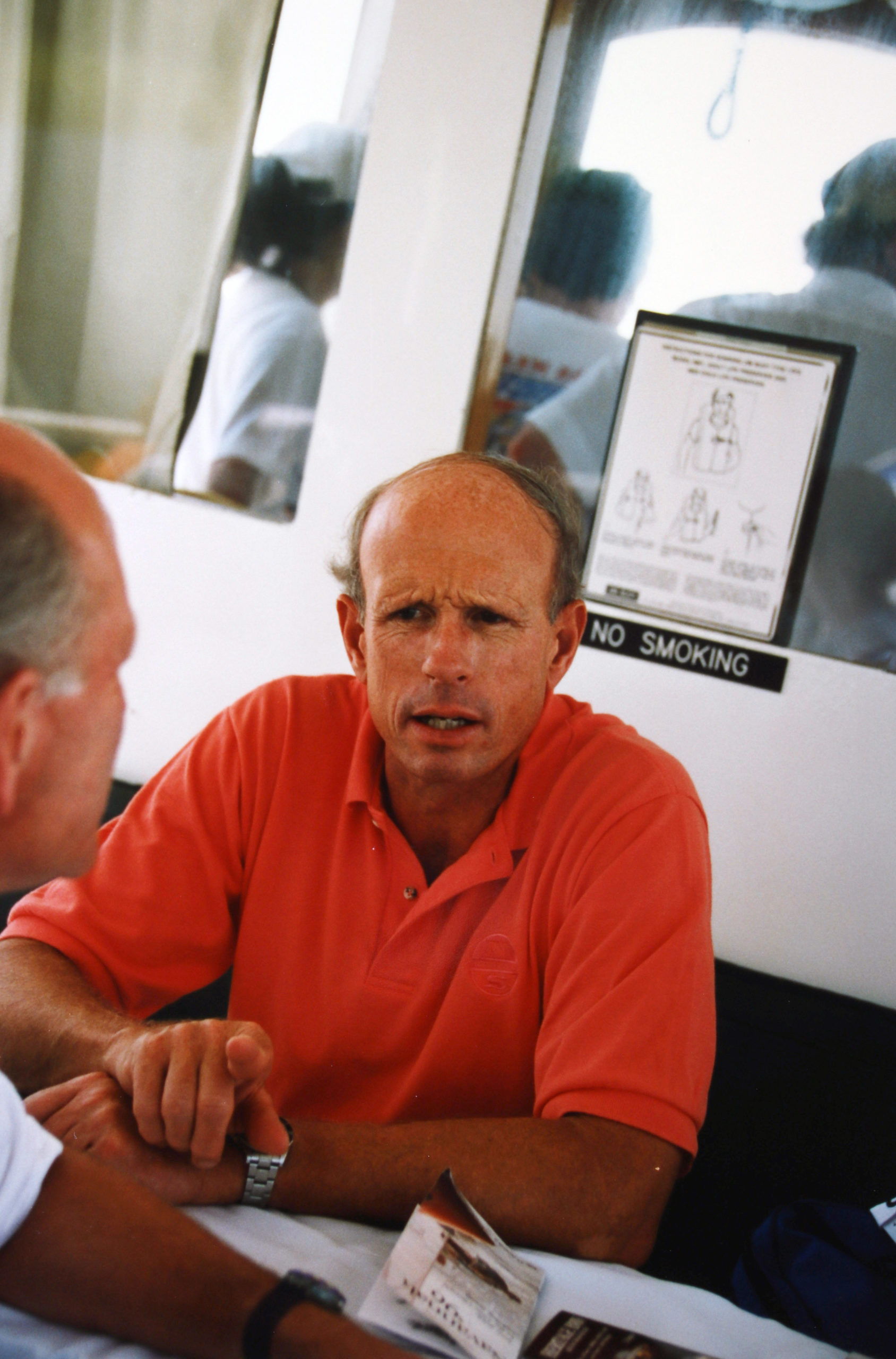 Die Stimmung an Bord ist entspannt: Bruce Kendall aus Neuseeland - Goldmedaillengewinner der Windsurf Wettbewerbe im Jahr 1988 in Busan - im Austausch mit Klaus J. Jacobs .... Michi mit passenden Käppi im Hintergrund