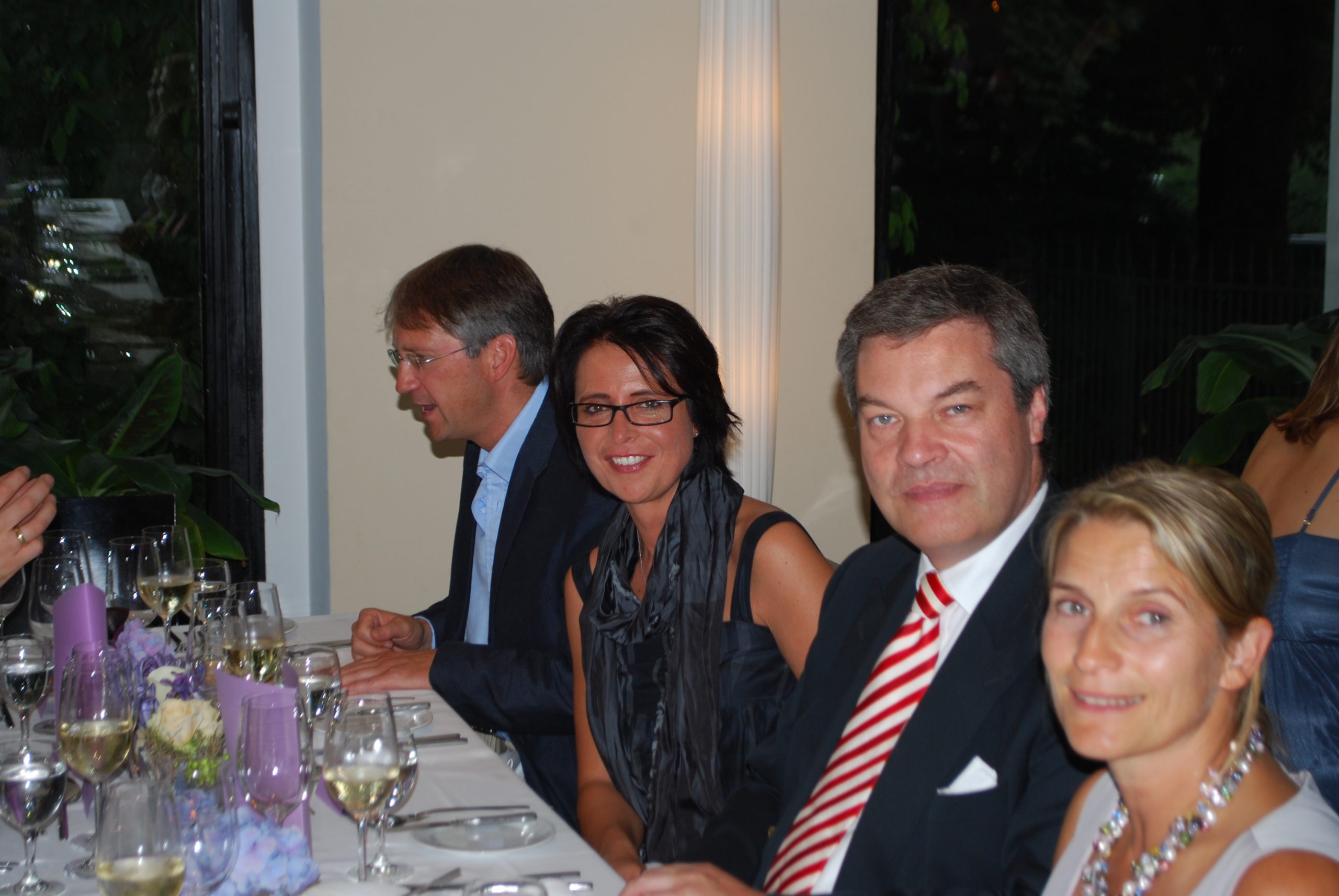 Ende Juni ging es für Annette und mich von München nach Düsseldorf, um dort der Einladung zu Susanne und Mathias Gehrckens Hochzeitsfest zu folgen. Kirchliche Weihen gibt es für die beiden keine mehr, da Mathias bereits einmal in festen Händen war. Dafür empfingen Sie jedoch beste Wünsche von vielen Freunden und der gesamten Familie im wunderbaren Regierungsschlösschen. „Regierungsschlösschen" nennt der Volksmund das herrschaftliche neobarocke Gebäude an der Cecilienallee, das sehr gerne für schöne Events gebucht wird. Ette und ich kennen es bereits von vielen Conde Nast Einladungen im Rahmen der Fashion Week. Antonia und Paulina, die beiden heranwachsenden Töchter von Mathias aus erster Ehe können natürlich schon volle Kanne mitfeiern. Hugo und Henri, die Zwillinge von Susanne und Mathias - sind gerade noch im ersten Lebensjahr - und lassen sich schon sehr gut und brav präsentieren. Einige Freunde kamen wie wir aus dem tiefen Süden, die meisten jedoch aus dem Rheinland und dem hohen Norden, da Mathias ursprünglich aus Hamburg stammt. Am nächsten Tag feierten wir bei herrlichen Wetter noch einen sonnigen Brunch im Golfclub Düsseldorf-Grafenberg e.V., der an der Galopprennbahn und in unmittelbarer Nähe des Hauses der Gehrckens liegt.