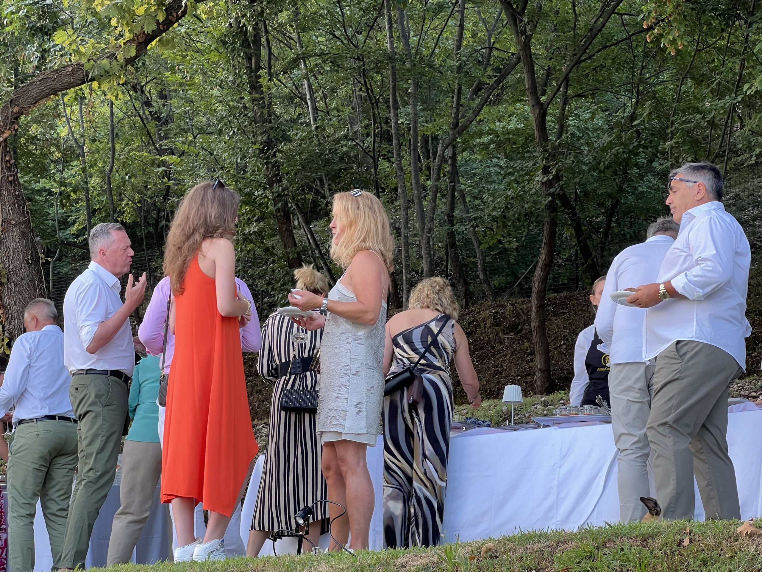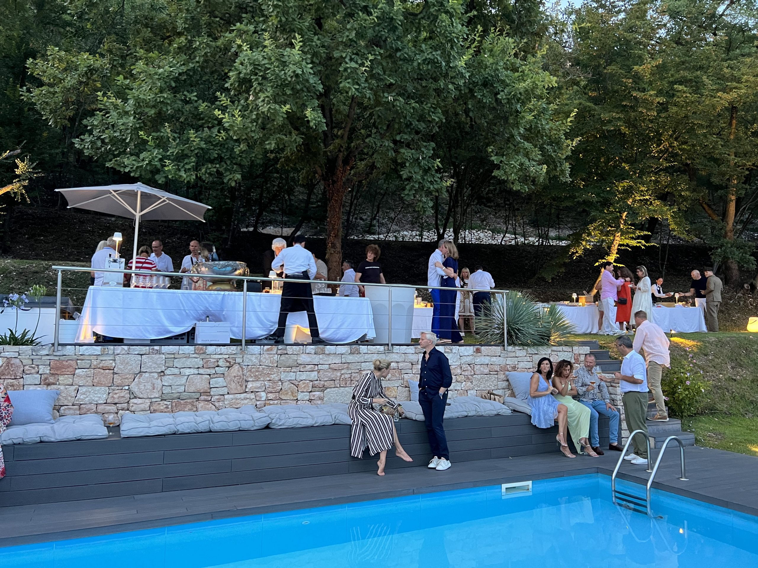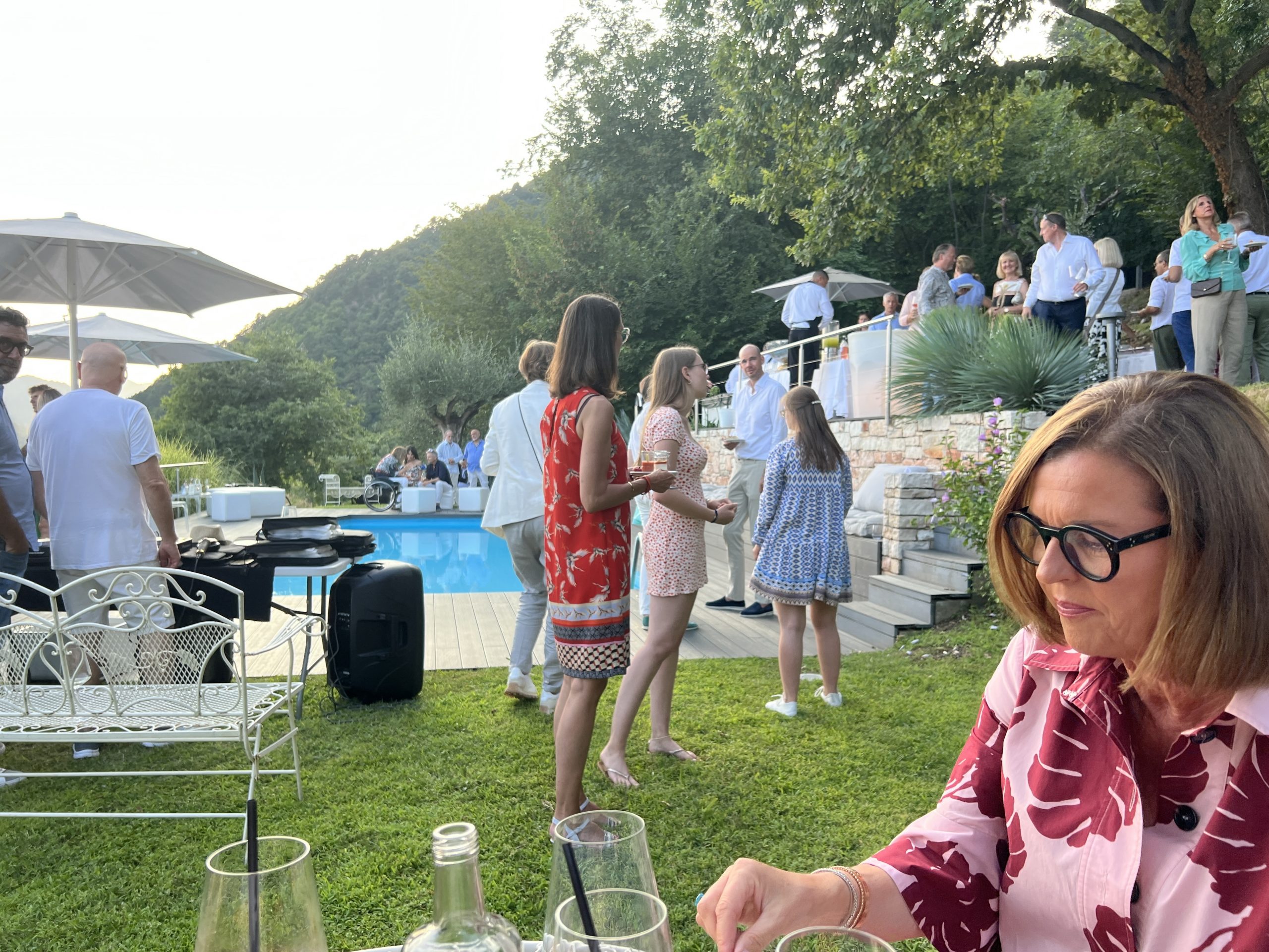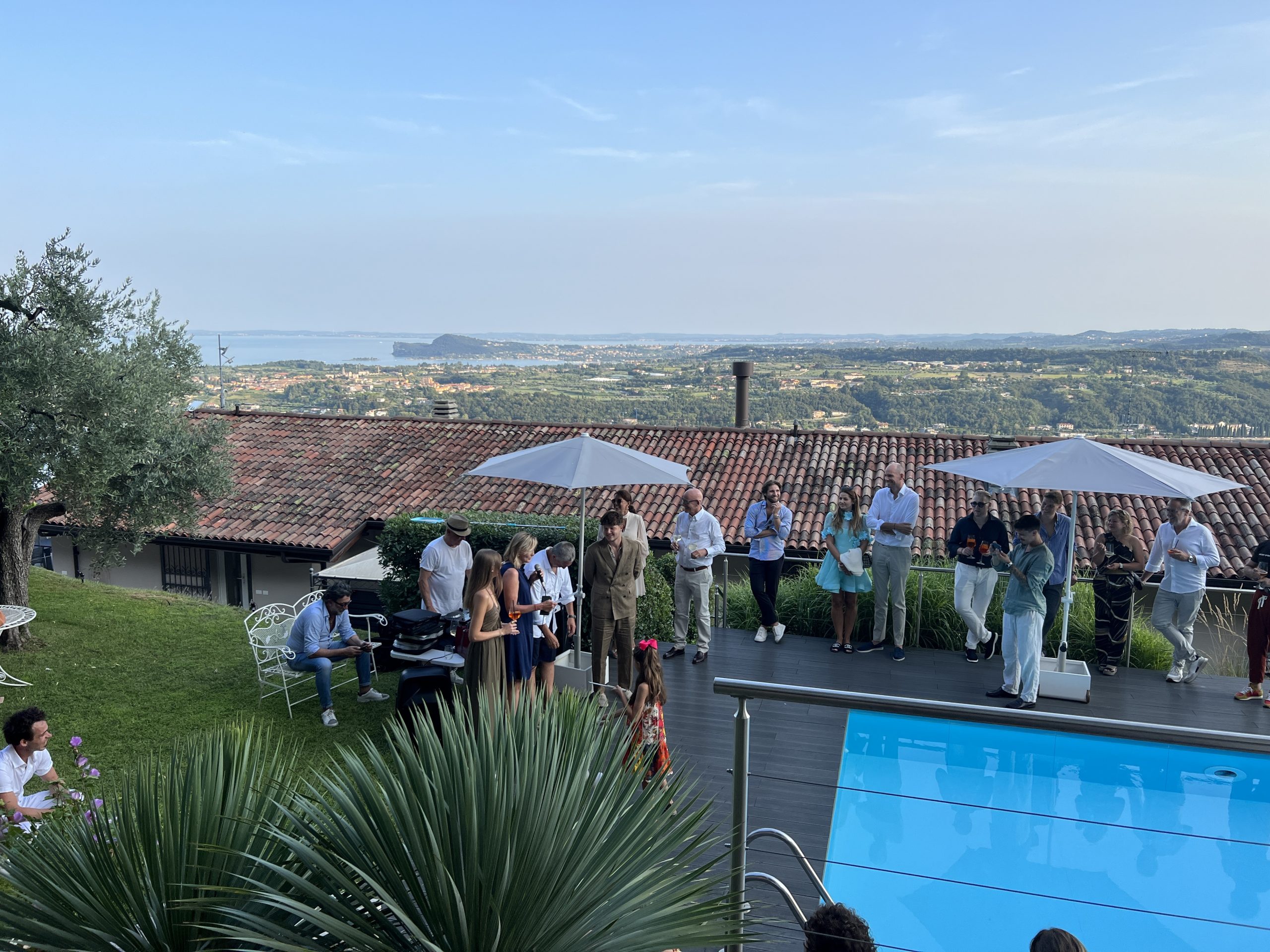 Im Hochsommerlichen Monat Juli stehen nicht nur die runden Geburtstags-Feste von Dony & Giorgio in Cunettone sowie Ruth & Michael in San Felice, sondern auch das Sommerfest von Gabi und Fritz Kozka in Salò im Party Kalender. Kozkas haben zur Feier des Festes in ihr Haus oberhalb von Sanne in der Via San Bartolomeo eingeladen. Anlass der beiden sind die nachträglichen Feiern zum runden 60er von Gaby und dem unrunden 63er von Fritz. Kozkas haben sich vor drei Jahren ein altes Haus oberhalb von meiner Schwägerin Susanne in der Verlängerung der Via Seminario hoch zum Hausberg von Salò - dem San Bartolomeo gekauft und modern umgebaut. Wir feiern daher auch im oberhalb des Hauses gelegenen Garten bzw. am dortigen Pool. Die beiden hatten Wetter technisch Glück, denn an allen Abenden davor und danach gab es jeweils heftige Gewitter mit Regen und Hagel, was hier nicht der Fall war und daher keine Dramen ausgelöst wurden. Die Party war recht amüsant und geprägt von einer sehr bunten Gäste-Mischung aus Arizona über den Gardasee via Garmisch, München bis nach Dresden. Jede Menge Fussballer und Ferrari Eigentümer und finanziell unabhängige sonstige Connaiseure. Fritz war vor mehr als 40 Jahren Vertriebs-Buddy von Michael Plank in gemeinsamen Zeiten bei Sport Bittl in Allach. Nach später folgenden Stationen bei Porsche und eigener unternehmerischer Aktivitäten in der Immobilienbranche in Dresden sind Gaby und Fritz seit einigen Jahren auch am Gardasee gelandet. Hier hat er sich bei Alberto Arcangeli die Aquarama Voom Voom gekauft und ist neben seiner Golfleidenschaft ein absoluter Oldtimer Fachmann und zudem bestens vernetzt. Stefanie Büchele und Michael Weiß - mit dessen Cousine Julia Fritz in erster Ehe verheiratet war - sind mit uns von der Partie und haben übers Wochenende auch bei uns gewohnt. Jasmin und Michi Plank fallen leider aus, da sie drei Tage vor dem Fest mit ihren Girls zum Sommerurlaub nach Florida abgereist sind. Gehrckens, Conrads, Sanne und ihr Buddy Wolfus sind wie Caroline und Helmut Schmidt dagegen gesetzte Größen.