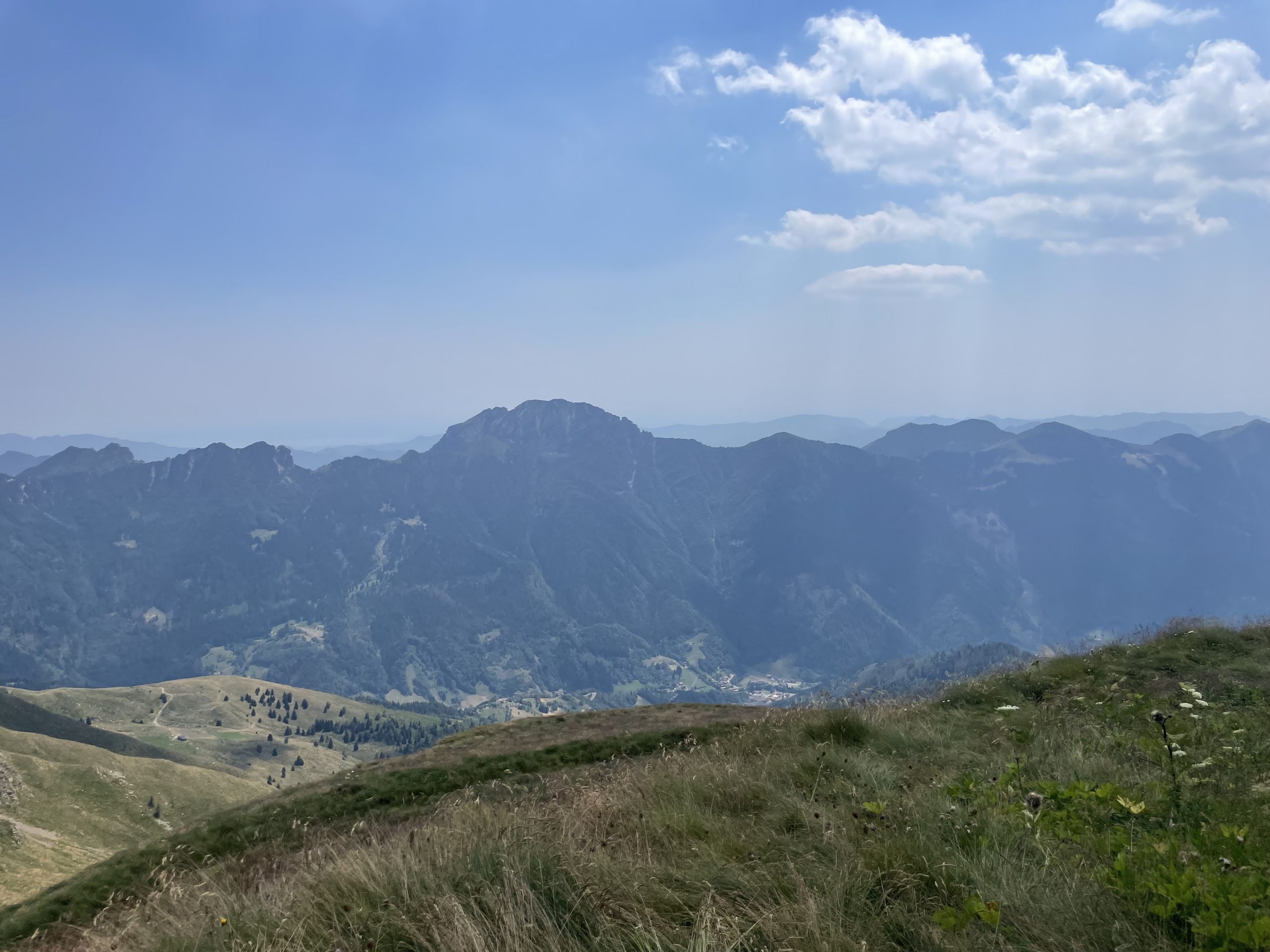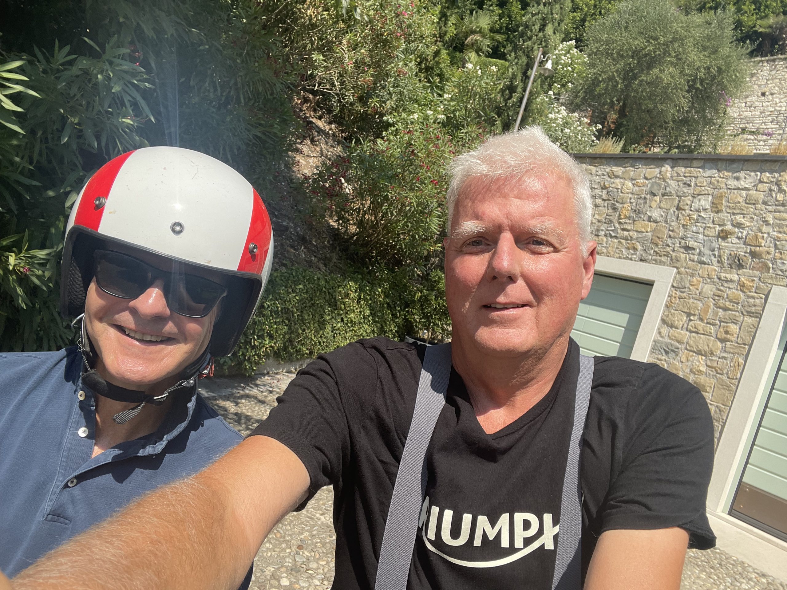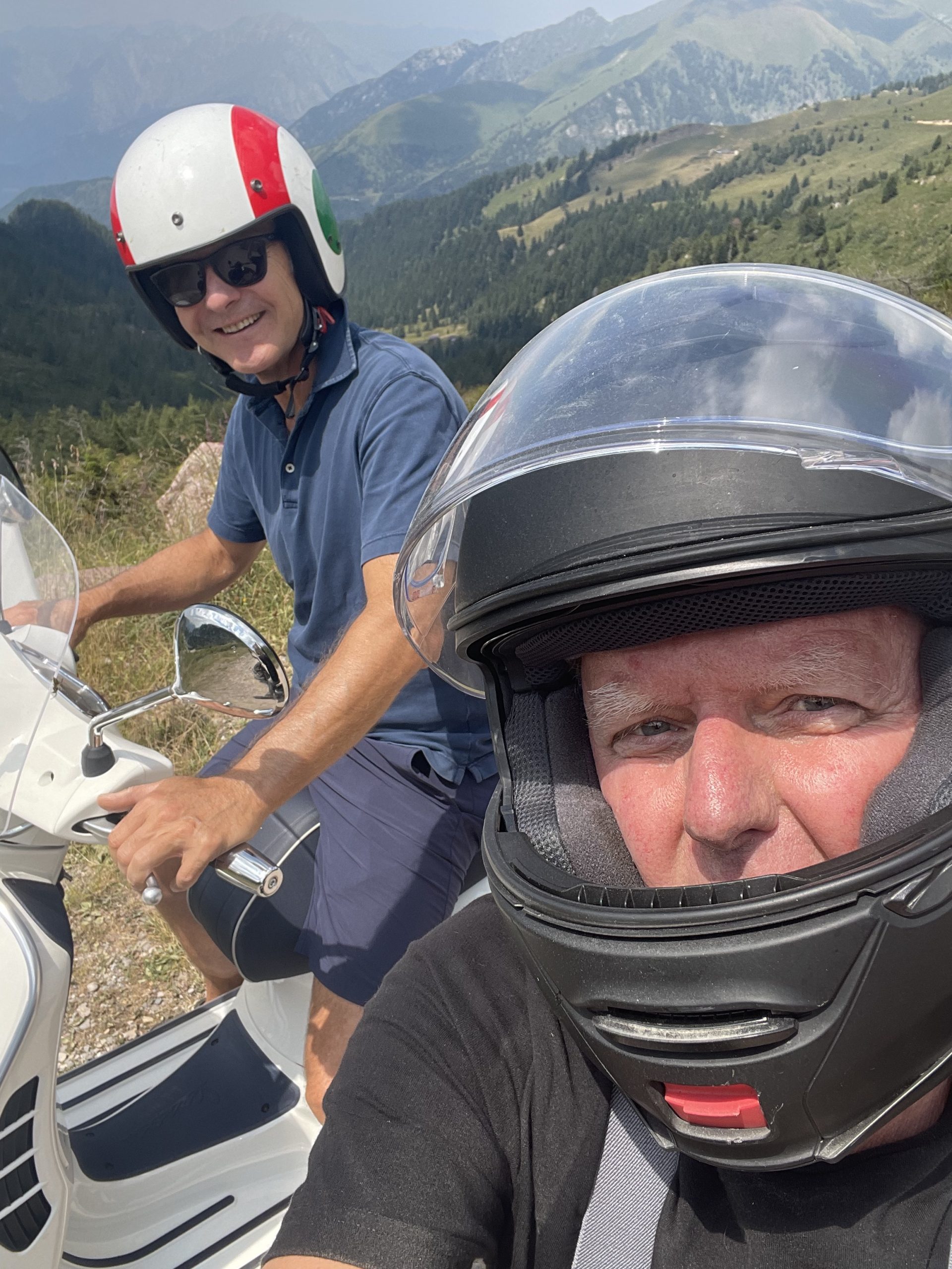 Am Freitag sind sich Werner und ich im Rahmen eines kurzen WhatsApp Chats sehr schnell bezüglich unserer Tagesplanung einig und so starten wir - flexibel wie wir sind - kurz nach unserem kommunikativen Austausch zu einer Motorradtour zum Passo di Croce Domini - dem Kreuz des Herrn. Wir werden in 5 1/2 Stunden Fahrt fast 200 km Strecke mit Werners 350 GTS Vespa und meiner Triumph Bobber durch die landschaftlich traumhaften Brescia Alpen fahren. Den langen Zug der südlichen Kalkalpen, die im Westen schmal beginnen und sich ostwärts allmählich verbreiternd hier den Südrand der Alpen bilden, bezeichnet man als Brescianer Voralpen. Es ist der zwischen Iseosee und Gardasee gelegene Gebirgsabschnitt. Die Brescianer Alpen schließen sich östlich an die sogenannten Bergamasker Alpen an und bilden mit diesen zusammen den als lombardische Alpen bezeichneten Teil der italienischen Alpen. Der Passo di Croce Domini ist ein hier liegender Gebirgspass. Er ist in der Lombardei zwischen dem Idrosee im Südosten und dem Iseosee im Südwesten. Die Passhöhe beträgt 1895 Meter, die Steigung etwa 12 %. Die Straße ist von Breno nach Bagolino durchgehend asphaltiert. Die Wintersperre dauert von November bis Mai. Der höchste Punkt der Strecke ist allerdings nicht der Passo Croce Domini selber, sondern der 1943 Meter hohe Goletto di Cadino, der aus Richtung Idrosee etwa ein Kilometer vorher erreicht wird und beim diesjährigen Giro d´Italia am 16. Tag auch die Königsetappe war. Wie viele andere Pass- und Gebirgsstraßen ist auch diese bei Motorradfahrern wegen ihrer Enge, aber auch wegen ihrer Ausblicke in die Landschaft sehr beliebt. Die fast 50 Kilometer lange Scheitelstrecke über den Pass verbindet Breno mit dem schmucken Örtchen Bagolino und hält dabei jede Menge an Alpen mit Hunderten von Kühen am Wegesrand bereit.