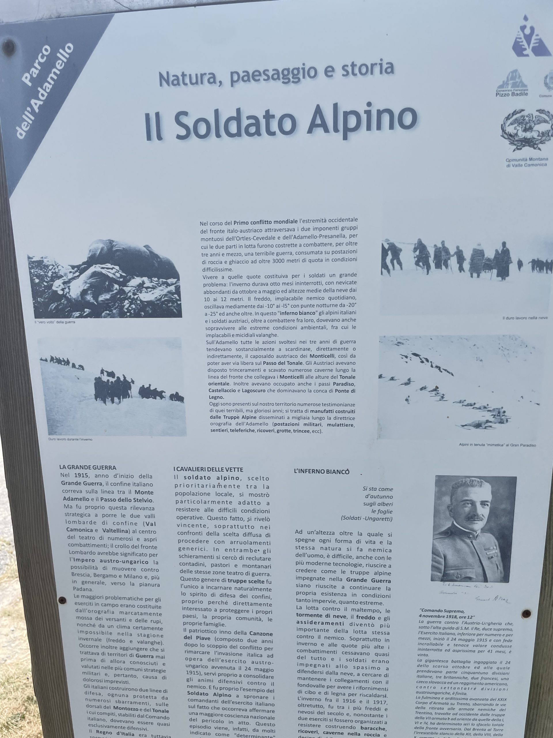 Wir fahren durch das ehemalige Herrschaftsgebiet der Republik Venedig sowie die Territorien, die der Kontrolle des bischöflichen Fürstentums von Trient unterstanden. Grenzgebiete, für die nicht gekämpft wurde, da sie in Gegenden lagen, die arm an Bodenschätzen und zudem lange von Eis und Schnee bedeckt waren. Allein der Passübergang war bereits in früheren Zeiten von Interesse, dank der Möglichkeit, eine Verbindung zwischen dem Val Camonica und den Valli Giudicarie und von da zum Oberen Gardasee herzustellen.