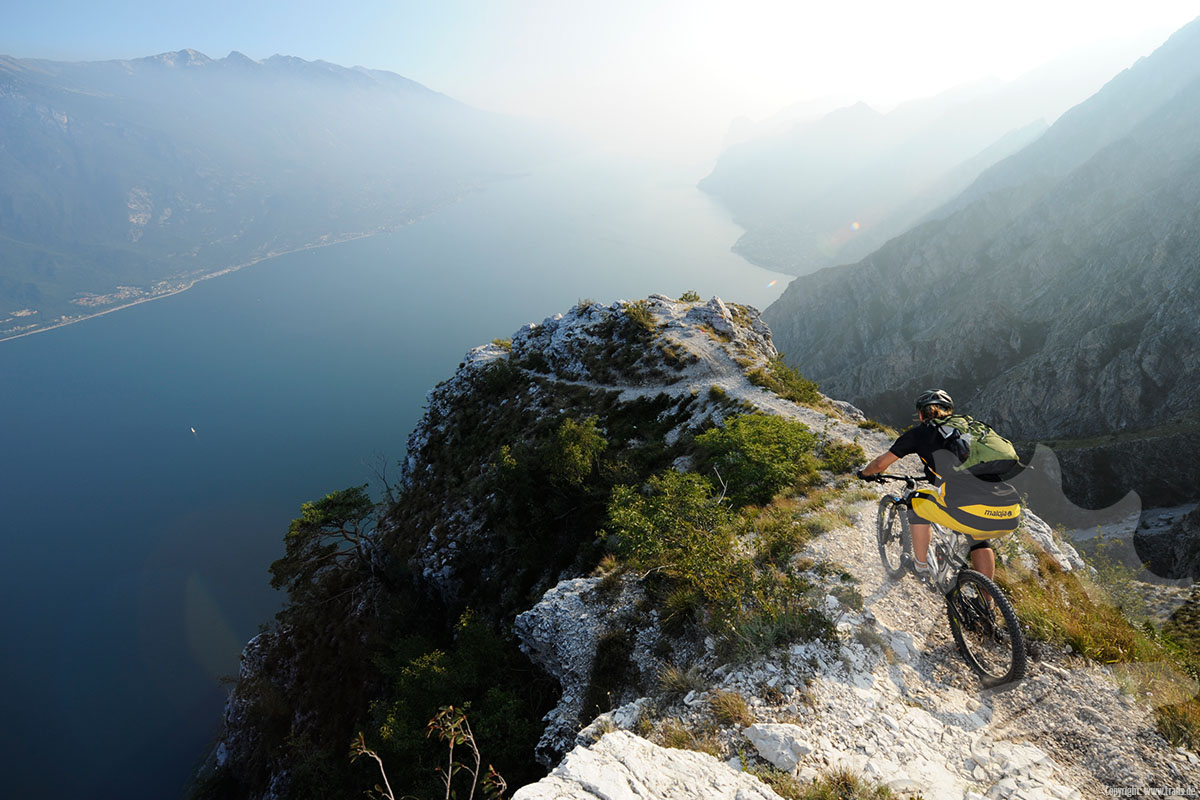 Die Berge rund um Riva am Nordufer sind das Bikeparadies schlechthin. Wer sich nicht gleich Hardcore-Trails antun will, für den ist zur Einstimmung die Tour von Riva am Westufer nach Pregasina perfekt. Wenn es mal etwas rasanter sein darf: Downhill auf dem Mountainbike – die Fahrer werden wohl kaum die Aussicht auf den Gardasee genießen können Sanft steigt der schmale Weg in der steilen Felswand bergauf und eröffnet sensationelle Ausblicke auf den See. Das letzte Stück bis zum kleinen Bergdorf Pregasina führt auf einer kurvigen Asphaltstraße. Am Ziel kann man sich beim Cappuccino ja überlegen, ob es noch ein paar Höhenmeter mehr sein sollen. Die Strecke beträgt zwölf Kilometer, dabei sind 450 Höhenmeter zu überwinden.