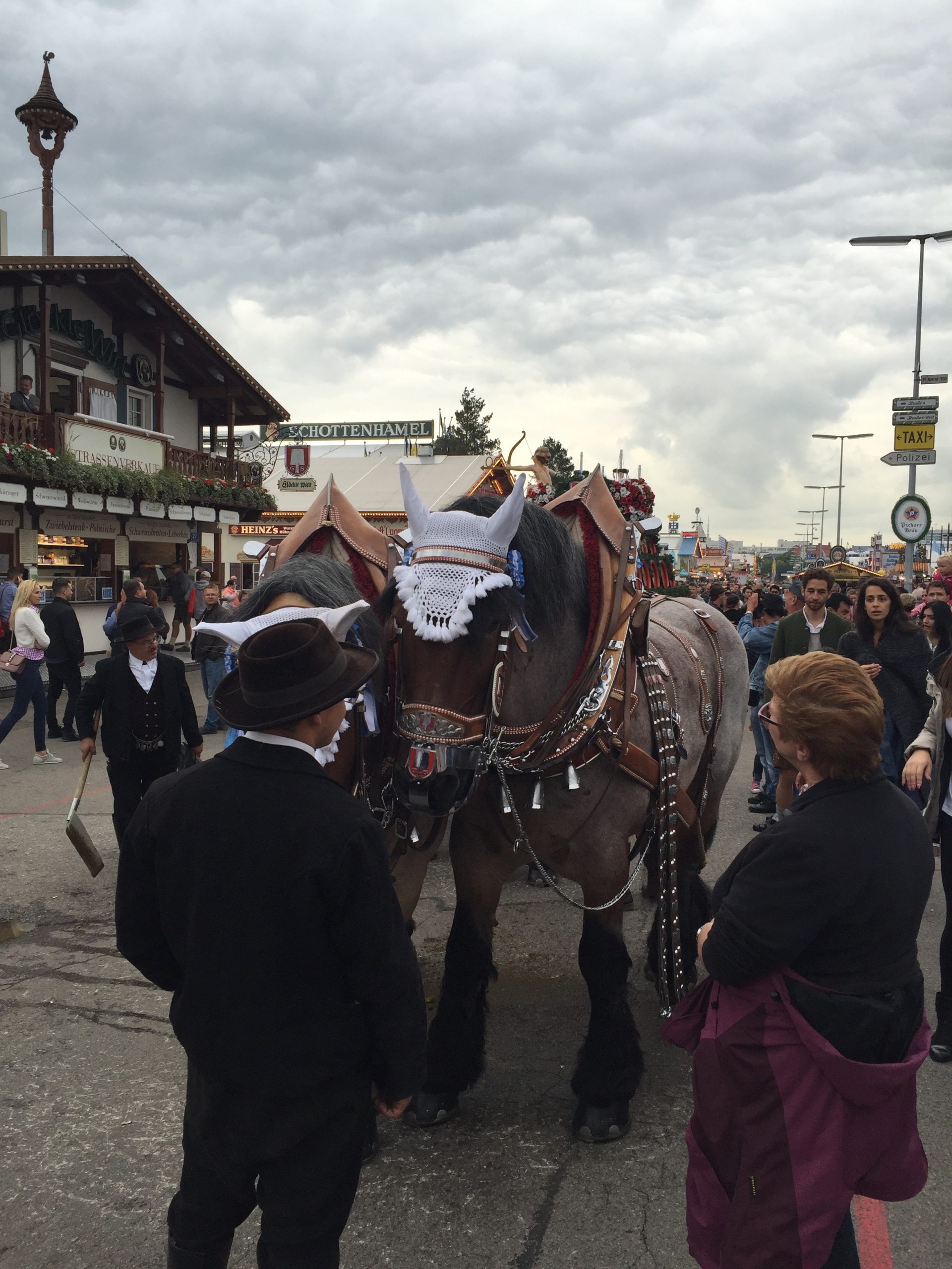 Auf meinem Hinweg bleibe ich bei den beeindruckenden Pferdefuhrwerken stehen, die früher das Bier zu den Zelten lieferten