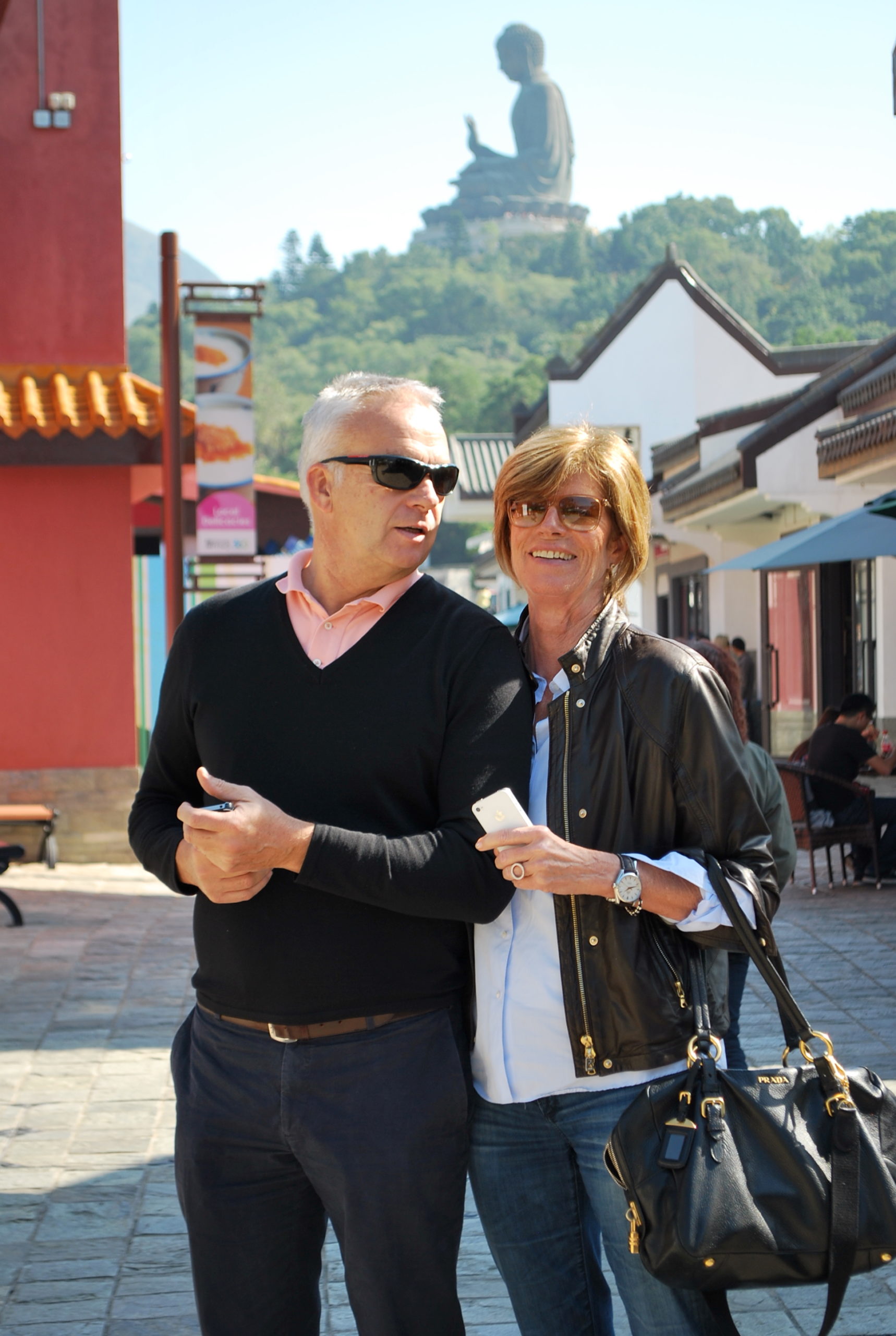 Thomas und Eva sind immer noch sehr beeindruckt vom Anblick der 34 Meter hohen Big Buddha Statue auf Lantau Island.