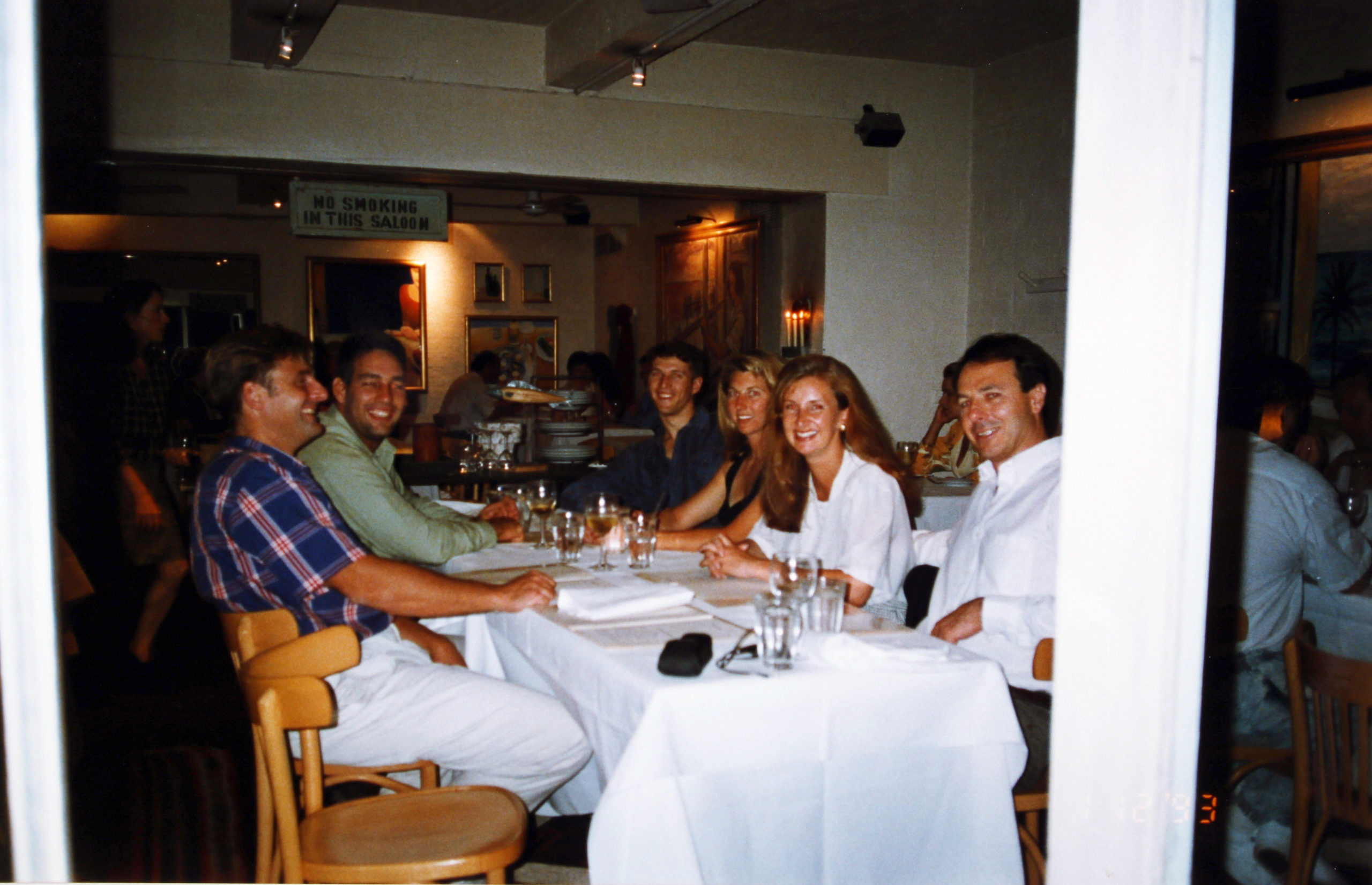 Eine sonnenverwöhnte, lockere und lustige Runde ... links hinter Michi sitzt unser Segeldesigner Kai Hopf. Vorne rechts ist Greg Johns und seine reizende Freundin, links neben Ihr die Gattin von Kai und ganz hinten Adam Quinn